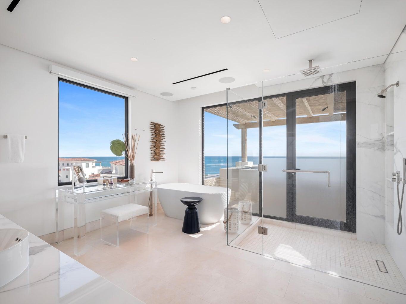 The upper-level primary suite provides exceptional privacy, featuring panoramic ocean views, a spa-style bath, and a private plunge pool. Three additional guest suites on the main level offer comfort and seclusion for family and guests.