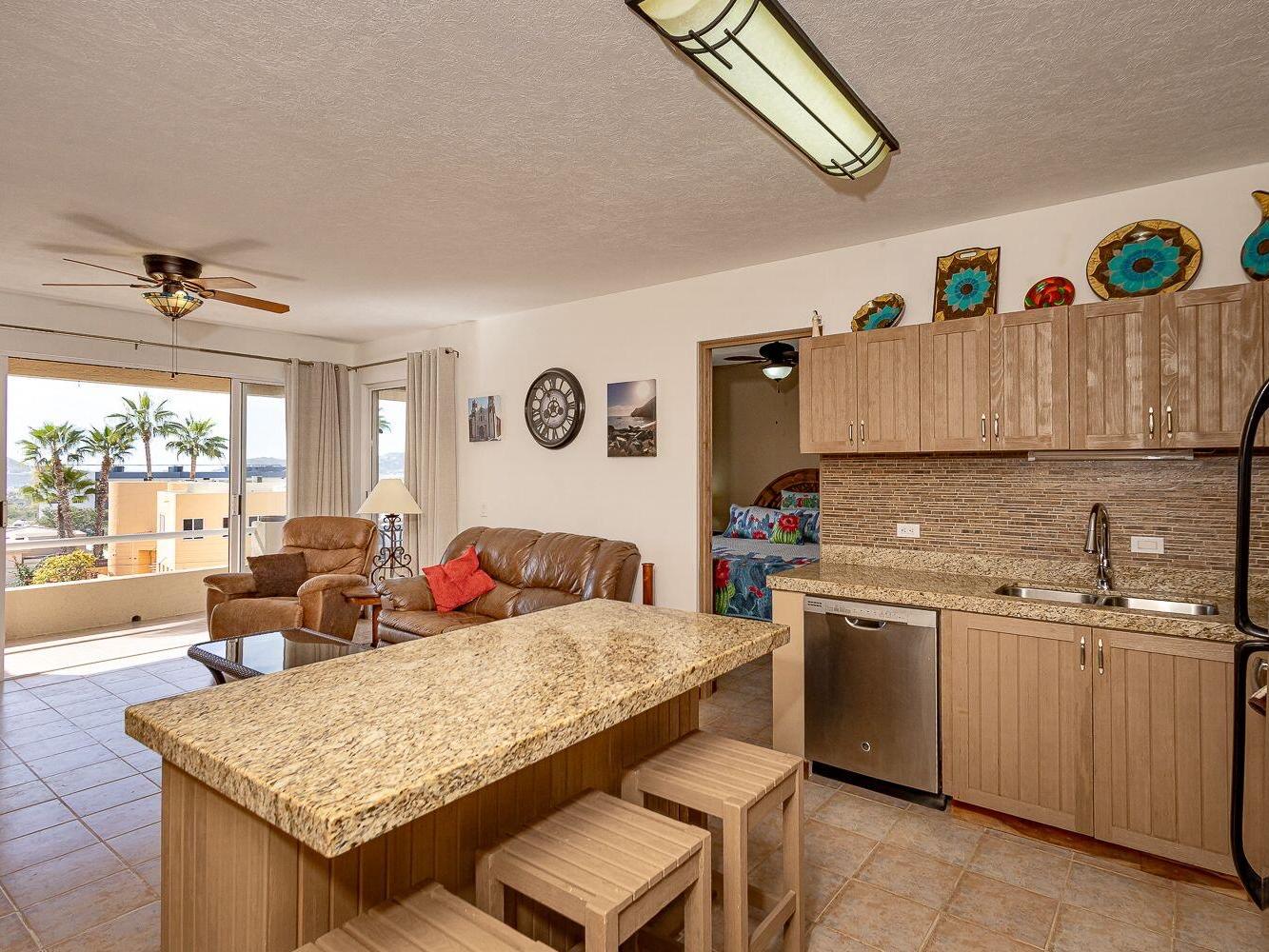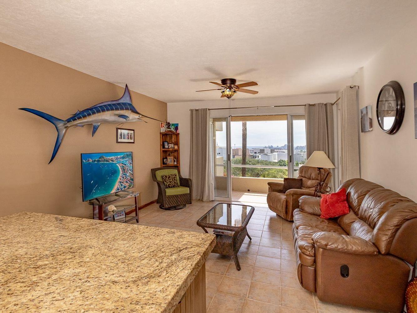 The condo is sold fully furnished and turnkey, making it move-in ready. The kitchen features durable granite countertops, and the open living area leads to a good-sized private terrace with clear ocean views. A standout feature of this property is the included garage, providing secure parking and additional storage which is a significant value-add for the area.