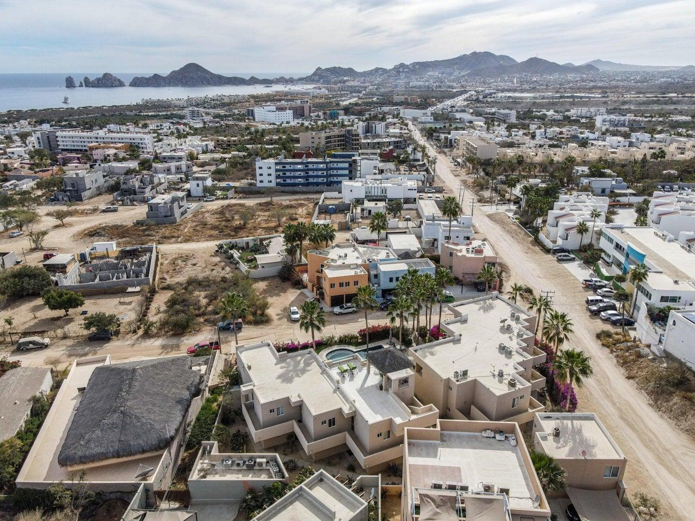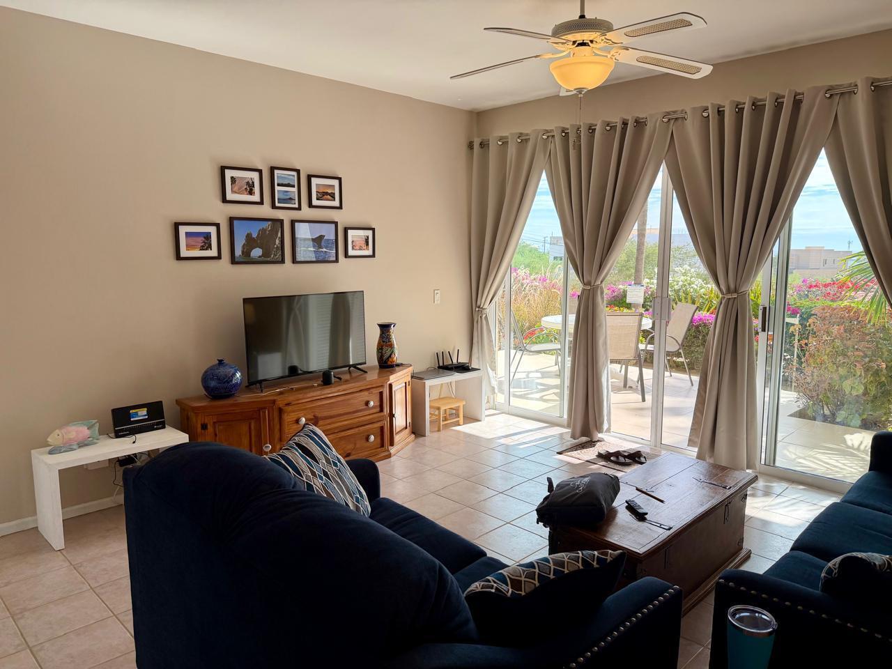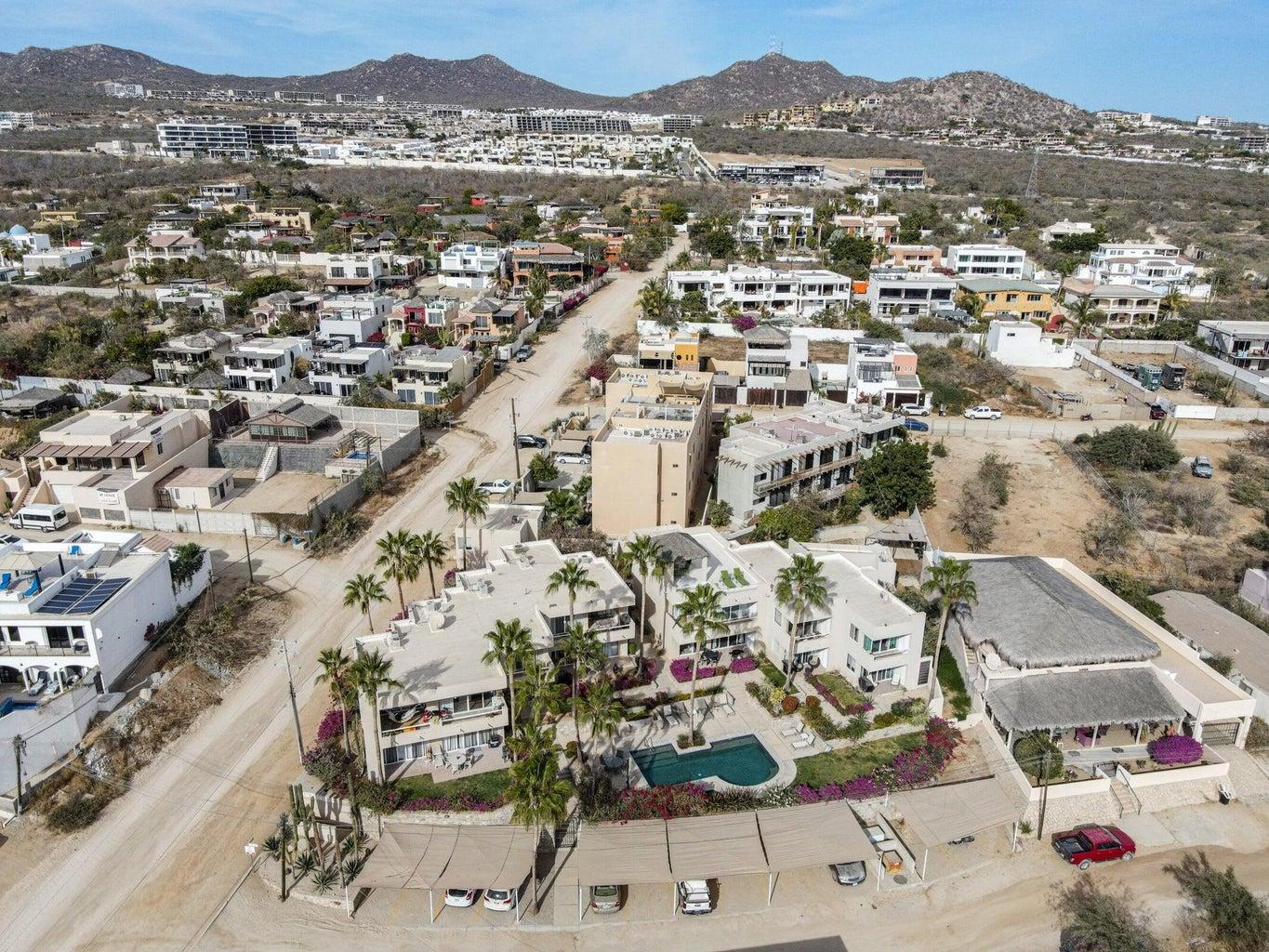 Bright, spacious 2-bed, 2-bath condo, freshly updated with paint, updated cabinets, and quartz countertops. This stylish, move-in-ready home features a private patio just steps from a beautifully landscaped pool, plus access to the shared rooftop terrace with sweeping ocean views. Located in a gated, secure, low-density complex just a six-minute ride to downtown Cabo, it blends comfort, convenience, and a touch of North American style. Ideal as a personal retreat or Airbnb-ready, offering the ultimate Cabo lifestyle