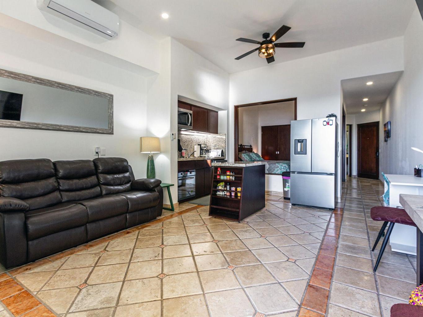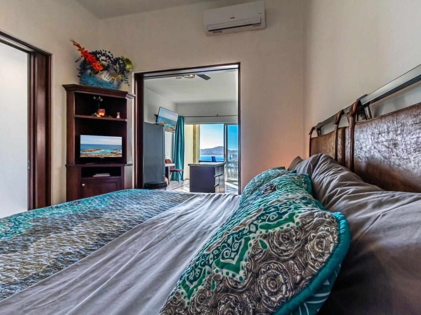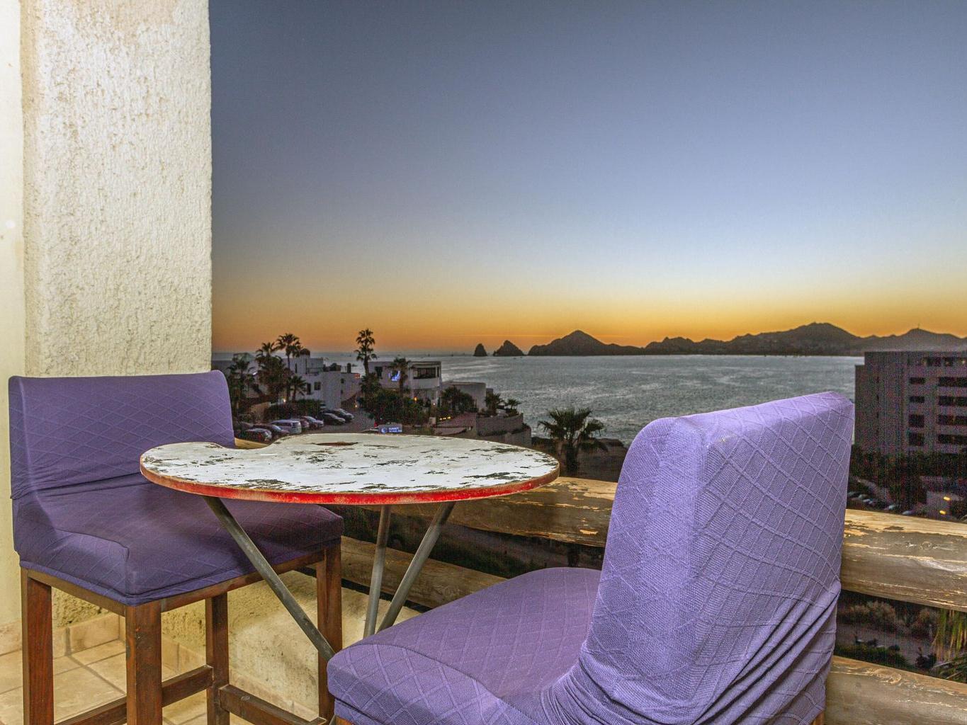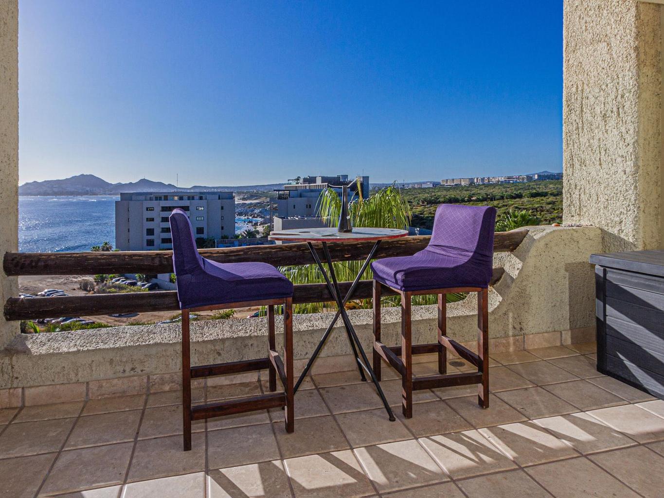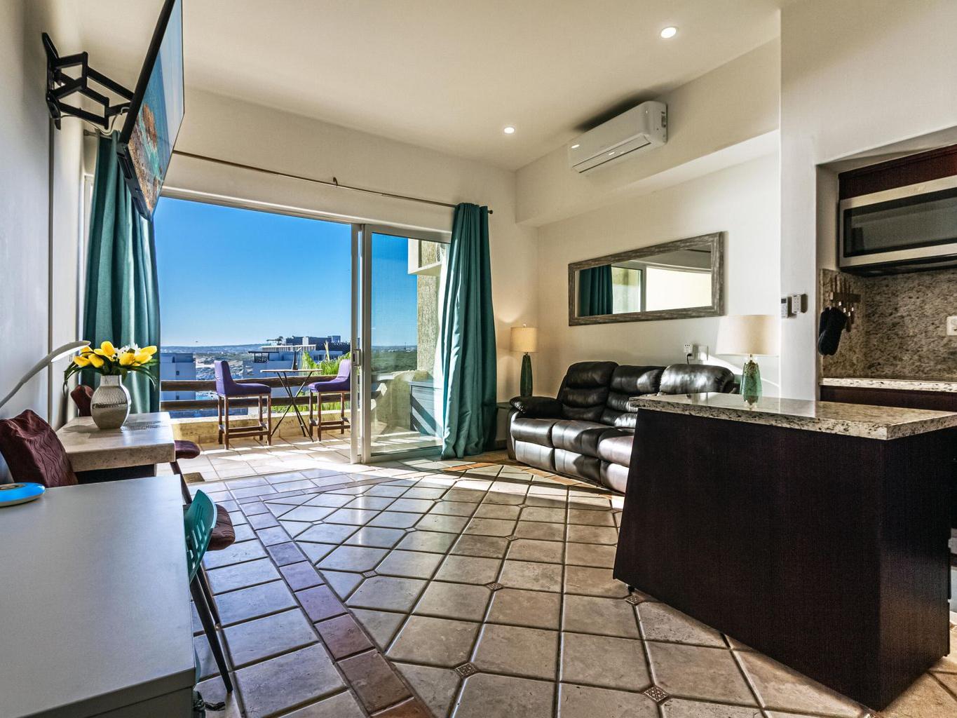 This one-bedroom condo offers ocean and sunset views over the Sea of Cortez, with views toward the Monuments surf break and nearby access to Cabo Bello swimming and snorkeling beach. The open-concept layout features a comfortable living area that opens to a private terrace, ideal for morning coffee or evening relaxation. Residents enjoy resort-style amenities including a swimming pool with swim-up bar and restaurant, landscaped common areas, and convenient parking. Centrally located near beaches, restaurants, shopping, and downtown Cabo San Lucas, this property is well suited for full-time living, a vacation retreat, or rental use, offering an enjoyable Cabo lifestyle with ocean views, surfing, and walkable convenience.