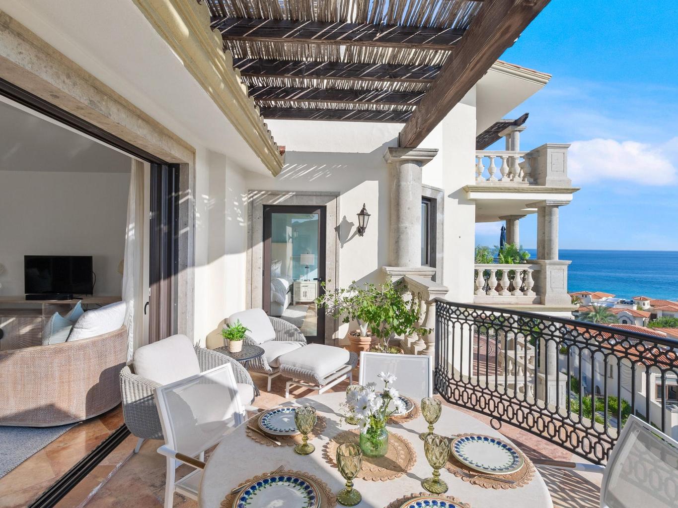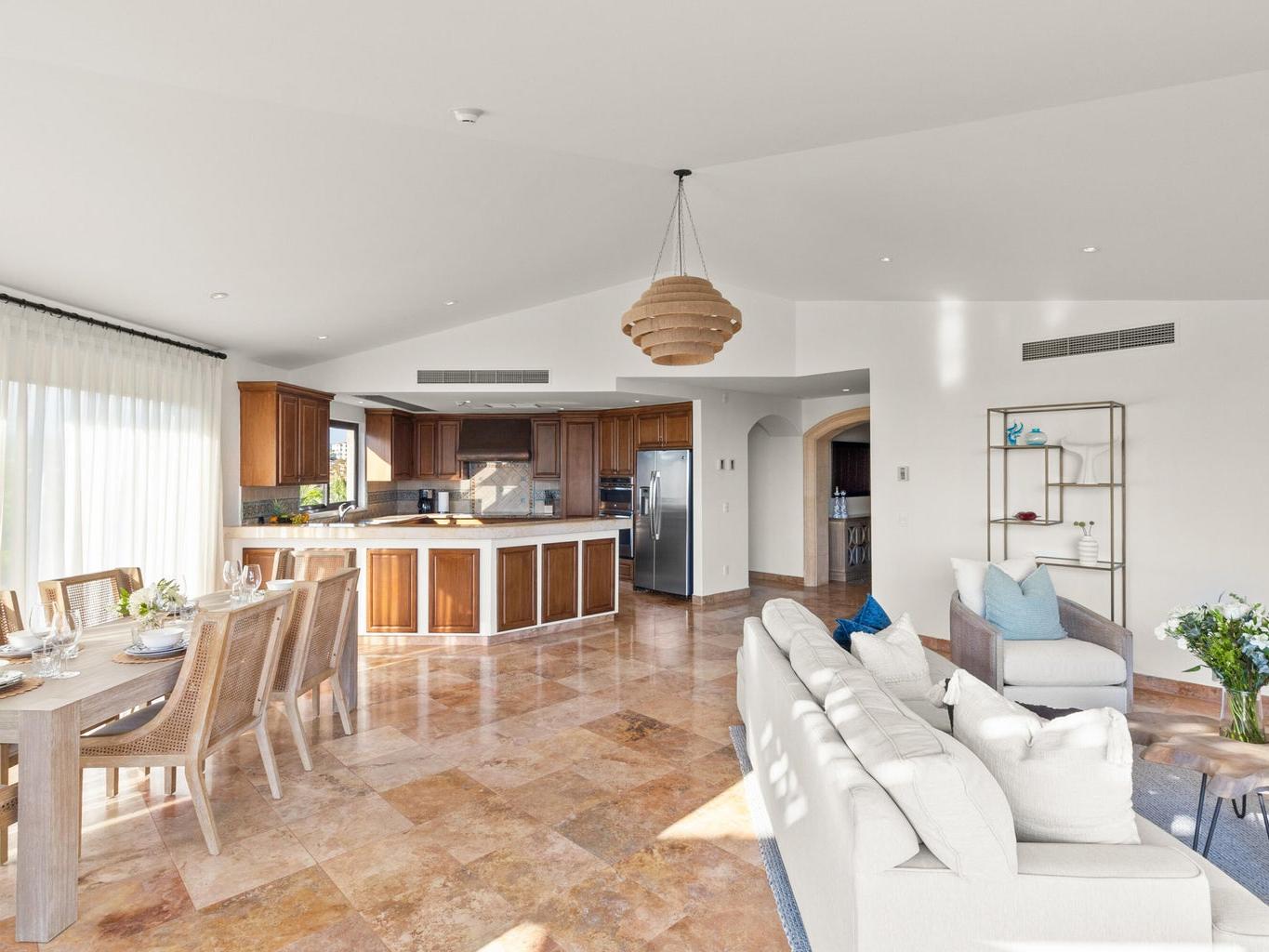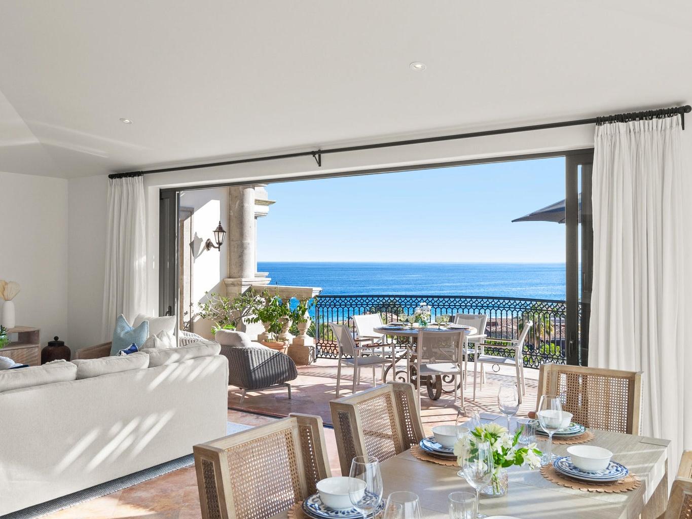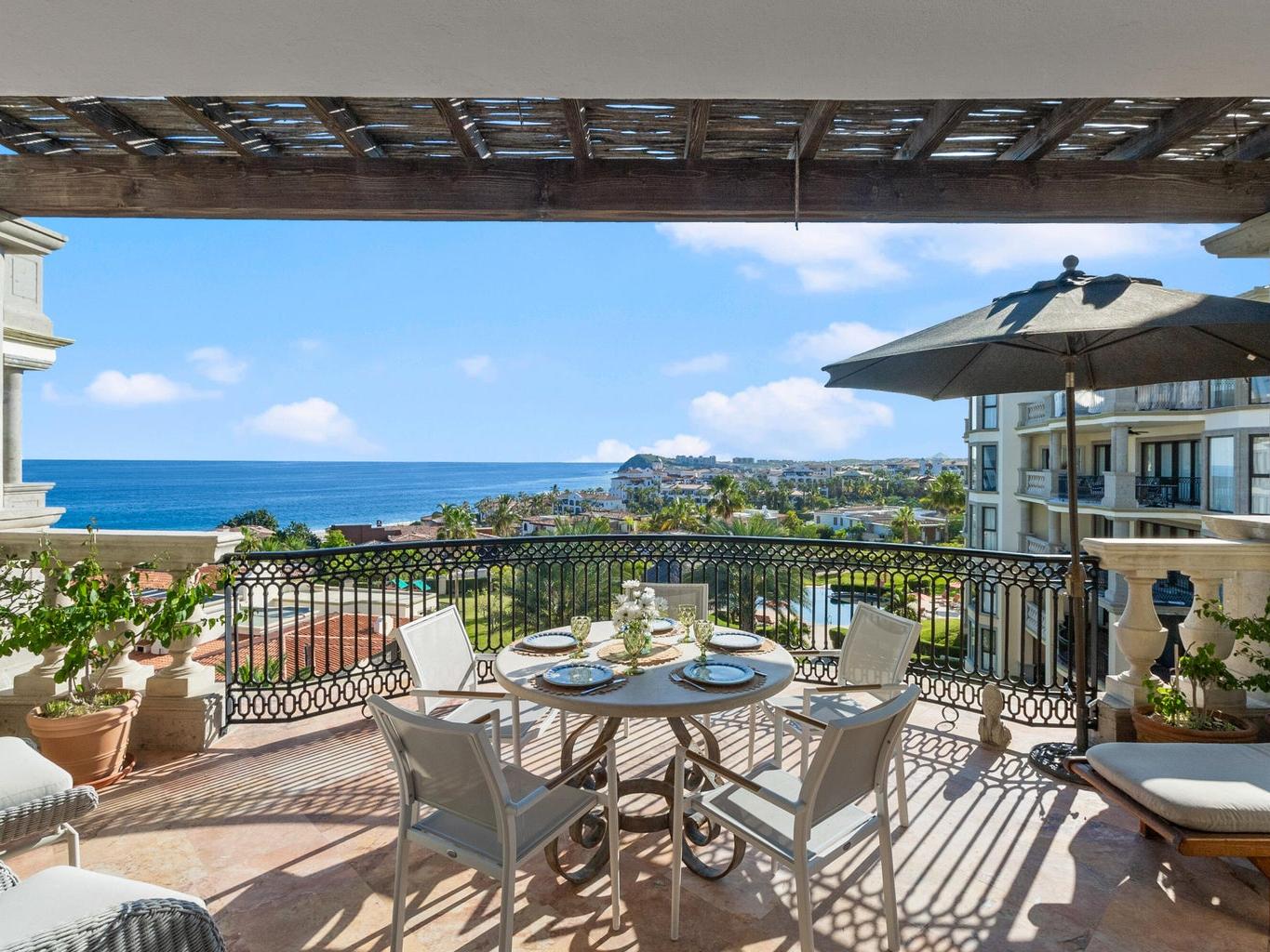 Elegant two-bedroom penthouse with breathtaking views of the ocean, golf course, and pools, located on the top floor of the left wing of the building in the prestigious Cabo del Sol community. Its unique, non-traditional layout provides the feeling of a private home rather than a typical condo, with high ceilings, smart distribution, and generous spaces. Upon entry, a wide foyer leads to the primary suite on the left, and to the right, you'll find the guest bedroom, guest bathroom and laundry area