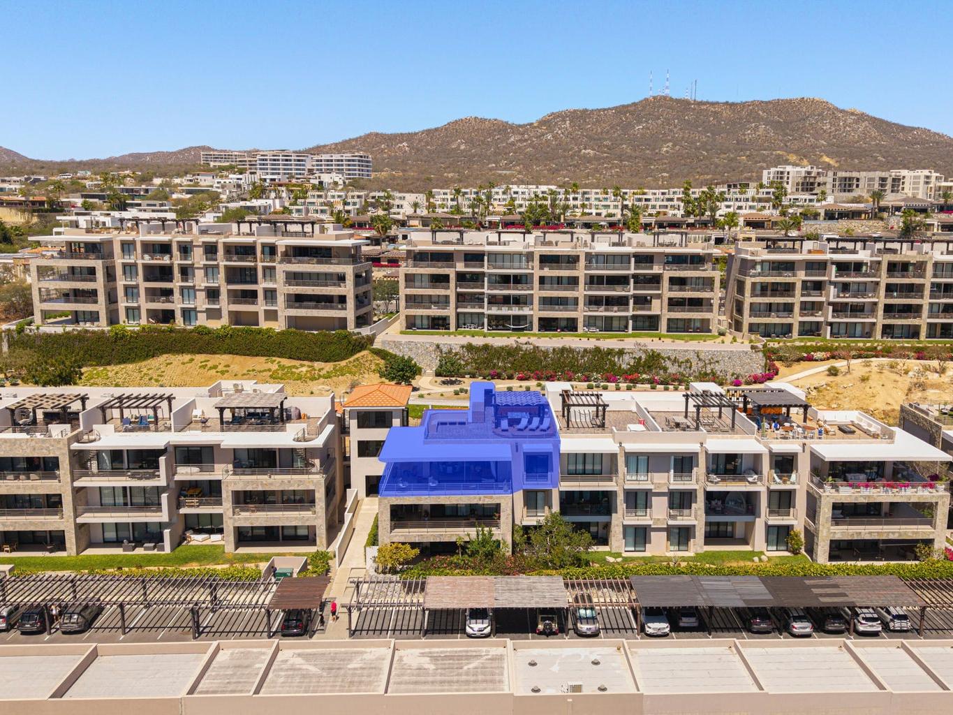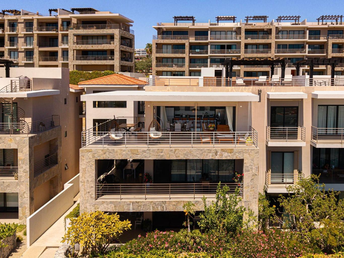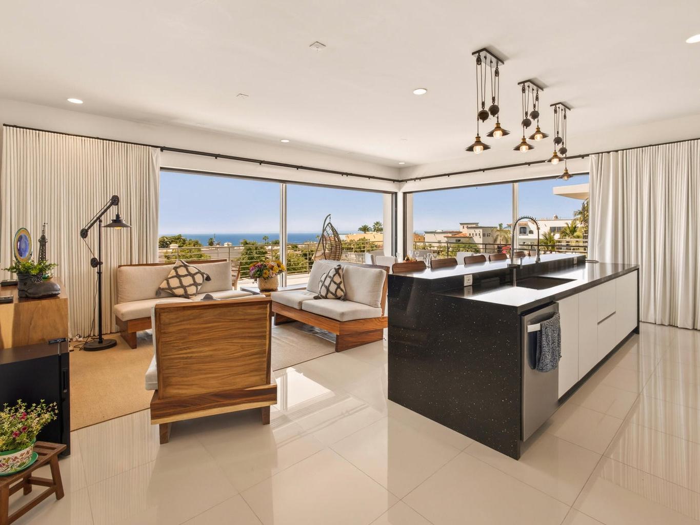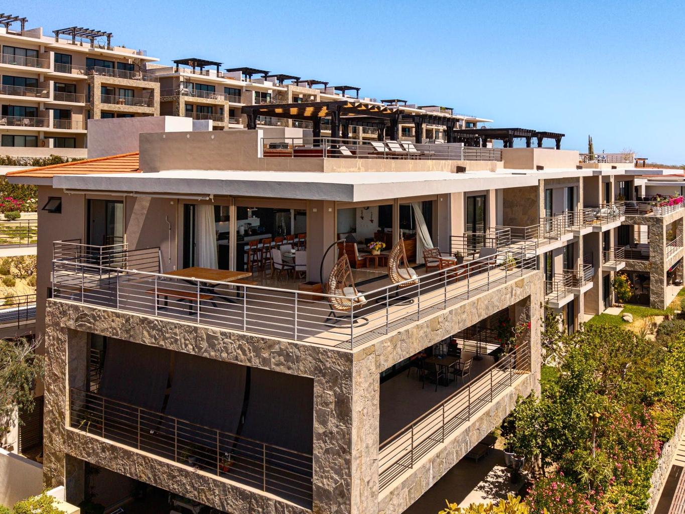 Perched atop Tramonti, this exceptional 3BR | 4BA penthouse showcases the best floorplan in the community, designed for seamless luxury living. A rare 270° open-concept layout floods the residence with natural light, highlighting panoramic ocean views and iconic vistas of Land's End from both the living area and primary suite. Expansive terraces blur indoor-outdoor living, perfect for elevated entertaining. Enjoy direct interior access to your private rooftop oasis with jacuzzi, lounge, and BBQ. Owners also enjoy exclusive access to Quivira's world-class amenities, including golf, beach club, and resort privileges--elevating this residence into a true Cabo lifestyle investment.