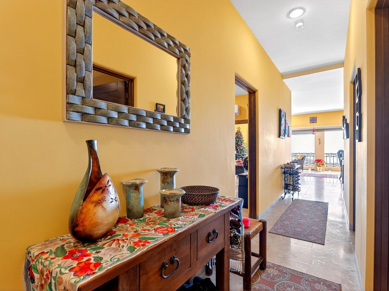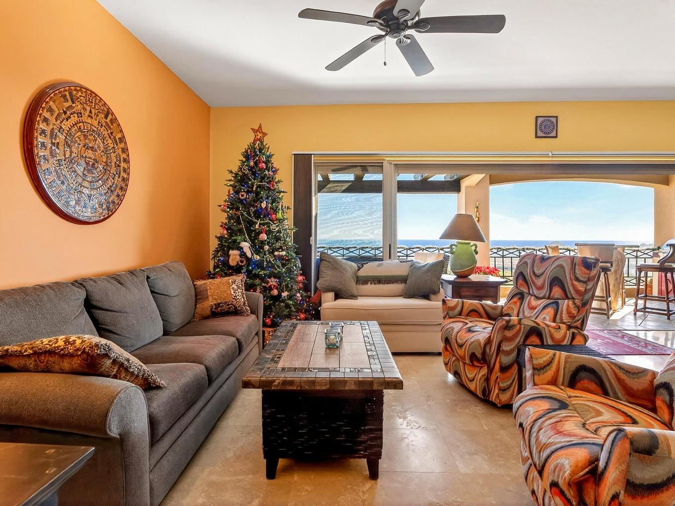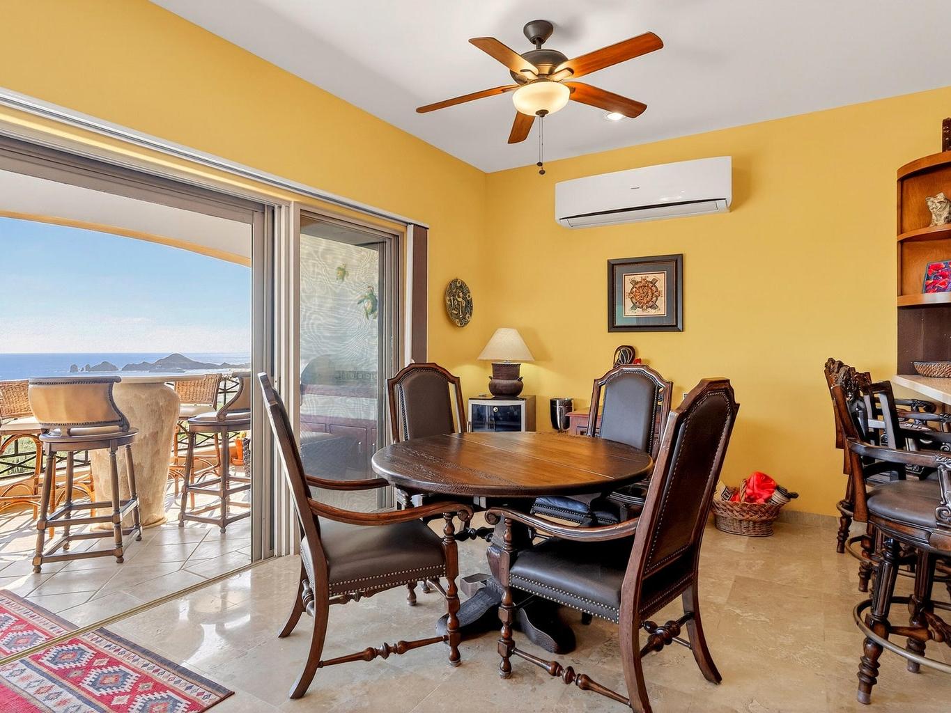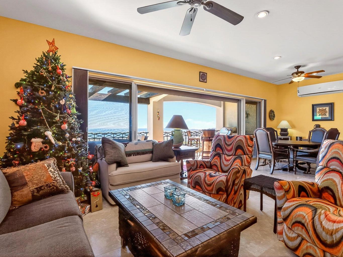 Amazing Turn Key Penthouse with Breathtaking Ocean Views! This 2 bedroom, 2 bathroom, 1,450 sqft condo in Ventanas Phase 3B faces the Cabo San Lucas Bay straight on, allowing for the most incredible city and sunset views. Offered with a huge 2 car underground parking area that can easily be converted into a garage, it comes with a custom made metal storage. Other amazing features included are: outdoor BBQ setup with sink and antirust light metal cabinets, automated hurricane shutters, water purification-filtration system, travertine marble flooring sinks and showers, double thick cabinets in kitchen, quartz counter tops and backsplash, queen and single hide a bed sofas and more. The community amenities include a pool, poolside social area, tennis court, walking trail, kid´s playground....