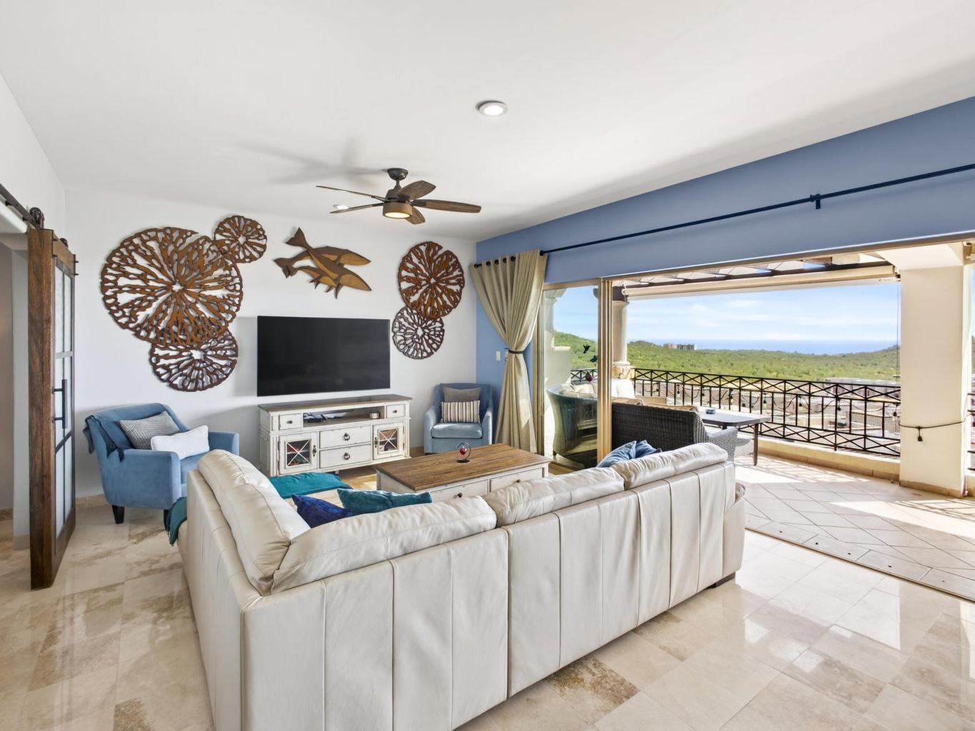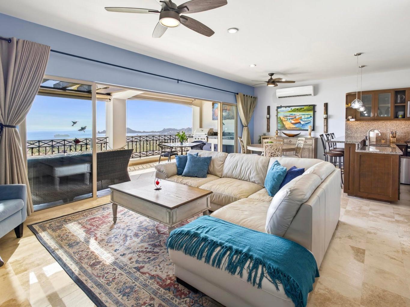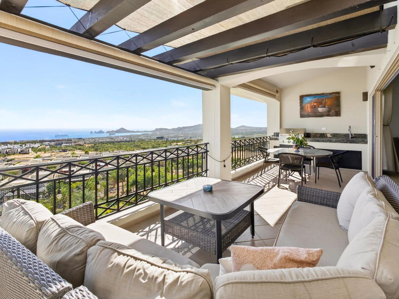 This fully furnished 2BD/2BA, gem offers 1,445 sqft of refined interiors and a 277 sqft terrace with an outdoor kitchen and built-in BBQ—perfect for soaking in unobstructed views of Land's End, the Sea of Cortez, and Cabo's cityscape. Thoughtful upgrades include a RVO water purification system and custom finishes throughout. Enjoy mesmerizing views from the kitchen, living room, bedroom, and even your shower. A rare oversized 2-car private garage is included, and for an additional $35k USD, you can own a 2018 Jeep Wrangler Unlimited Sahara & a 2018 Polaris RZR XP 1000 EPS. Located in coveted El Tezal, Ventanas 3B offers 24/7 gated security, elevator access, tennis courts, pool, track & field, kids' playground, and a fire pit lounge—just minutes from beaches, downtown, and top dining.