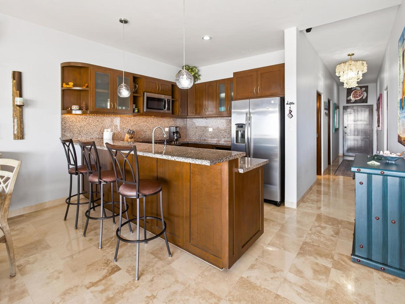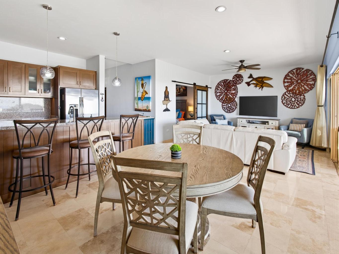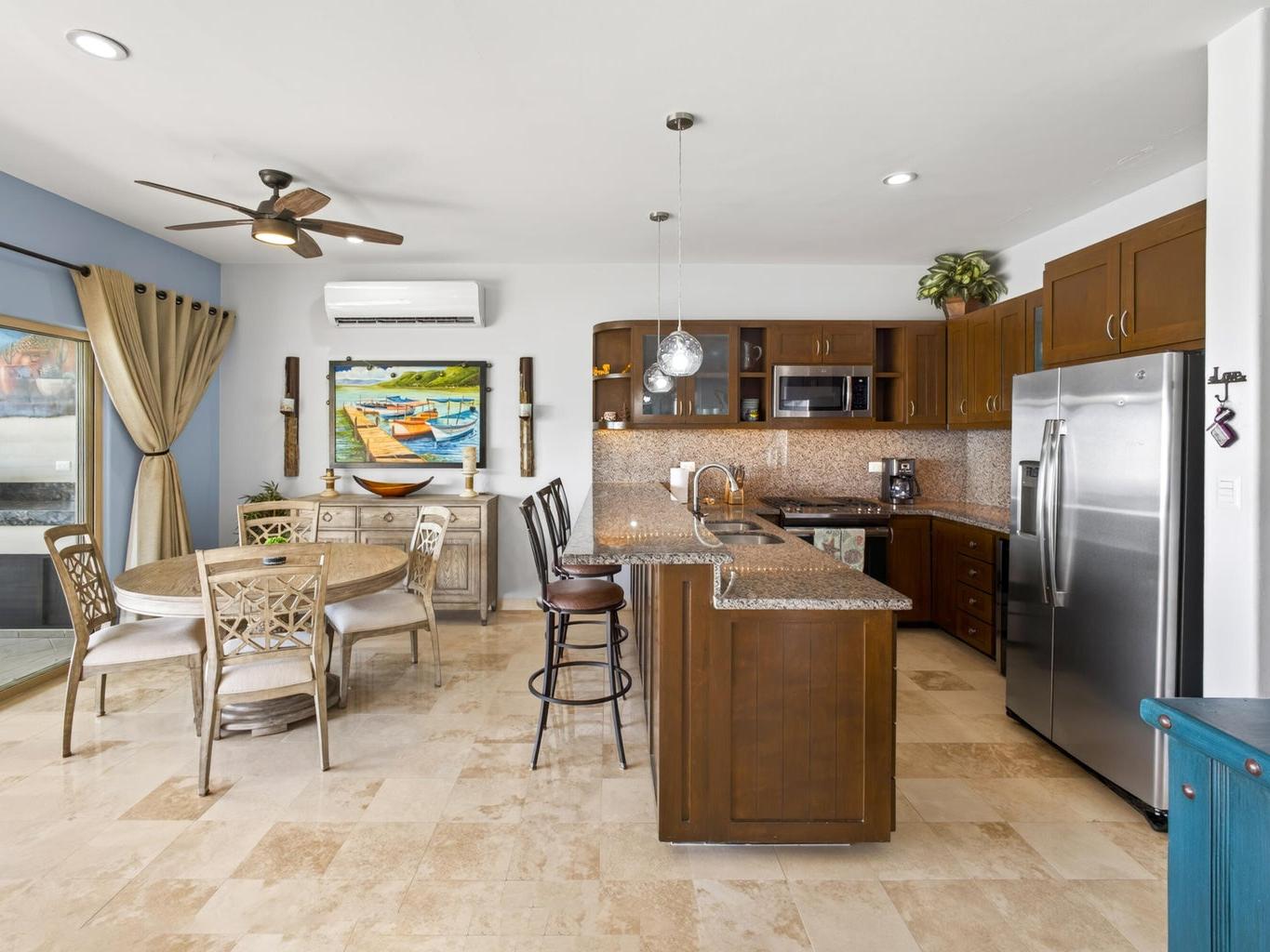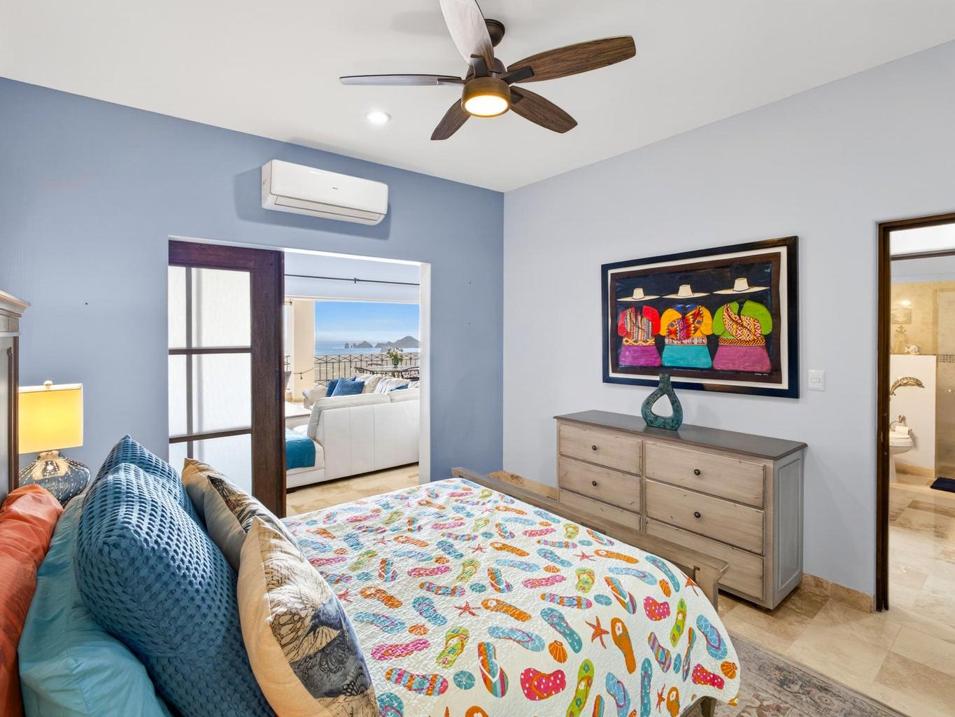 This fully furnished 2BD/2BA, gem offers 1,445 sqft of refined interiors and a 277 sqft terrace with an outdoor kitchen and built-in BBQ—perfect for soaking in unobstructed views of Land's End, the Sea of Cortez, and Cabo's cityscape. Thoughtful upgrades include a RVO water purification system and custom finishes throughout. Enjoy mesmerizing views from the kitchen, living room, bedroom, and even your shower. A rare oversized 2-car private garage is included, and for an additional $35k USD, you can own a 2018 Jeep Wrangler Unlimited Sahara & a 2018 Polaris RZR XP 1000 EPS. Located in coveted El Tezal, Ventanas 3B offers 24/7 gated security, elevator access, tennis courts, pool, track & field, kids' playground, and a fire pit lounge—just minutes from beaches, downtown, and top dining.