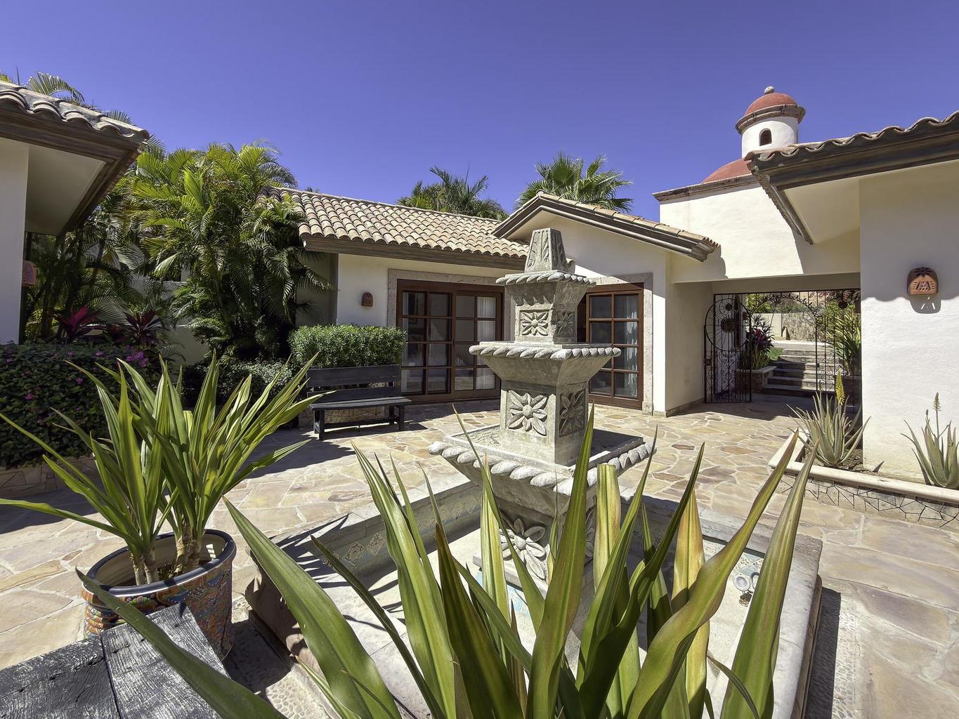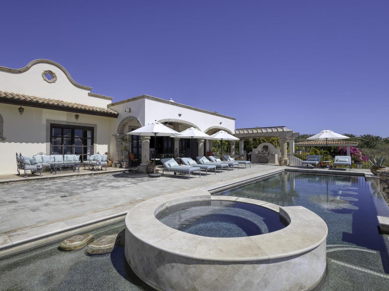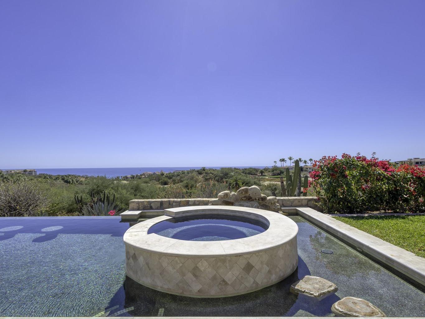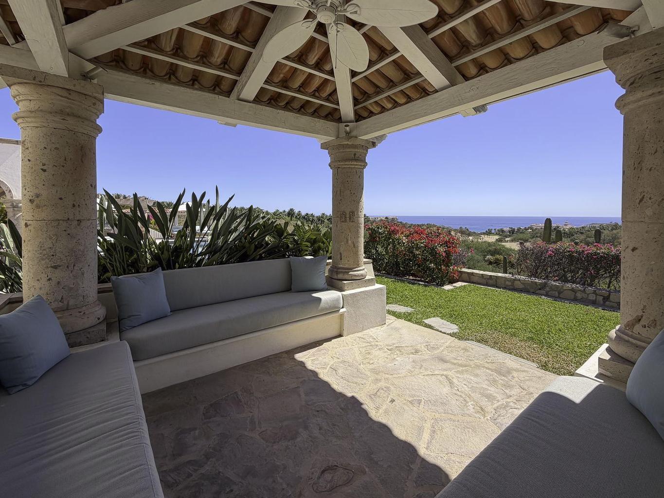 Be prepared to be wowed by the sweeping ocean views and peaceful living within the master-planned community of Cabo del Sol. Casa Brisas features a large backyard with stunning pool, swim-up seating, min-waterfall, and hot tub. The covered terrace, outdoor dining table, barbeque area, grassy lawn, and gazebo make for the perfect family retreat or five-star vacation rental. The expansive main house features a impressive great room with stone arches, wood beams and ceiling domes. Additional features include a beautiful inner courtyard with fountain, a detached 1-bedroom casita with kitchenette and living room, and a two-car garage for two large vehicles. 2023/2024 renovations include updated bathrooms with contemporary tile, countertops, and free-standing soaker-tub in the primary ensuite.