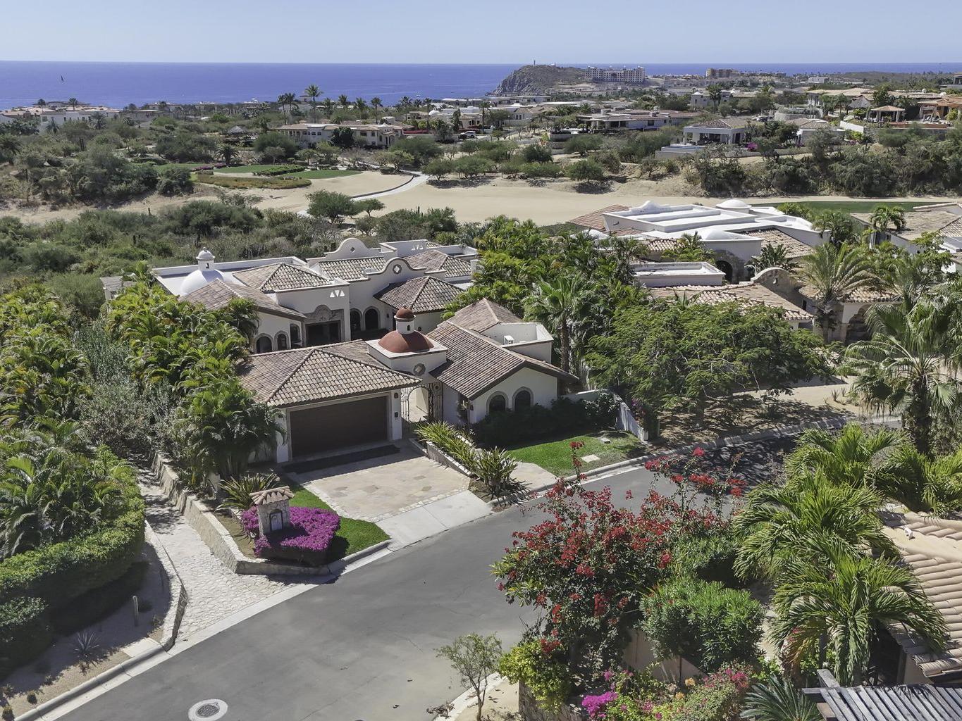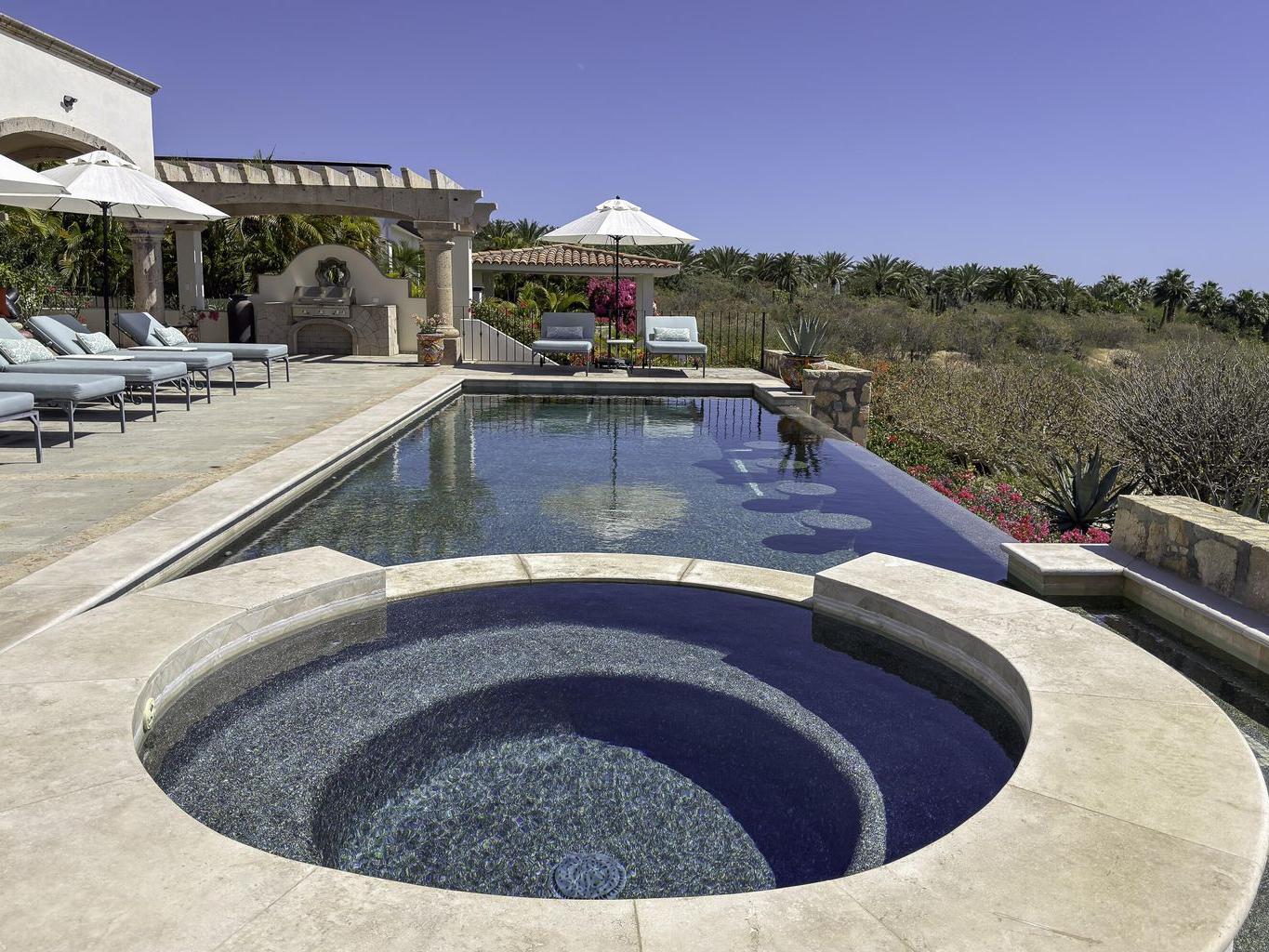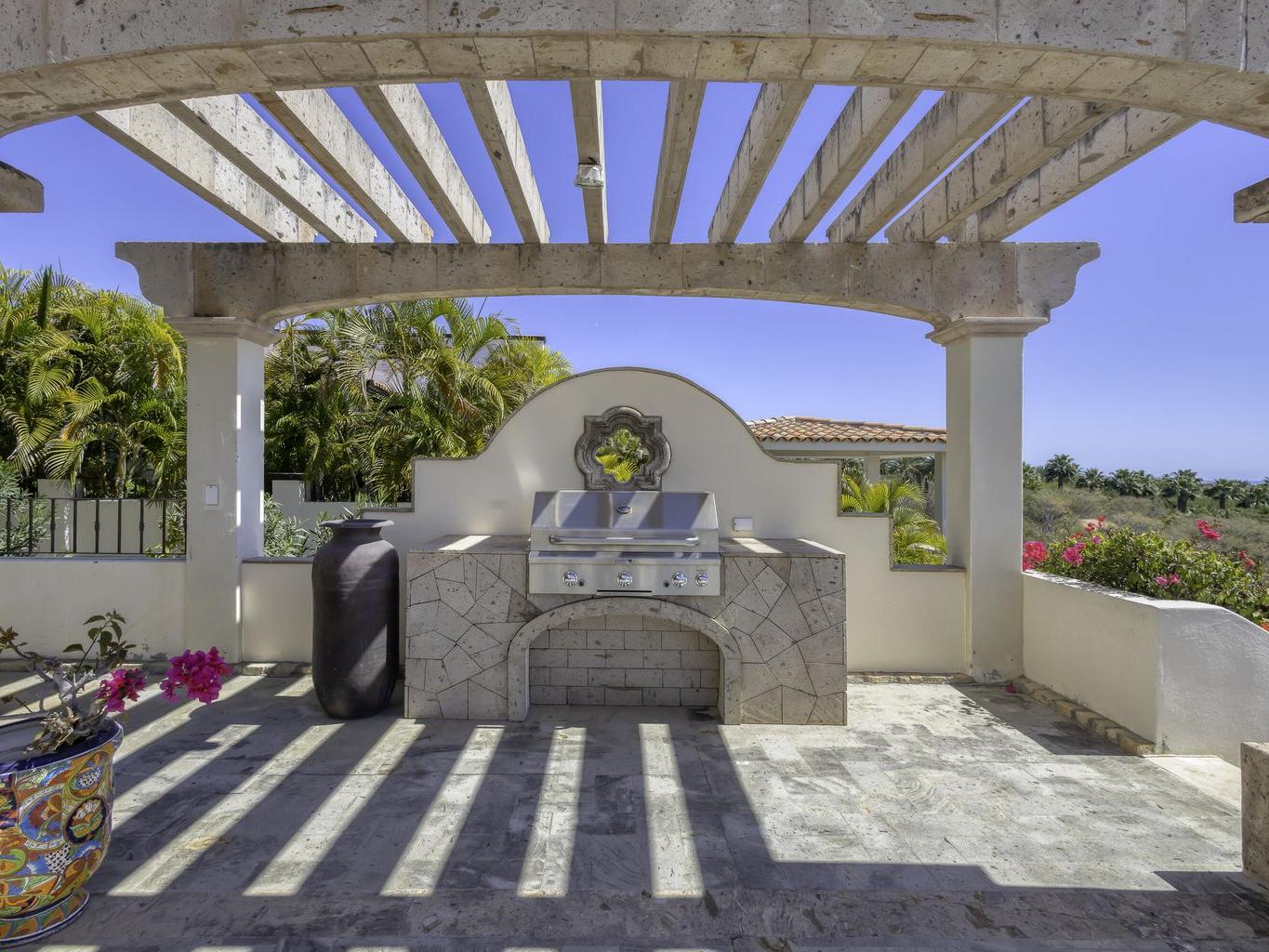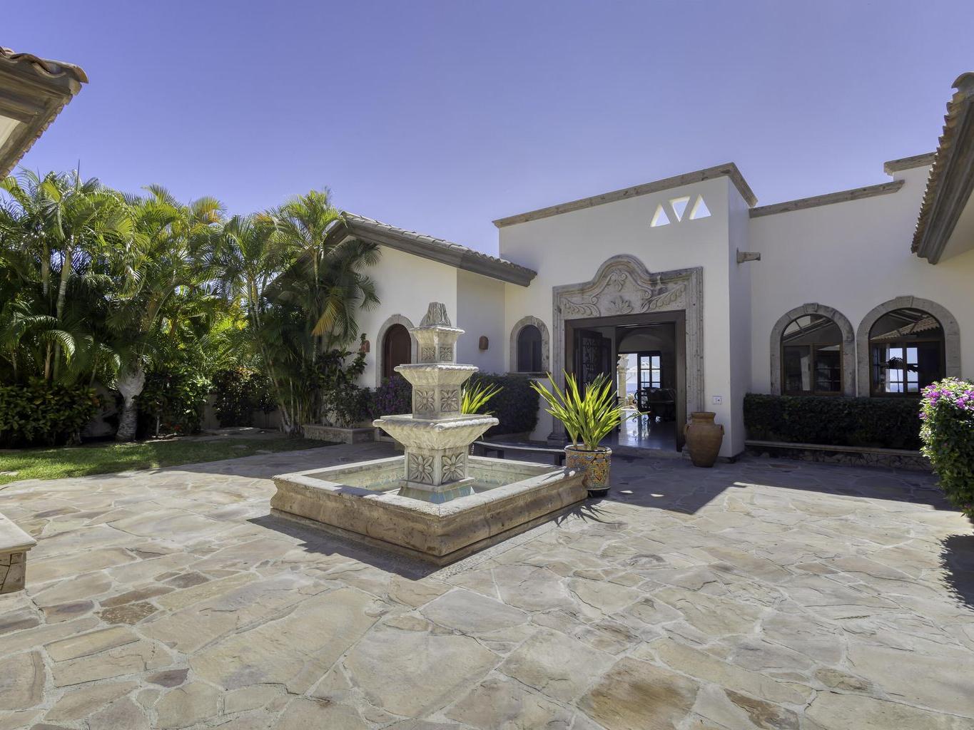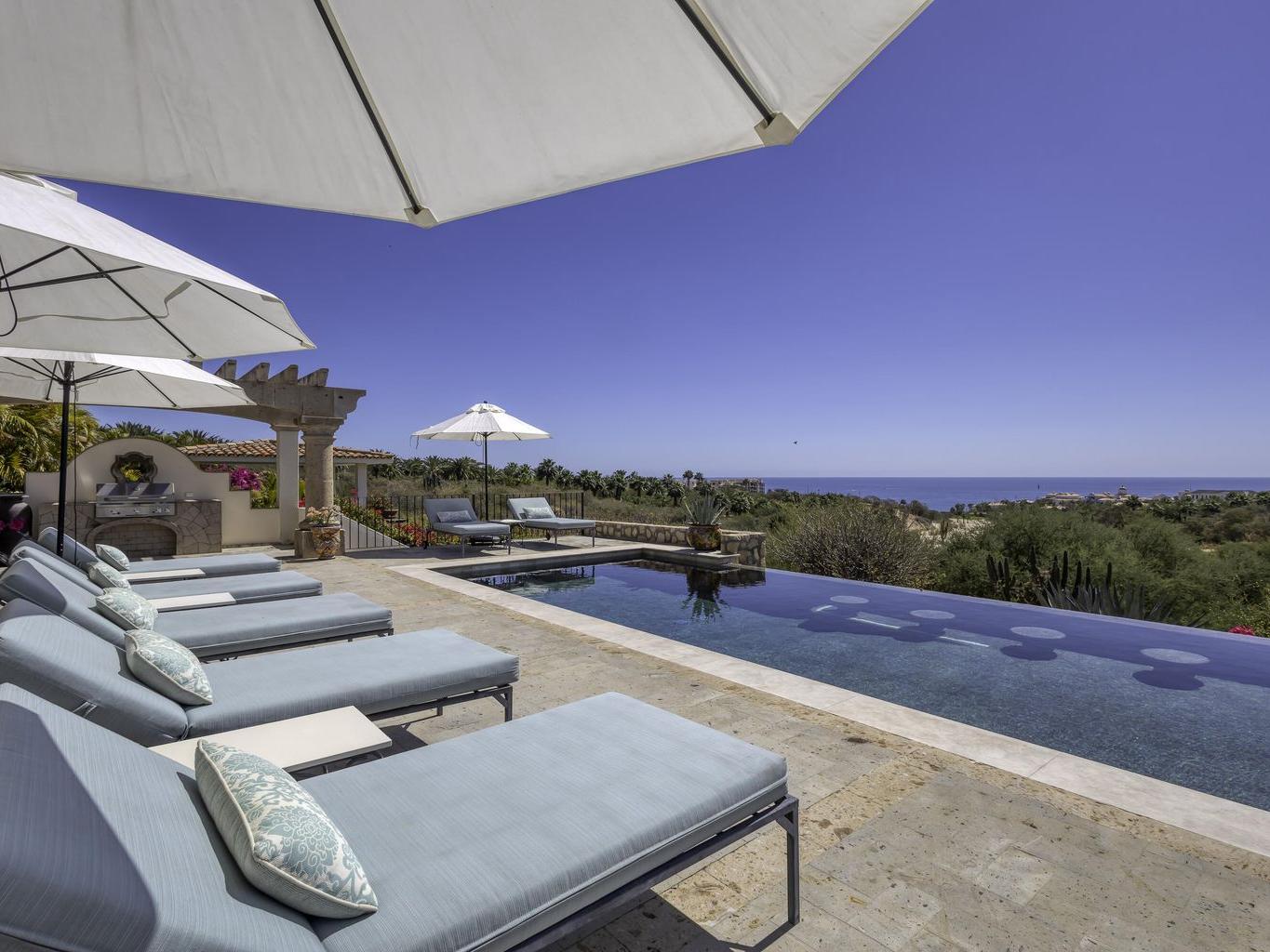 Be prepared to be wowed by the sweeping ocean views and peaceful living within the master-planned community of Cabo del Sol. Casa Brisas features a large backyard with stunning pool, swim-up seating, min-waterfall, and hot tub. The covered terrace, outdoor dining table, barbeque area, grassy lawn, and gazebo make for the perfect family retreat or five-star vacation rental. The expansive main house features a impressive great room with stone arches, wood beams and ceiling domes. Additional features include a beautiful inner courtyard with fountain, a detached 1-bedroom casita with kitchenette and living room, and a two-car garage for two large vehicles. 2023/2024 renovations include updated bathrooms with contemporary tile, countertops, and free-standing soaker-tub in the primary ensuite.