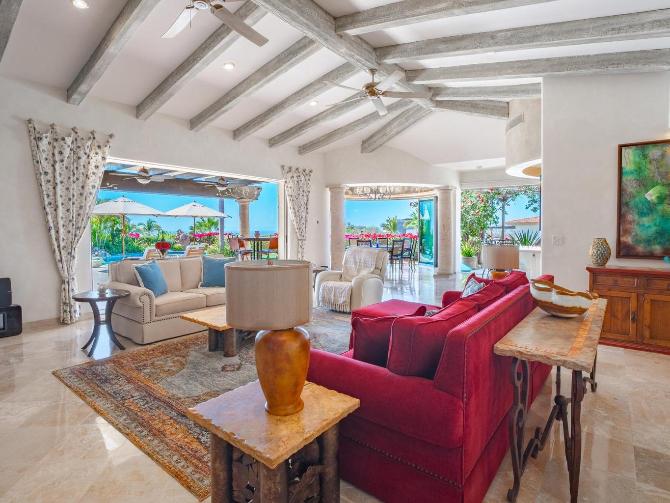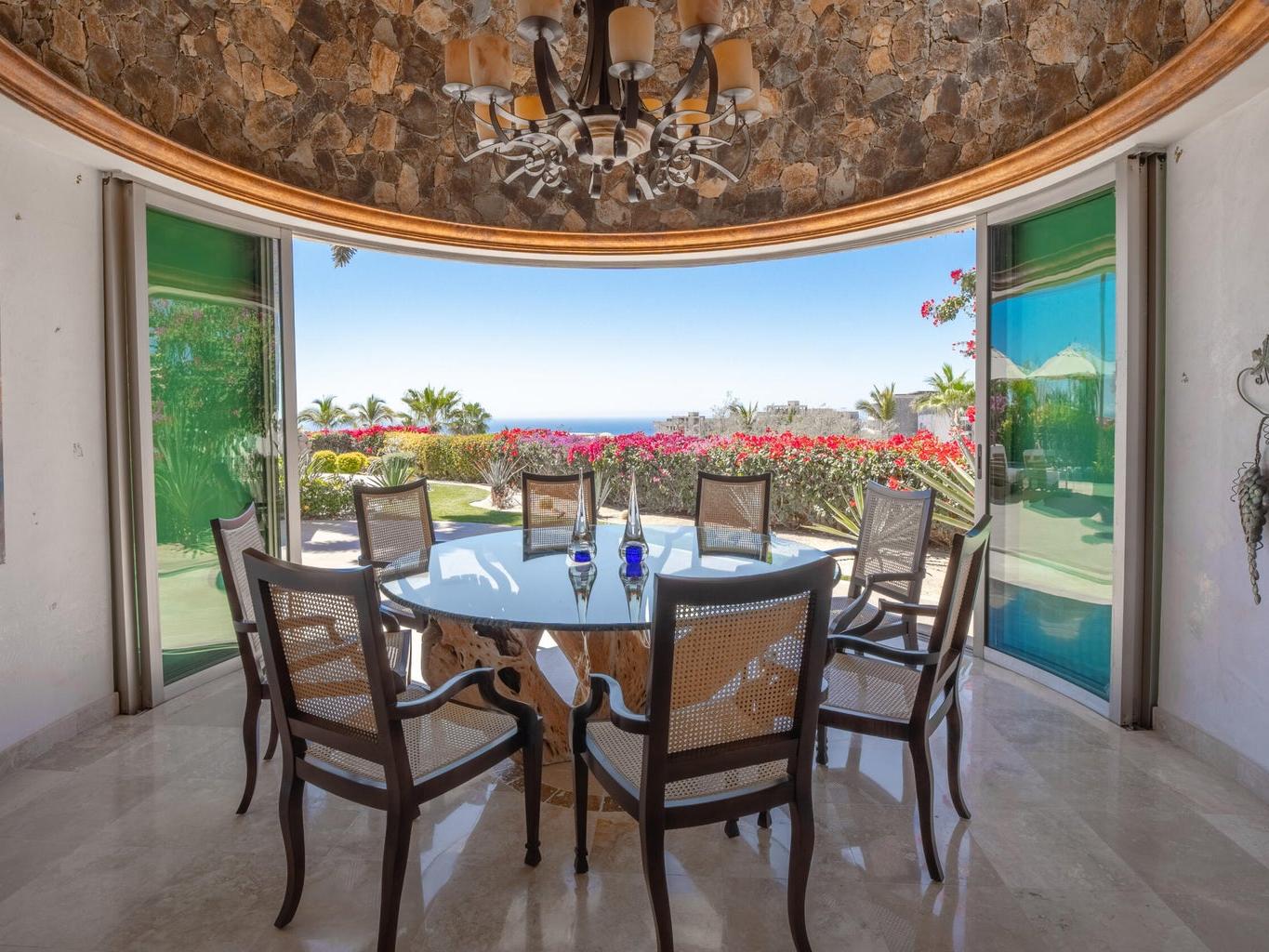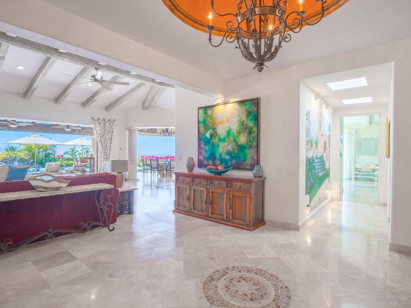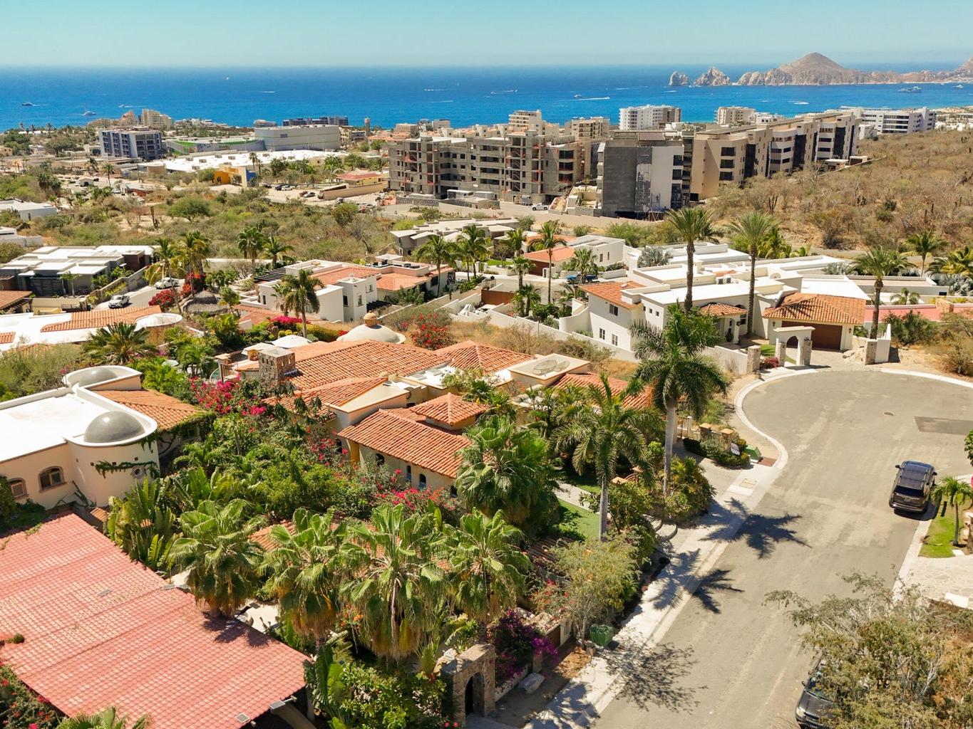 Perched on an elevated lot within the exclusive Cresta del Mar community, this single-level sanctuary captures the soul of Los Cabos. Ocean views stretch to the horizon, framing a home where artistry meets effortless living. The hacienda style walls, hand finished by local master Victor Hugo Nafarrate, tell a story of texture and warmth. Each room feels like its own canvas of aged elegance. A chef's kitchen anchors the space, while outdoor living unfolds around a sculptural pool with curved cantera stone shaped by hand. A private casita offers a peaceful retreat for guests, and the location is just moments from premier shops and the Corridor. This is more than a residence. It is a curated retreat for the discerning.
