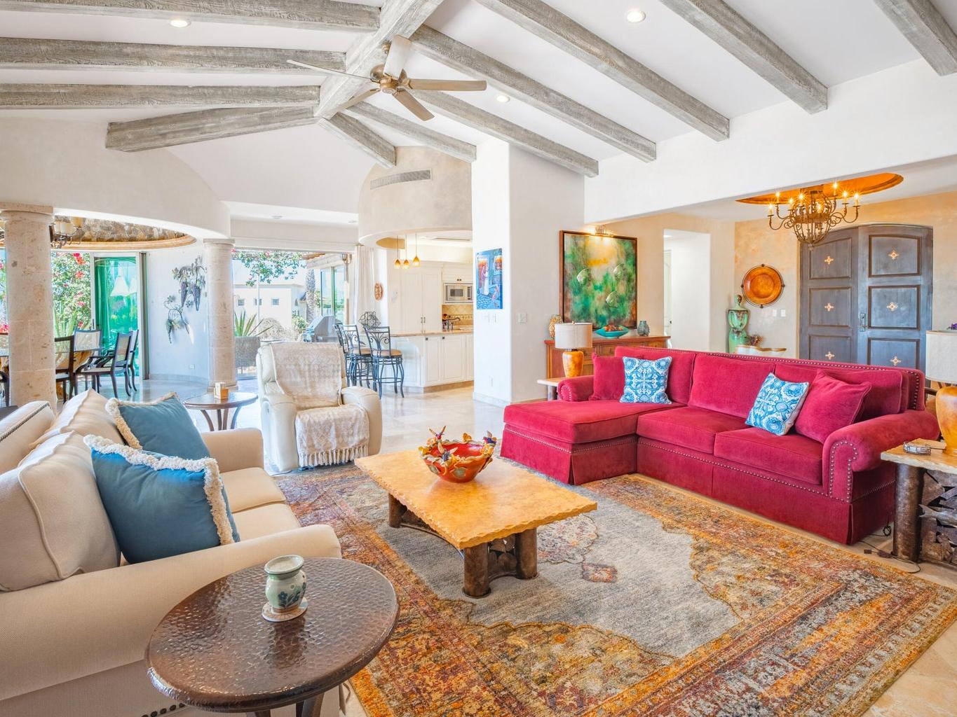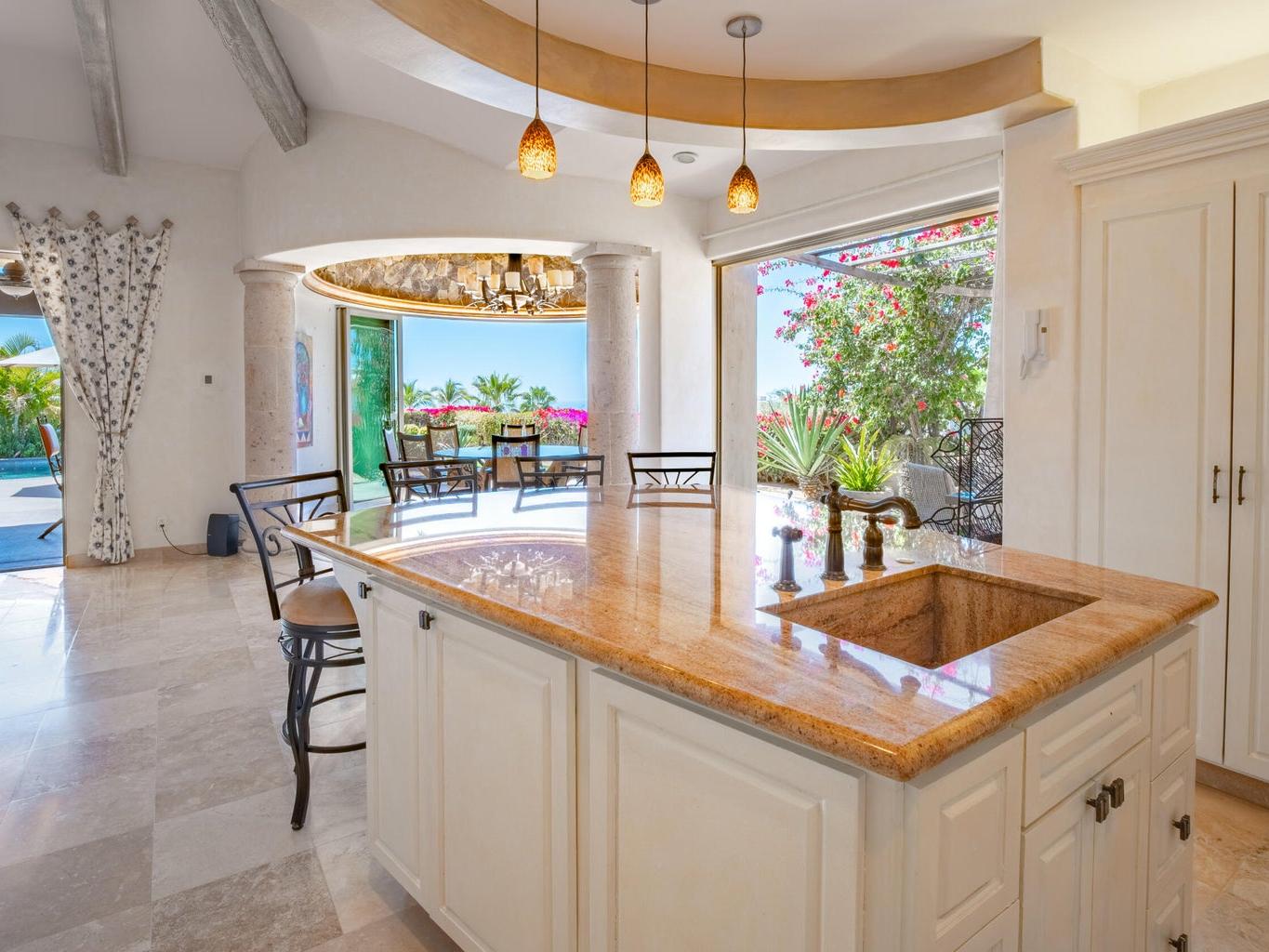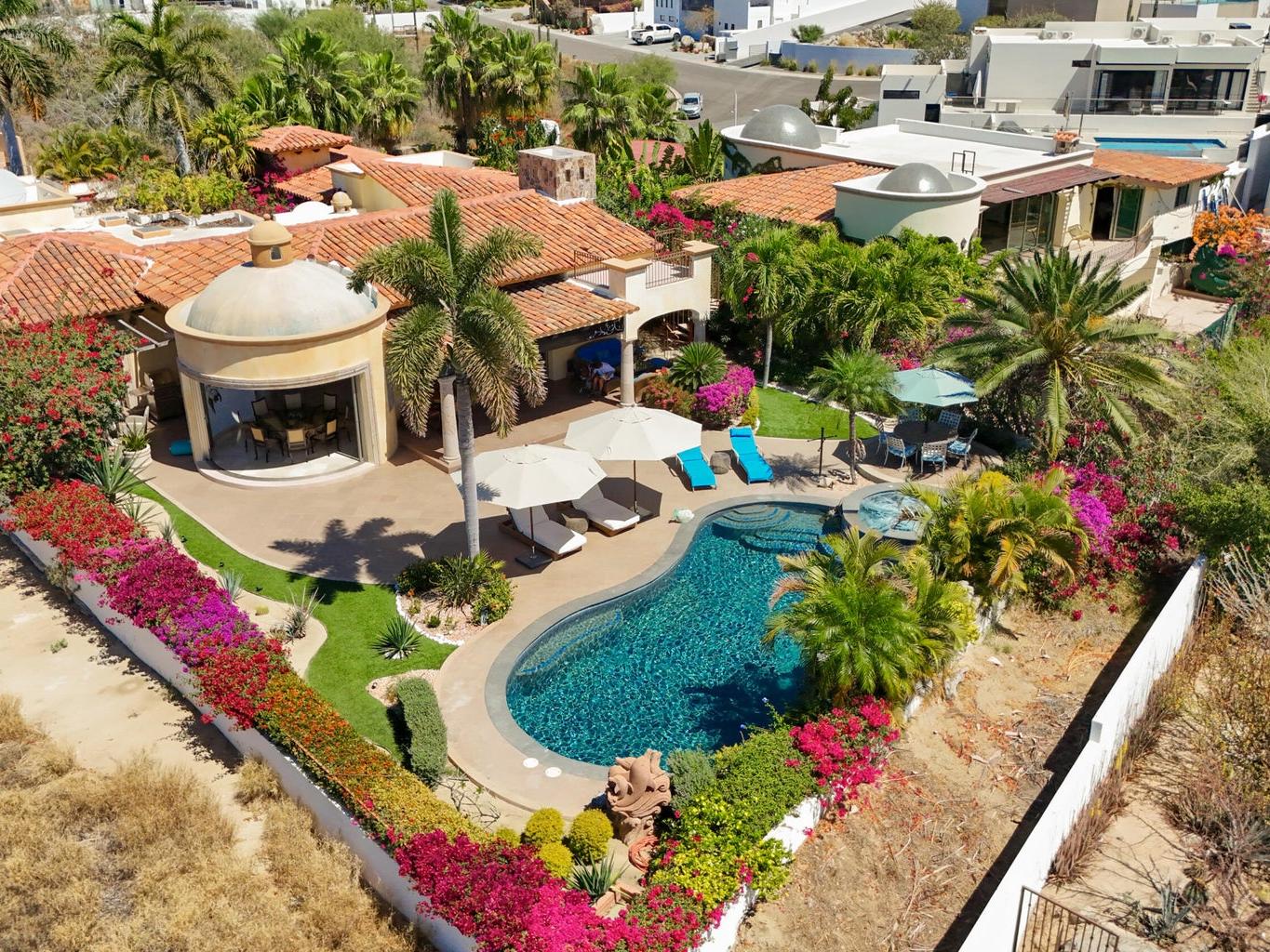 Perched on an elevated lot within the exclusive Cresta del Mar community, this single-level sanctuary captures the soul of Los Cabos. Ocean views stretch to the horizon, framing a home where artistry meets effortless living. The hacienda style walls, hand finished by local master Victor Hugo Nafarrate, tell a story of texture and warmth. Each room feels like its own canvas of aged elegance. A chef's kitchen anchors the space, while outdoor living unfolds around a sculptural pool with curved cantera stone shaped by hand. A private casita offers a peaceful retreat for guests, and the location is just moments from premier shops and the Corridor. This is more than a residence. It is a curated retreat for the discerning.