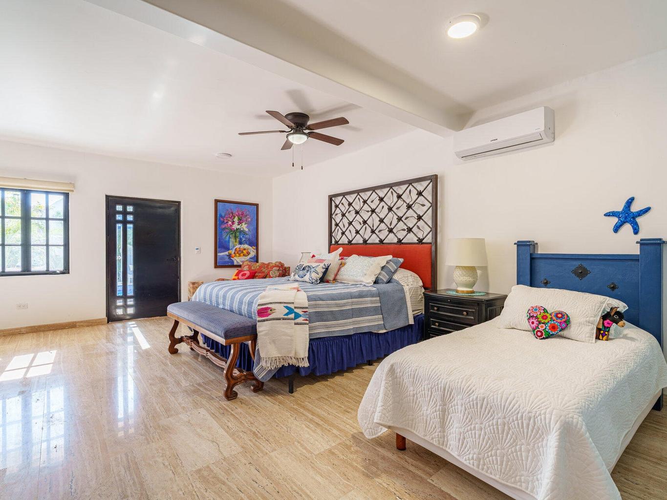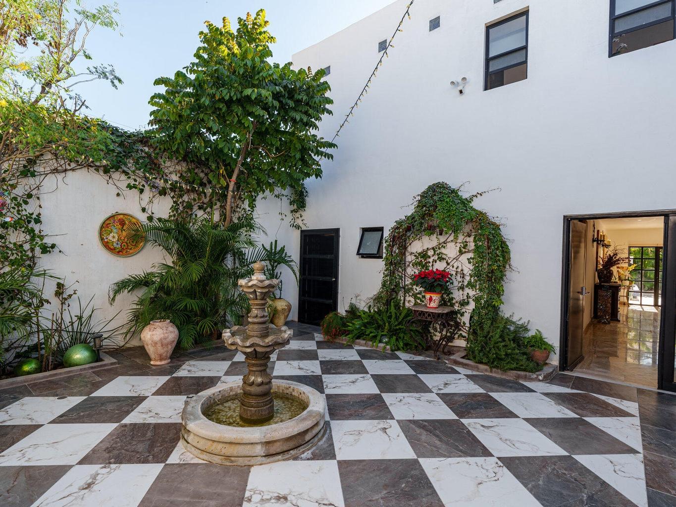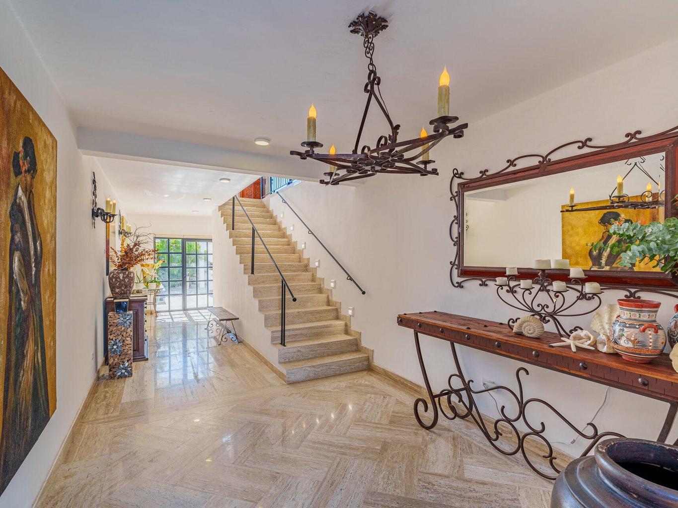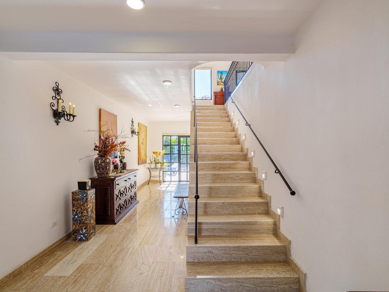 A grand entrance courtyard welcomes you into a refined interior featuring extra-tall ceilings, oversized room proportions, and travertine marble flooring throughout. The home offers three full-size bedrooms, each accommodating king-size beds and featuring private ensuite bathrooms with custom one-of-a-kind vanities.