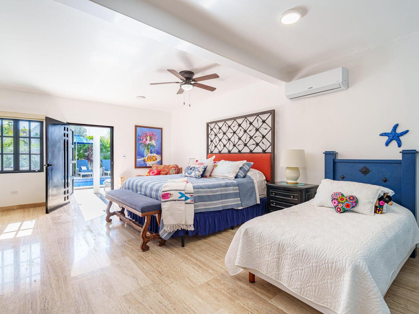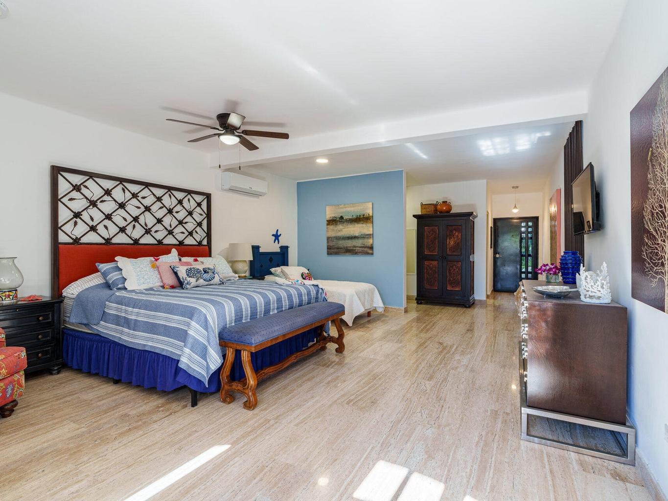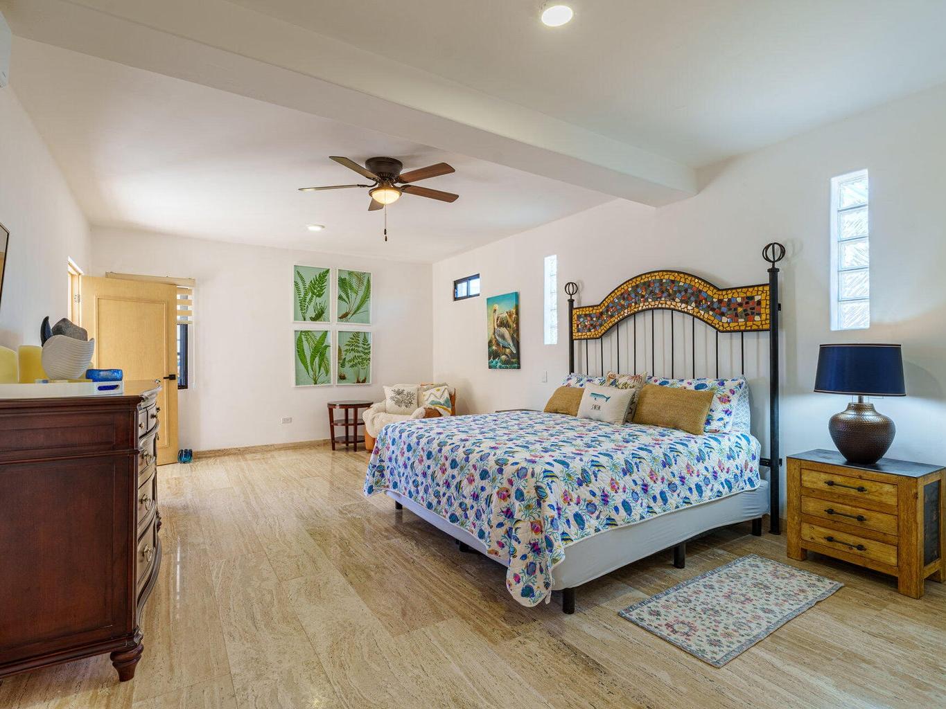 A grand entrance courtyard welcomes you into a refined interior featuring extra-tall ceilings, oversized room proportions, and travertine marble flooring throughout. The home offers three full-size bedrooms, each accommodating king-size beds and featuring private ensuite bathrooms with custom one-of-a-kind vanities.