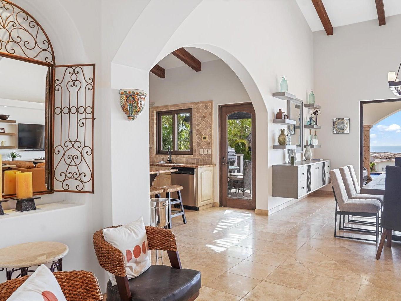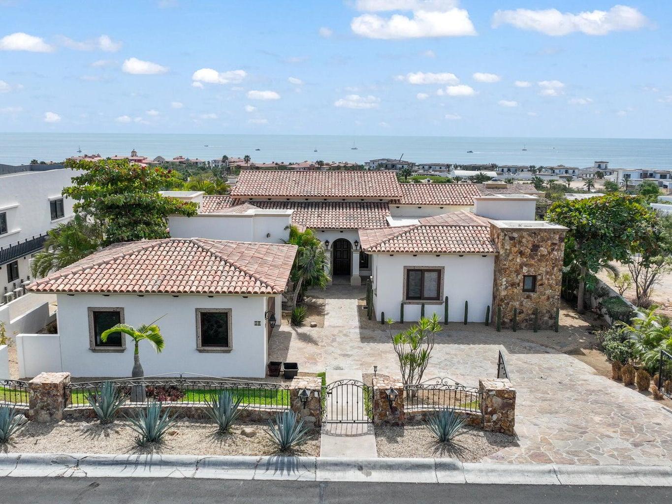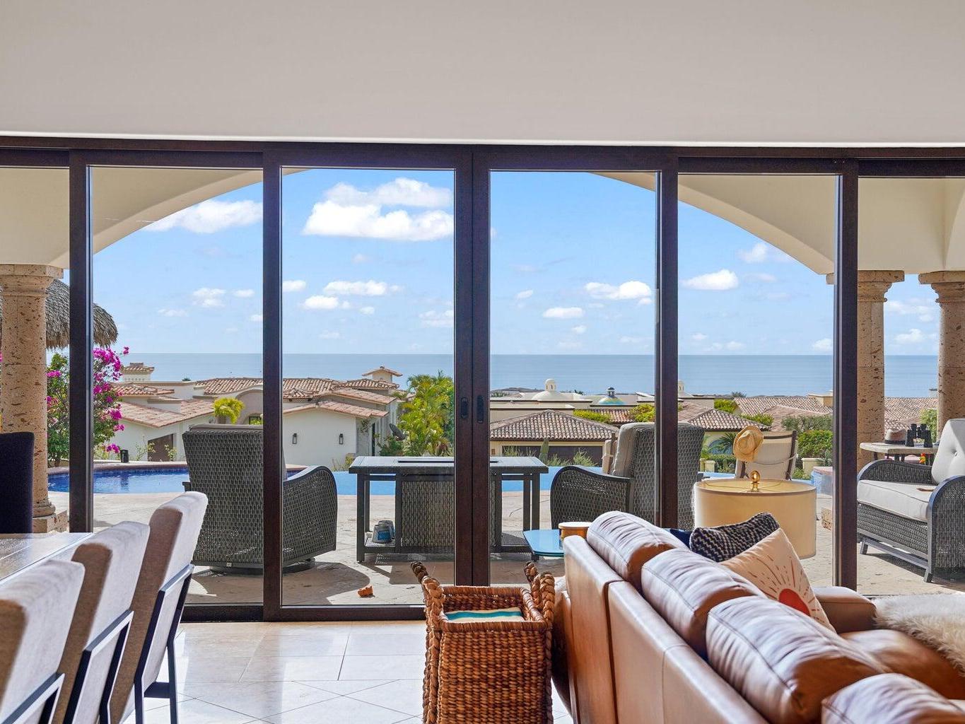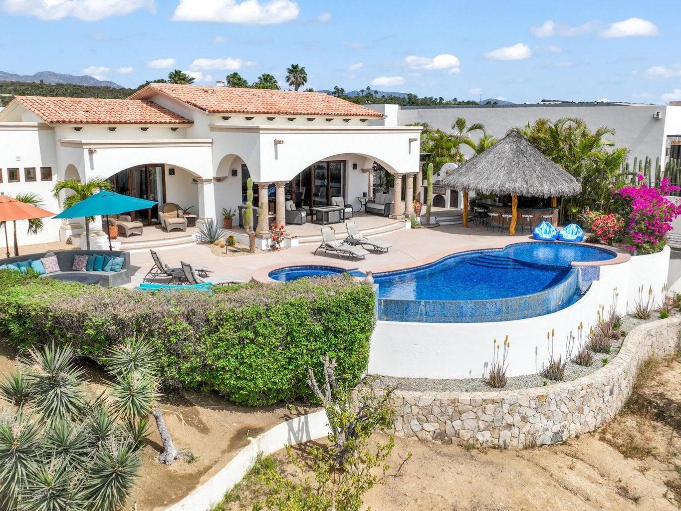 Situated in Las Colinas, this beautiful 4 bedroom, 5 bathroom home offers a spacious and private single-story living space. Great outdoor and entertaining area that is fully equipped with a heated pool, jacuzzi, fire pit area, grill, and palapa bar perfect to host guests! The Master/primary bedroom has direct ocean views with access to the pool and jacuzzi area. One guest bedroom offers their own private courtyard area, while 2 of the guest bedrooms have a separate entrance or can be accessed from within the home. Each bedroom is equipped with their own full bath + a 5th full bathroom located off of the living area. Inviting ocean views right when you walk into the main entrance of the home. Ocean views from the kitchen, living and dining area. 2 car garage with extra storage!