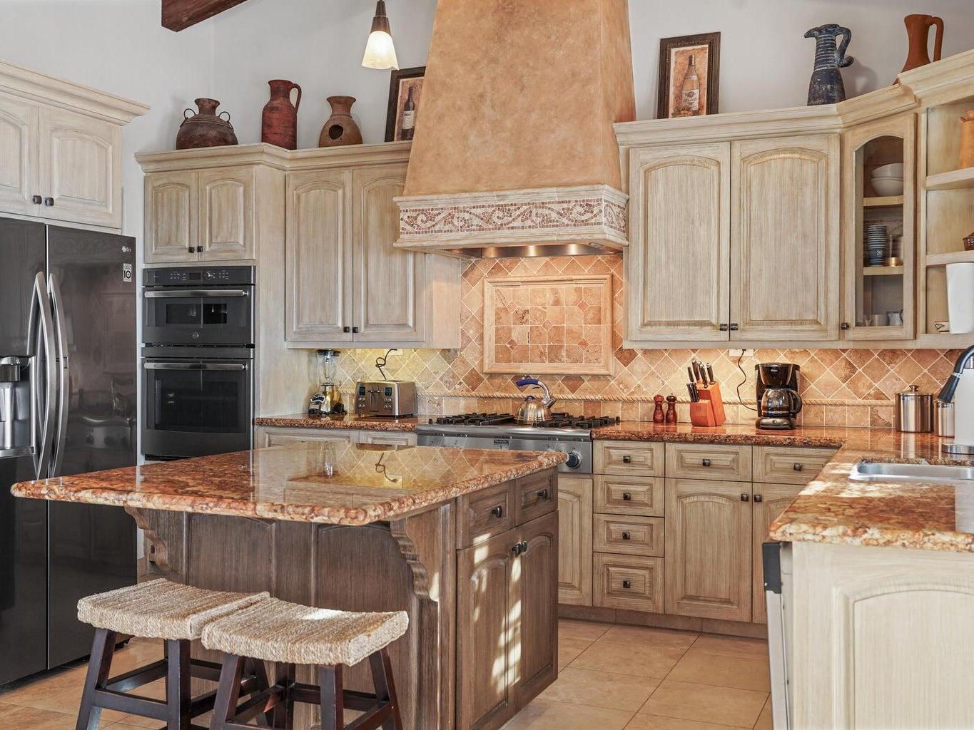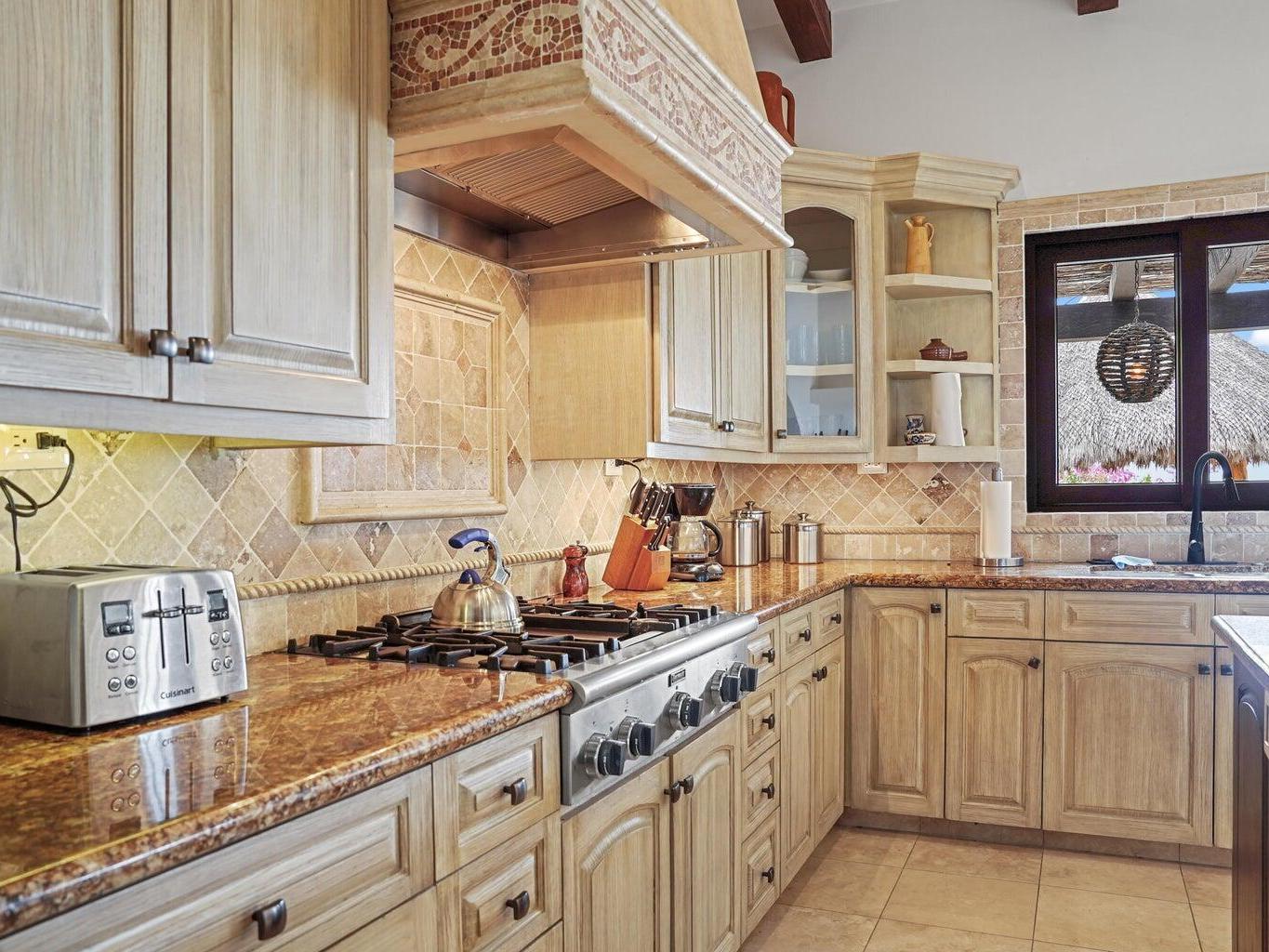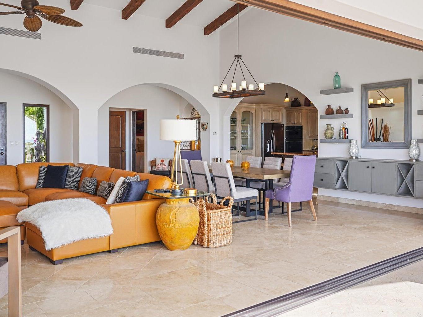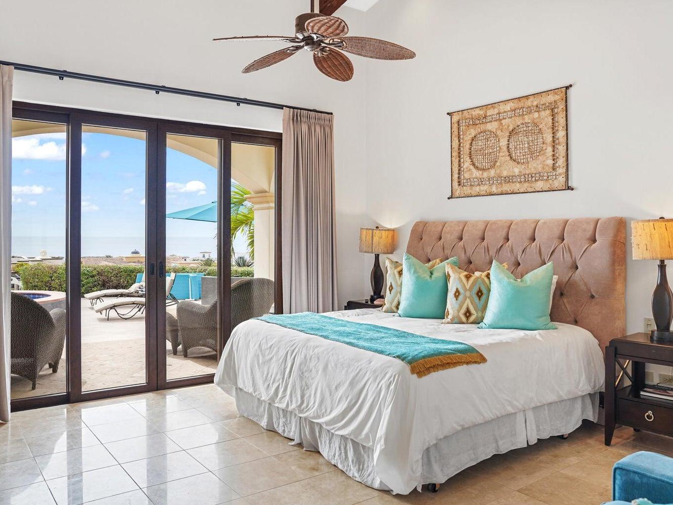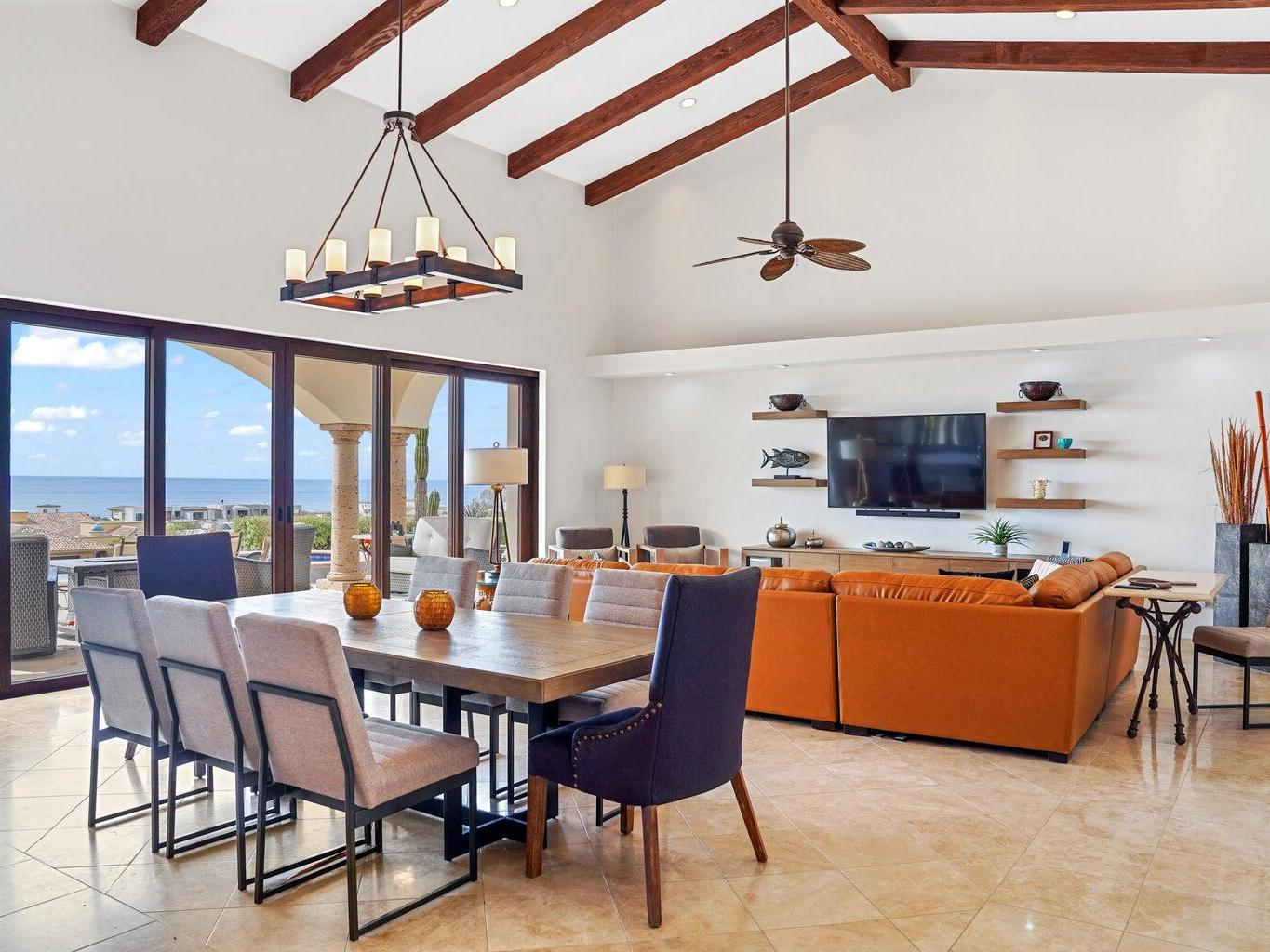 Situated in Las Colinas, this beautiful 4 bedroom, 5 bathroom home offers a spacious and private single-story living space. Great outdoor and entertaining area that is fully equipped with a heated pool, jacuzzi, fire pit area, grill, and palapa bar perfect to host guests! The Master/primary bedroom has direct ocean views with access to the pool and jacuzzi area. One guest bedroom offers their own private courtyard area, while 2 of the guest bedrooms have a separate entrance or can be accessed from within the home. Each bedroom is equipped with their own full bath + a 5th full bathroom located off of the living area. Inviting ocean views right when you walk into the main entrance of the home. Ocean views from the kitchen, living and dining area. 2 car garage with extra storage!