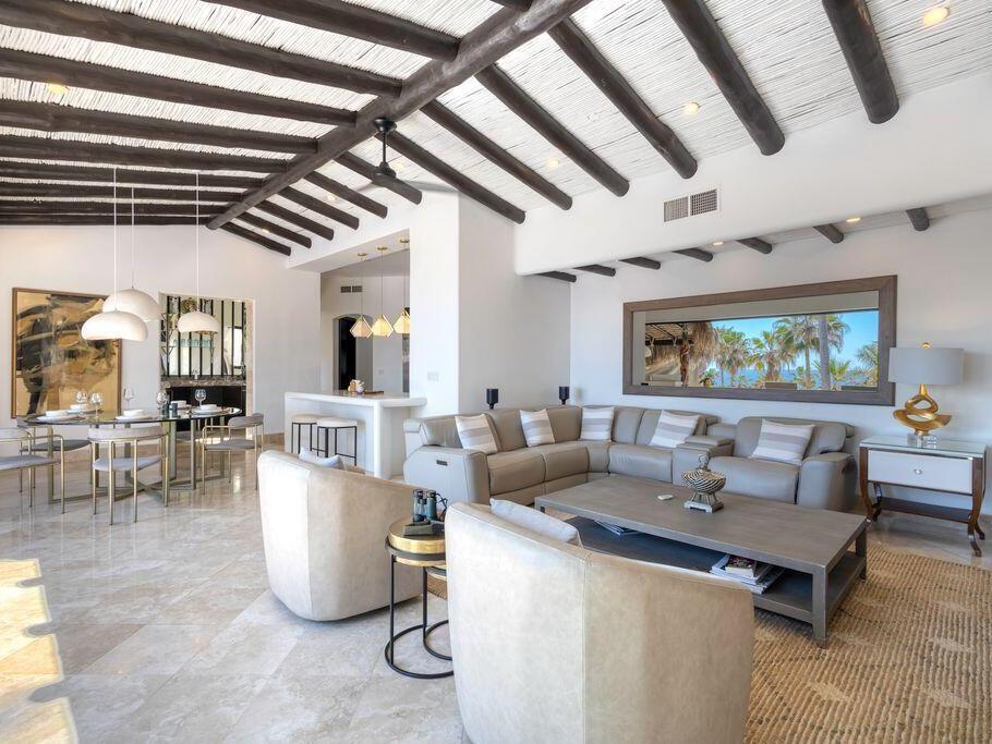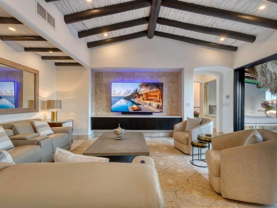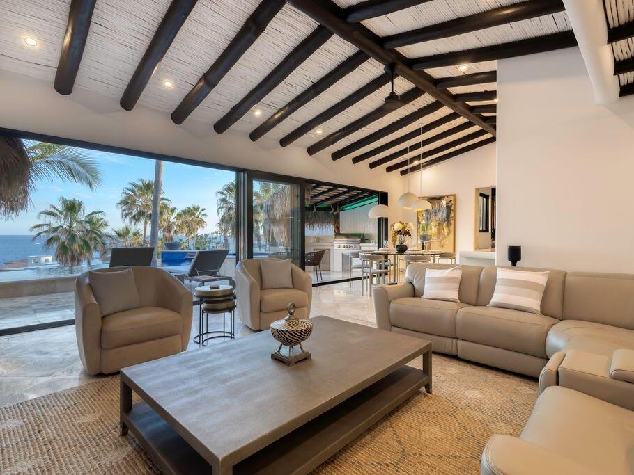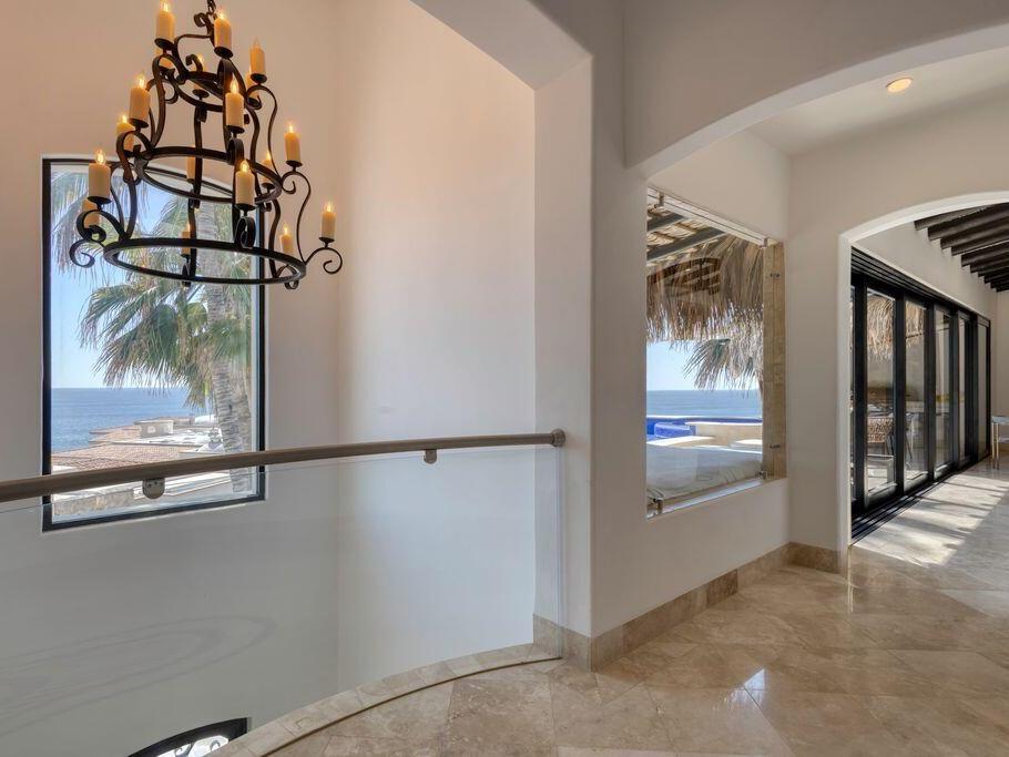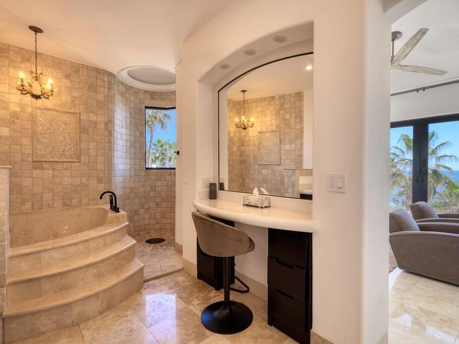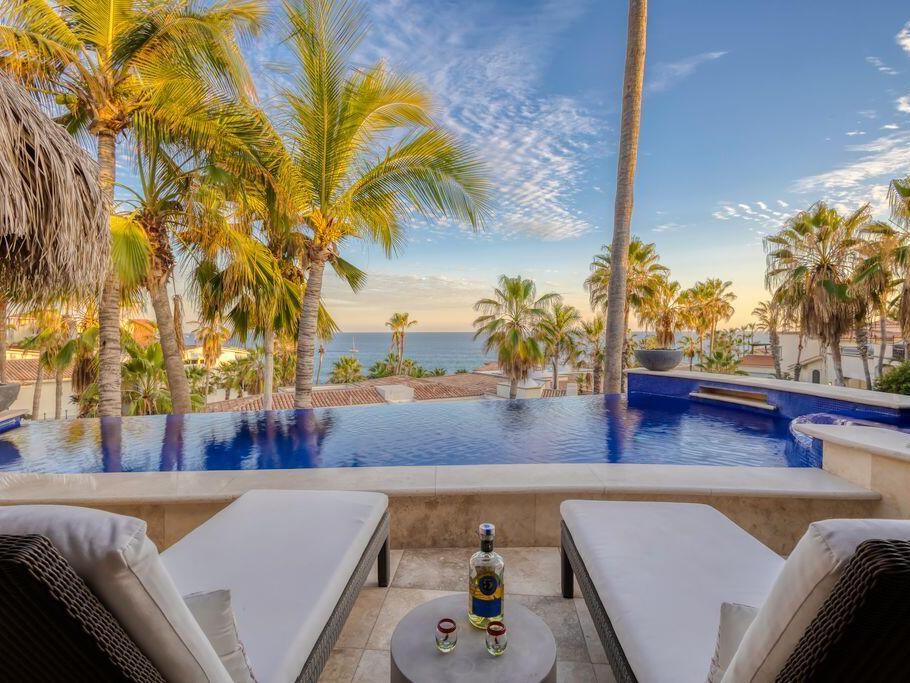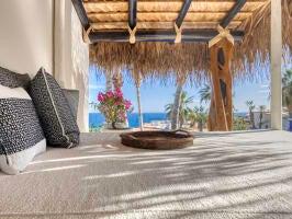 The advantage of owning an income creating home that can make over 400l a year is just one part of the benefit of this One-of-a Kind Opportunity to own one of the most unique Celebrity Homes in Los Cabos. Hidden in a waterfront enclave above the crystal bay waters, this aptly named Estate awaits purposefully facing the Sea of Cortez and within very close proximity to a long list of spoils. The spacious residence spans more than 5918 square feet under ac-over 8000 total, designed for both enjoyment, privacy and deserved oceanside living. A dramatic triple-height foyer, customizations and natural light, lead to spanning living and dining area layered in marble, art and stone throughout - including the St Tropez themed , added zen spaces, rooftop and sky lounge.