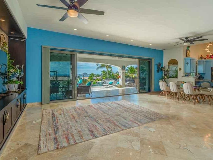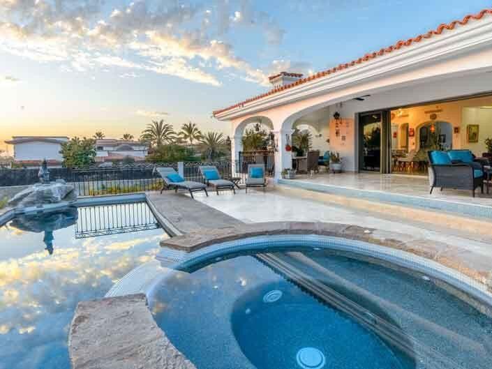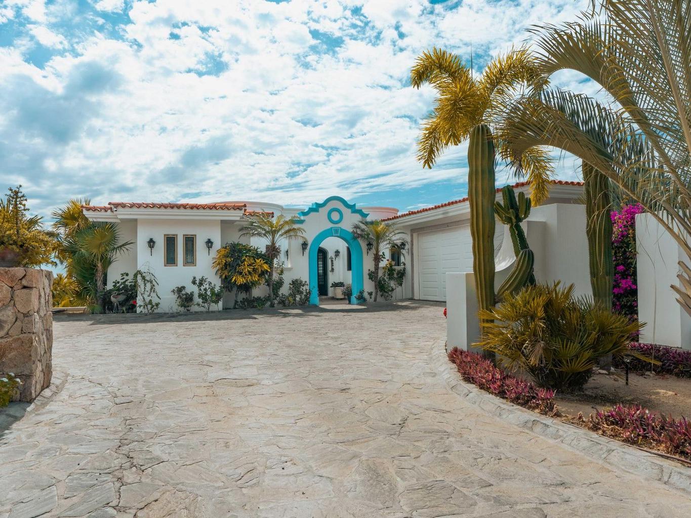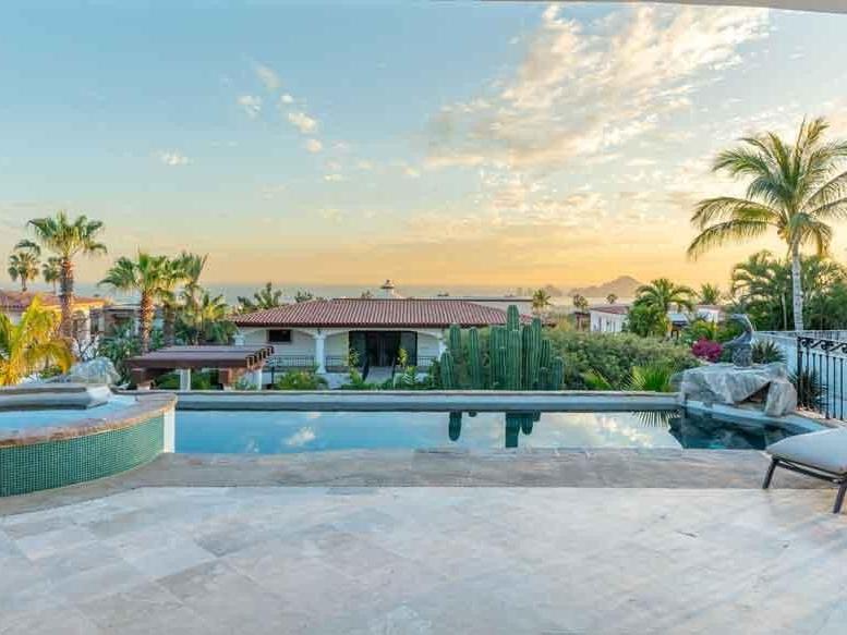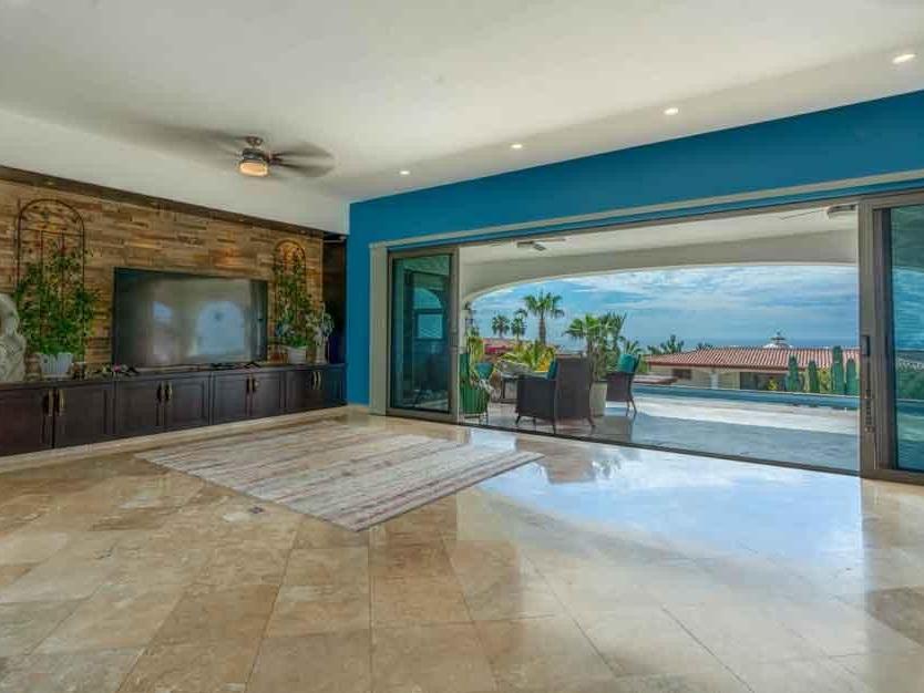 Enjoy stunning views of the Sea of Cortez and city lights at night from this beautifully designed home offering four bedrooms, three and a half bathrooms, plus an office. The primary suite, kitchen, living, dining room, and office are all on one level, allowing for easy single-level living. The kitchen features high-end stainless steel appliances, a six-burner range, double ovens, a walk-in pantry, and an island with a prep sink. Marble floors flow throughout the home and open to a main-level terrace with pool and jacuzzi, ideal for relaxing or entertaining. The lower level includes two spacious bedrooms, one en-suite and the other sharing a full bath with a game room, both with private covered terraces. Located in Rancho Paraíso, a gated community with 24-hrs security, minutes from golf