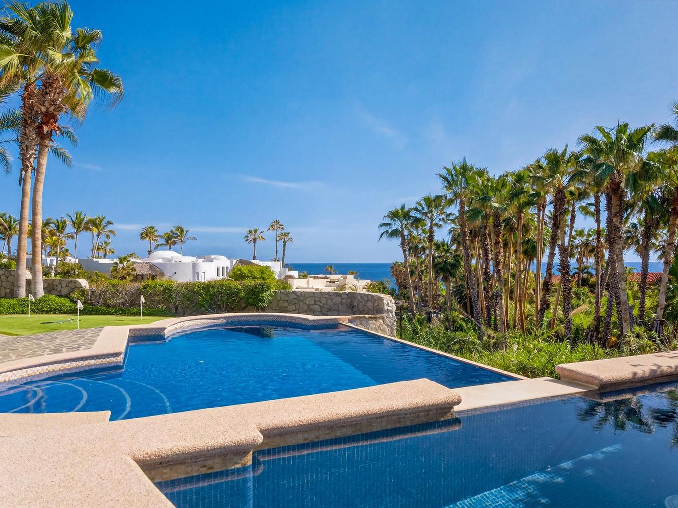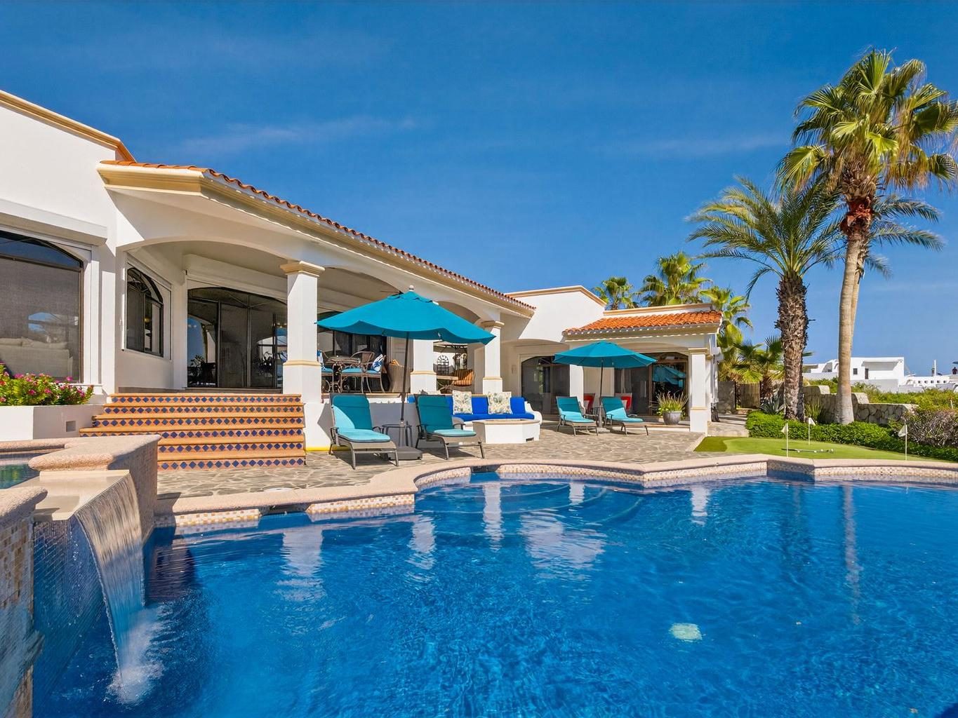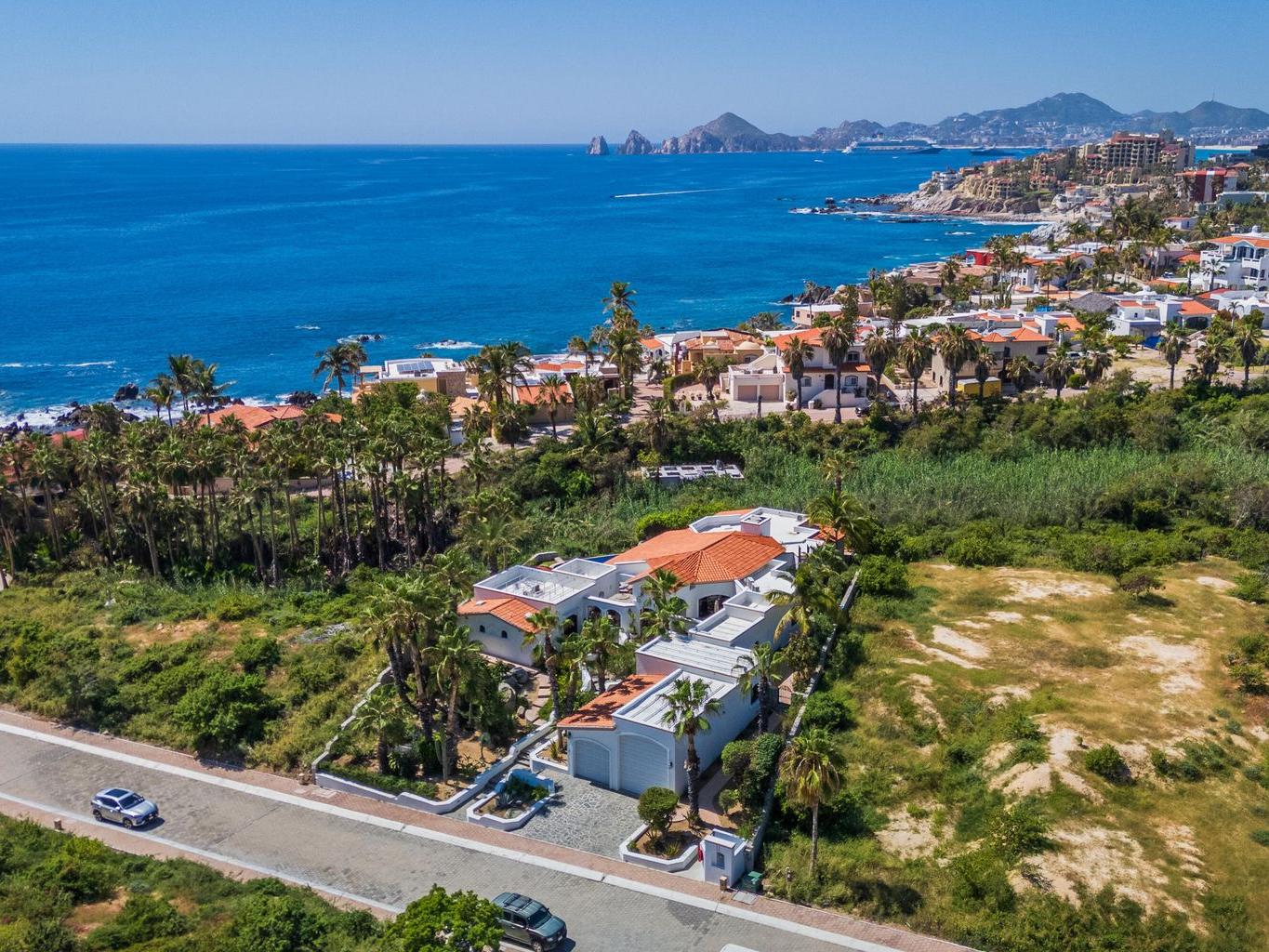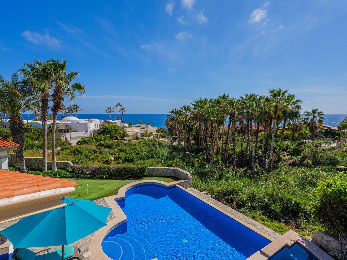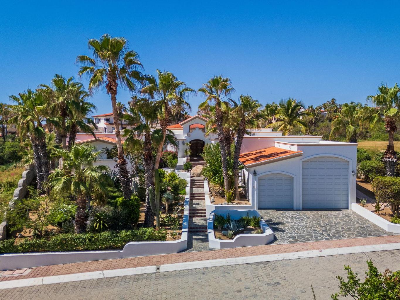 Amazing Residence Third Row from The Ocean in Sunny Cabo San Lucas! Located 10 min from downtown in Santa Carmela, one of the most sought-after residential communities in Los Cabos. This serene 6,135 Sqft Villa with 4 bedrooms and 4.5 baths seats on a big 1,506 Sqmt lot (over 1/3 of an acre) only a few steps from the ocean. It offers an exquisite ambience and an incredible back yard perfect for outdoor living and entertaining with ample covered terraces, heated infinity edge pool, jacuzzi, BBQ area and Bar, lounge area with fire pit, lush landscaping and even a pitch'n put. It features a TV room, office space, automatic roll down hurricane shutters, oversized laundry room with 2 sets of washer and dryer, water filtration system and an oversize garage that can fit a boat.