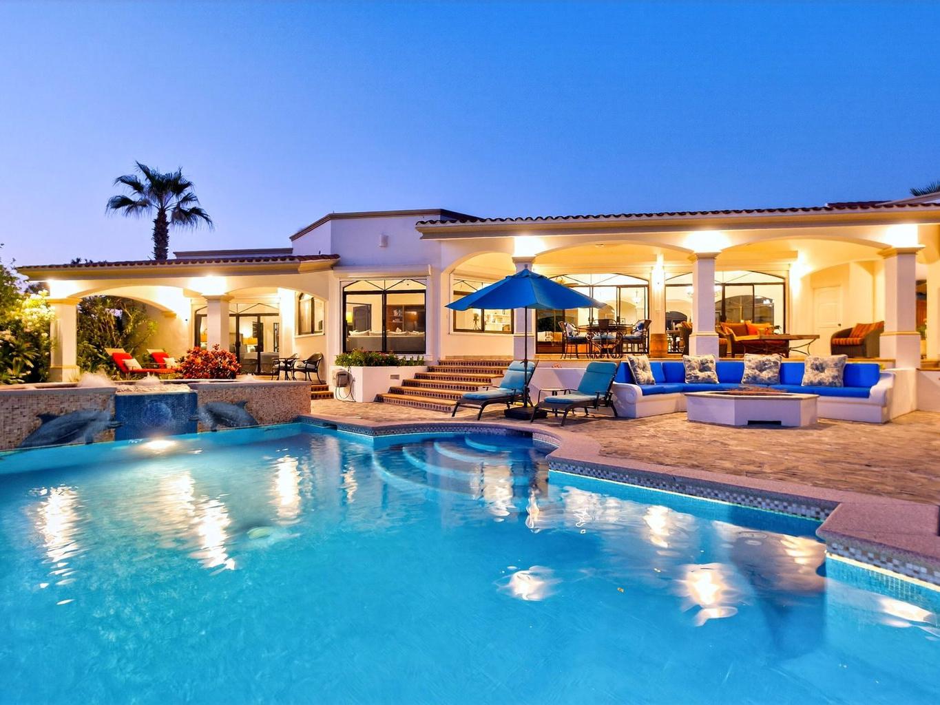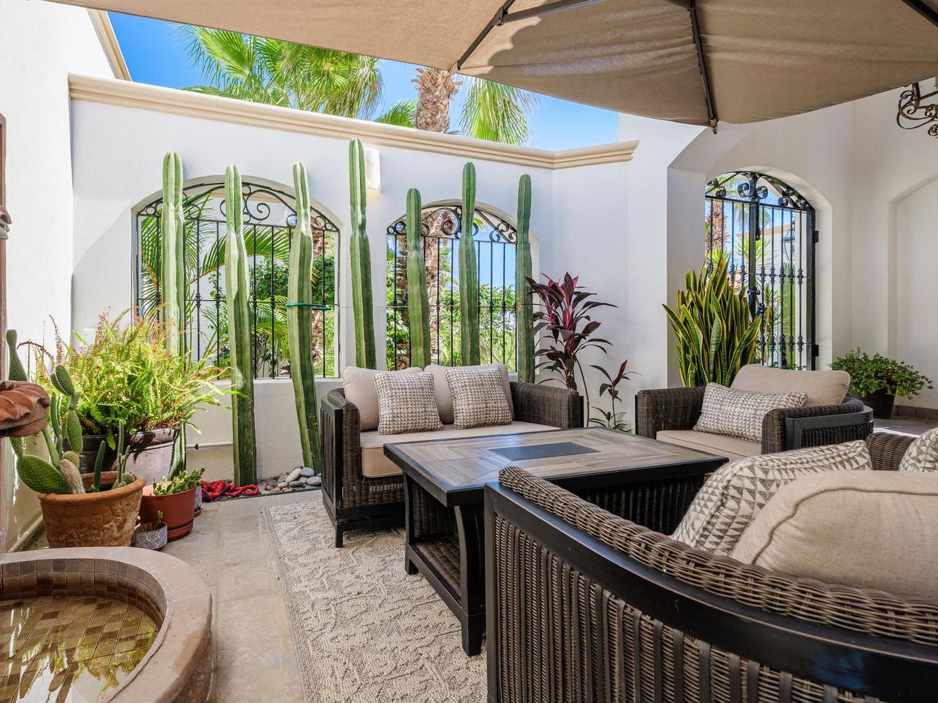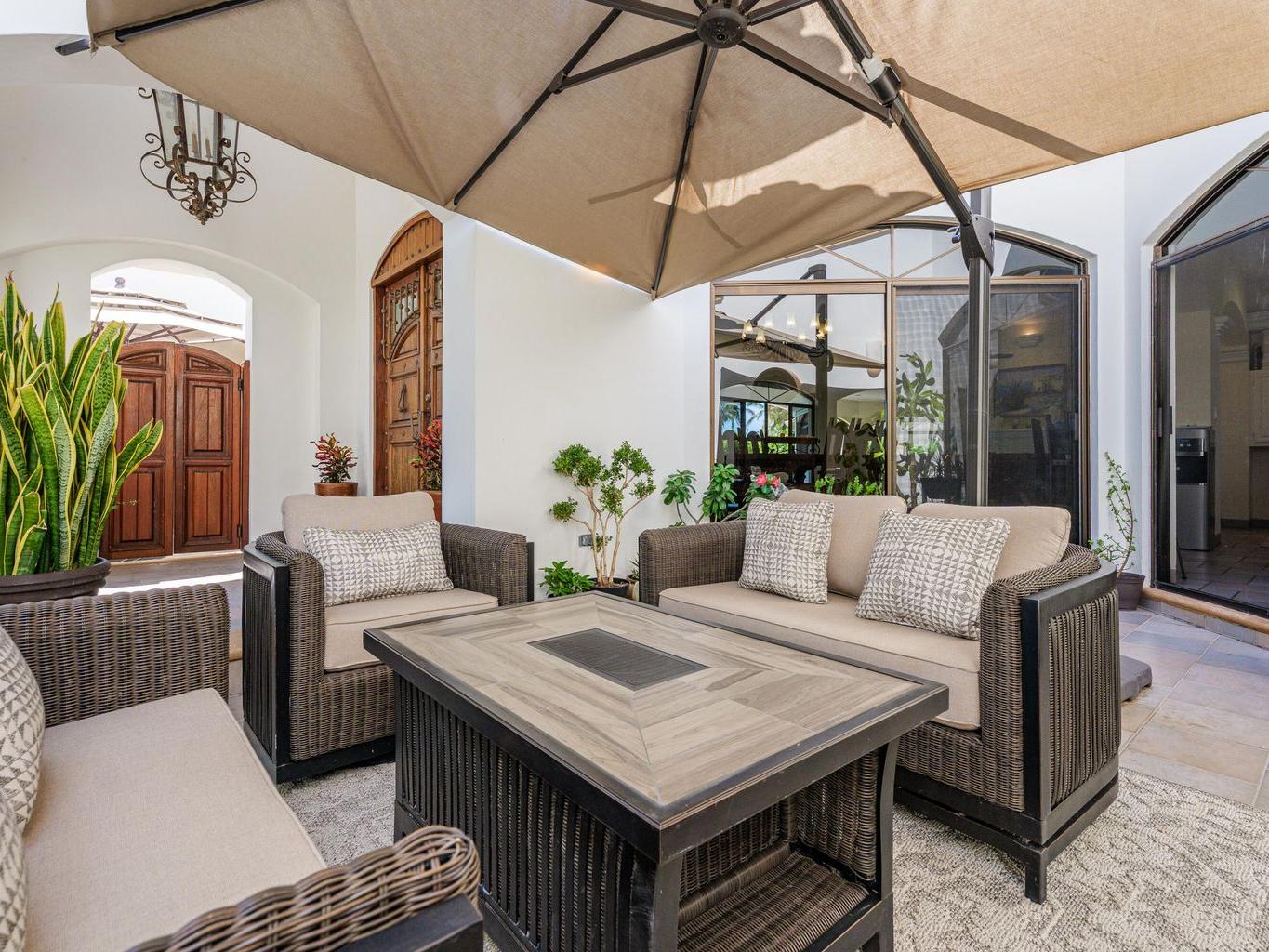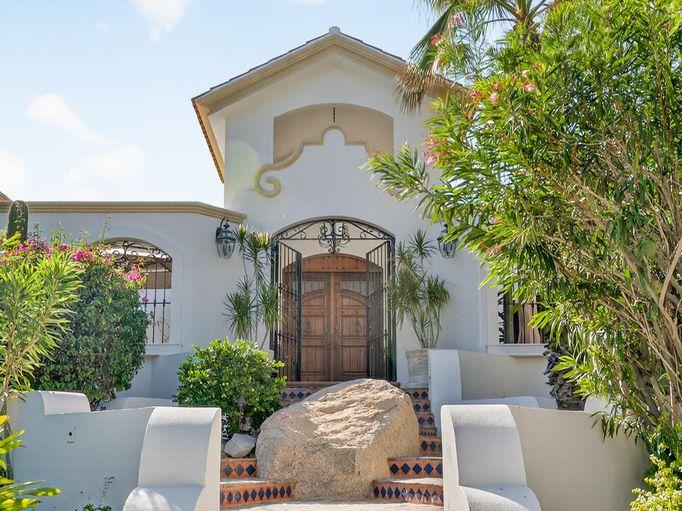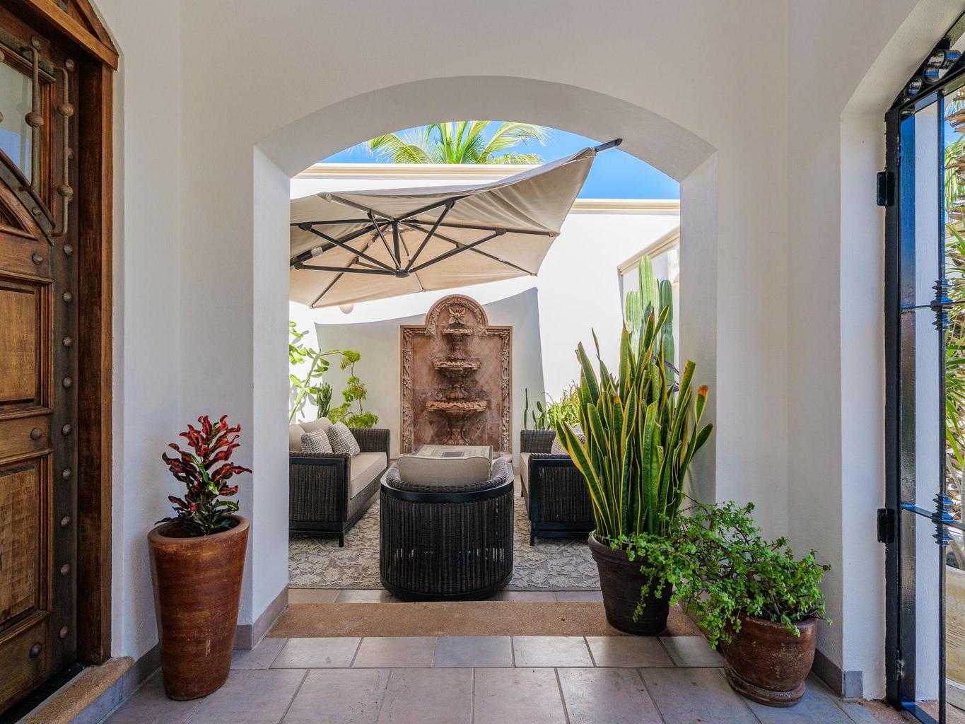 Amazing Residence Third Row from The Ocean in Sunny Cabo San Lucas! Located 10 min from downtown in Santa Carmela, one of the most sought-after residential communities in Los Cabos. This serene 6,135 Sqft Villa with 4 bedrooms and 4.5 baths seats on a big 1,506 Sqmt lot (over 1/3 of an acre) only a few steps from the ocean. It offers an exquisite ambience and an incredible back yard perfect for outdoor living and entertaining with ample covered terraces, heated infinity edge pool, jacuzzi, BBQ area and Bar, lounge area with fire pit, lush landscaping and even a pitch'n put. It features a TV room, office space, automatic roll down hurricane shutters, oversized laundry room with 2 sets of washer and dryer, water filtration system and an oversize garage that can fit a boat.