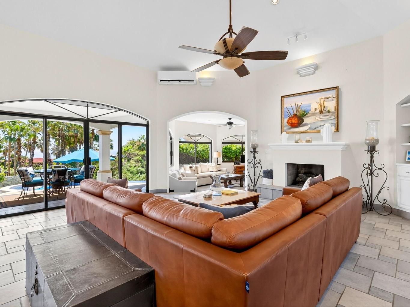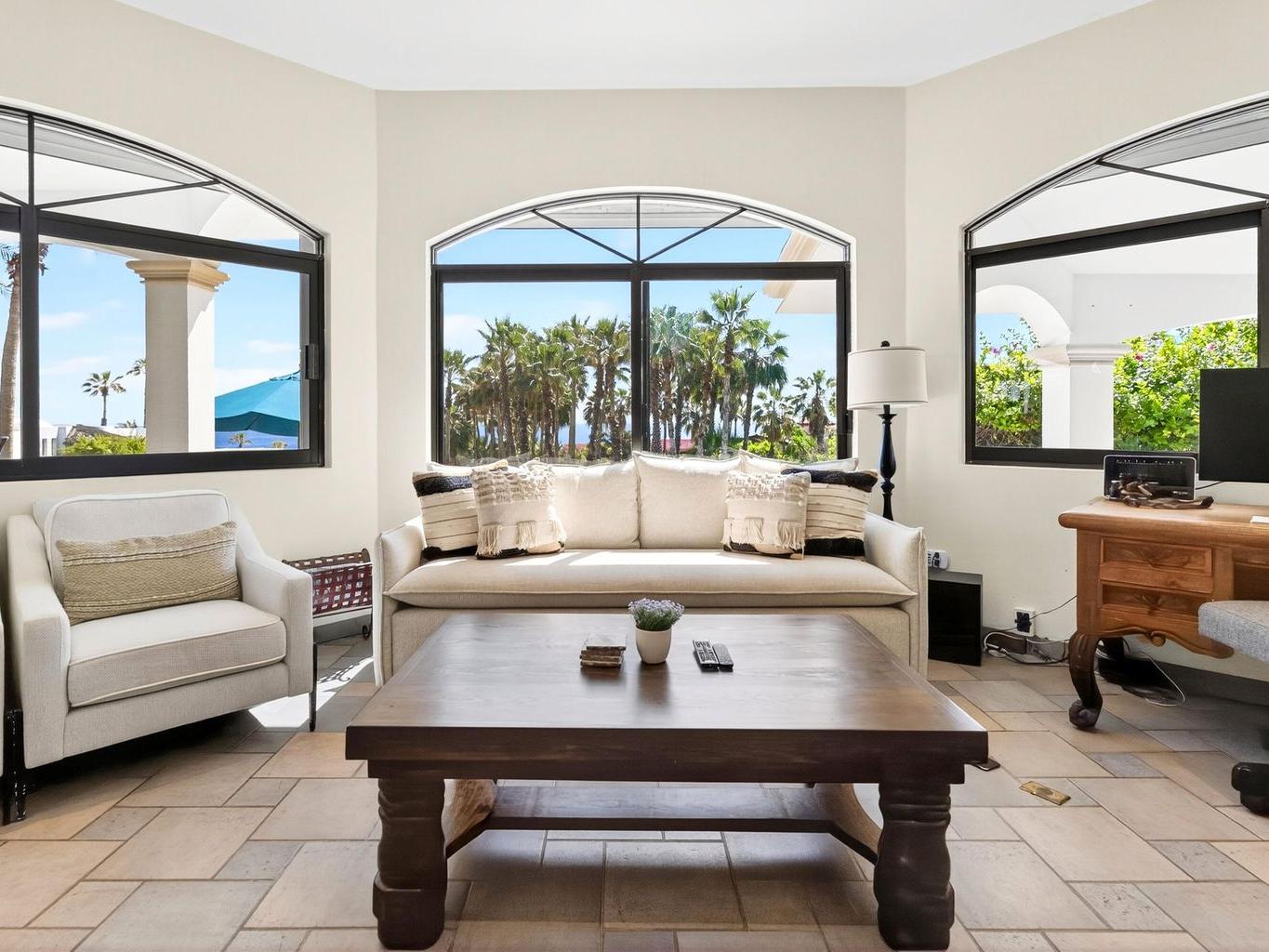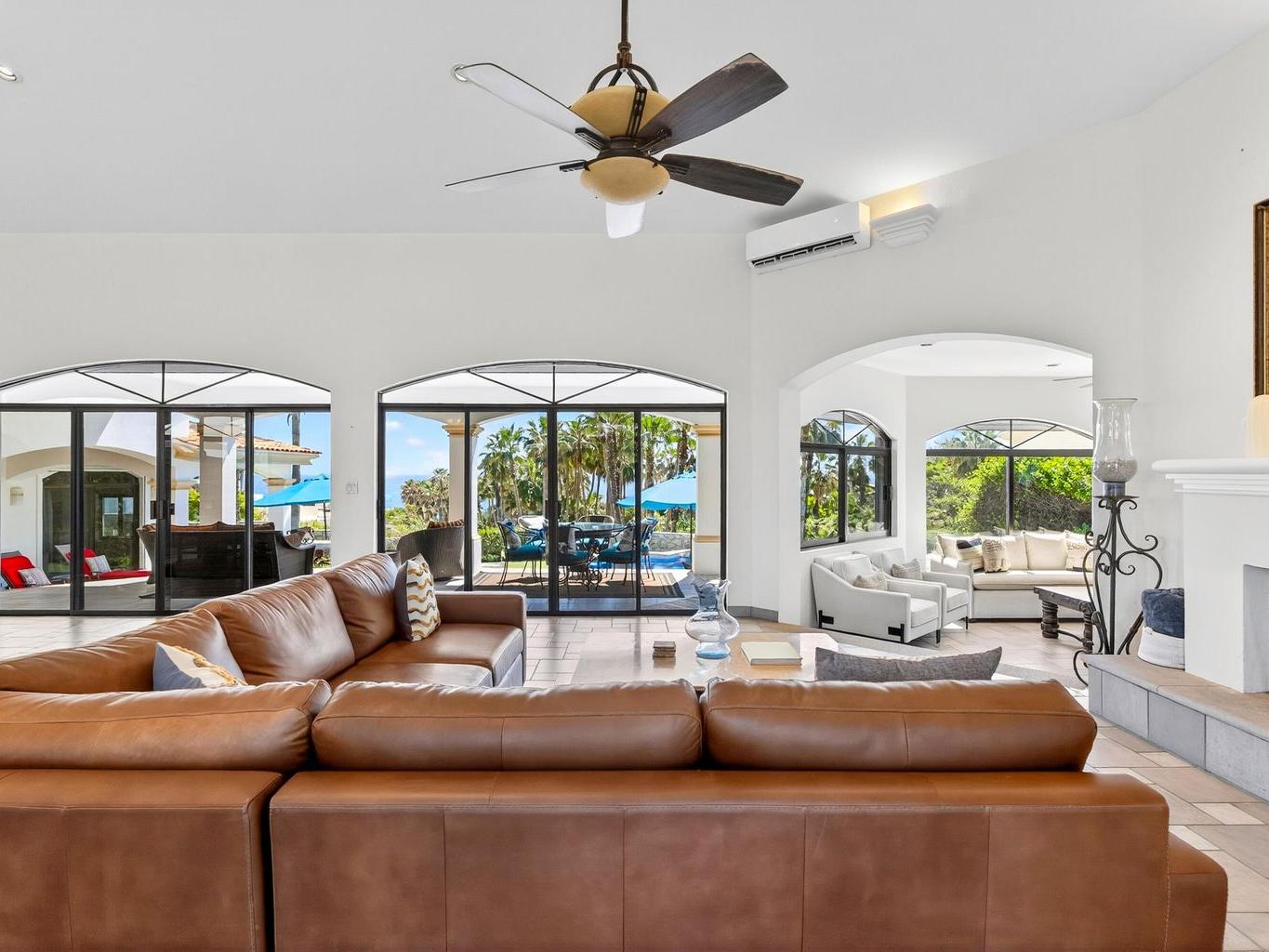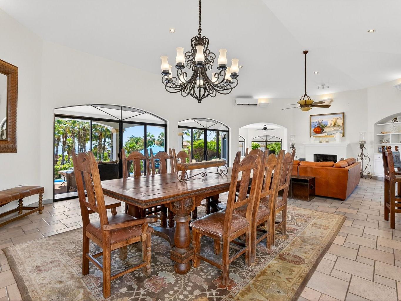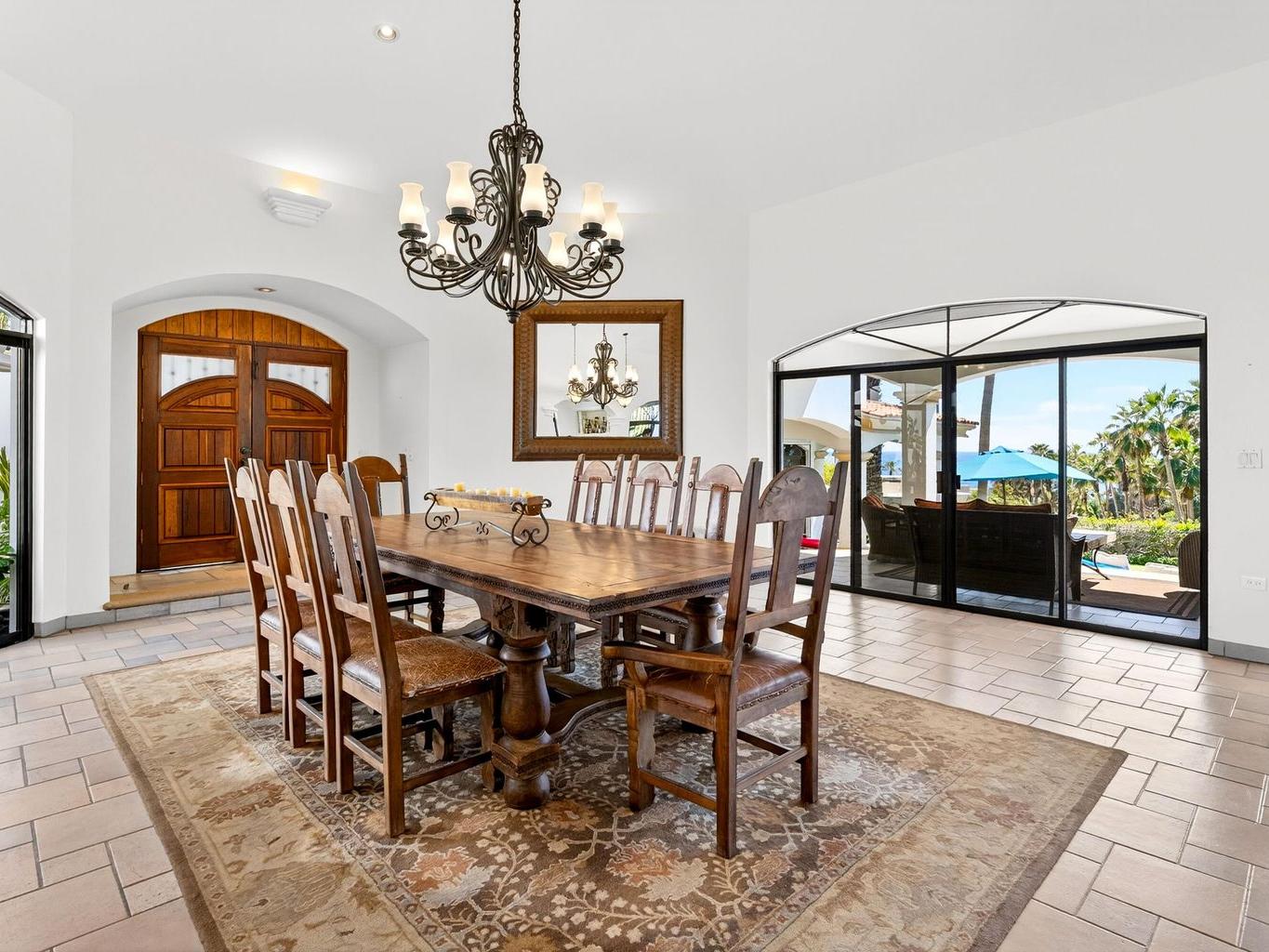 Amazing Residence Third Row from The Ocean in Sunny Cabo San Lucas! Located 10 min from downtown in Santa Carmela, one of the most sought-after residential communities in Los Cabos. This serene 6,135 Sqft Villa with 4 bedrooms and 4.5 baths seats on a big 1,506 Sqmt lot (over 1/3 of an acre) only a few steps from the ocean. It offers an exquisite ambience and an incredible back yard perfect for outdoor living and entertaining with ample covered terraces, heated infinity edge pool, jacuzzi, BBQ area and Bar, lounge area with fire pit, lush landscaping and even a pitch'n put. It features a TV room, office space, automatic roll down hurricane shutters, oversized laundry room with 2 sets of washer and dryer, water filtration system and an oversize garage that can fit a boat.