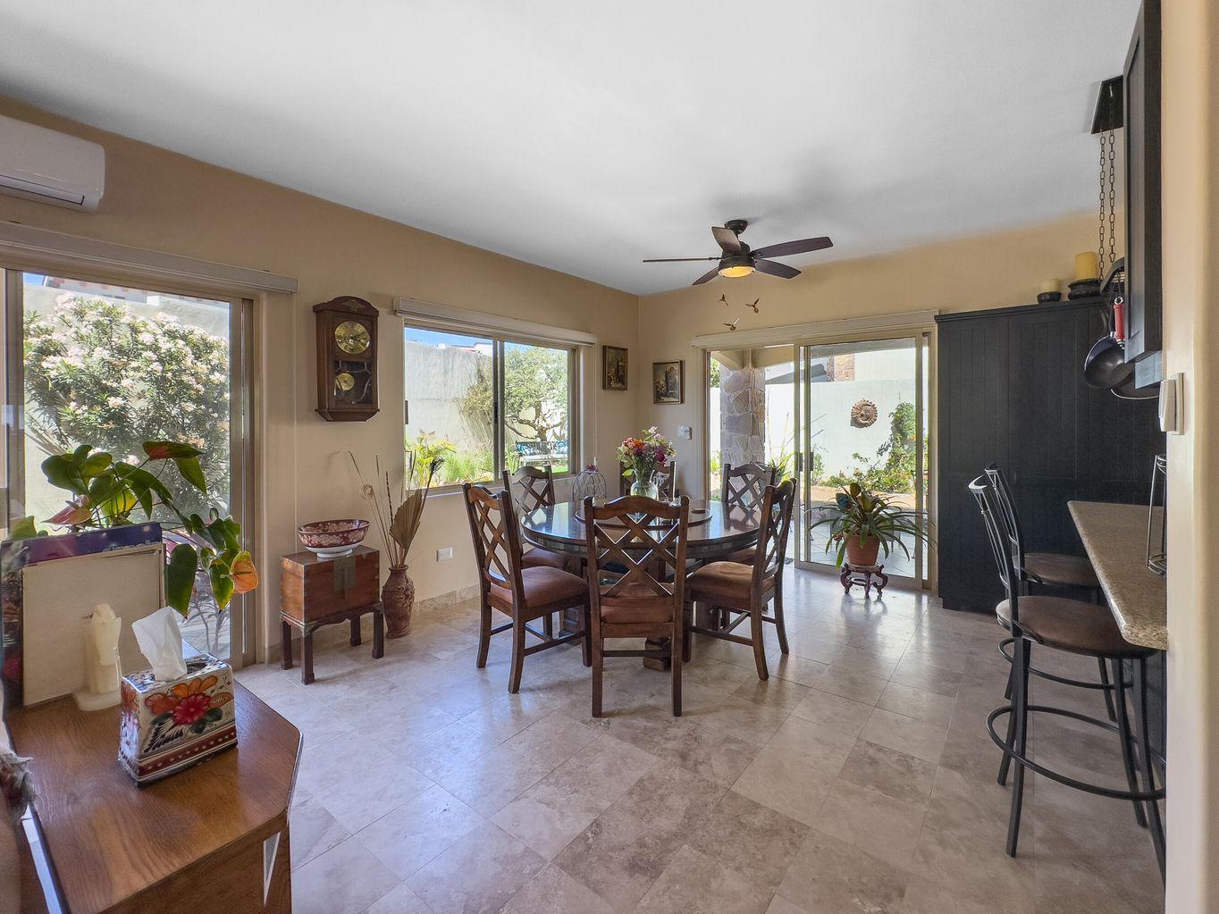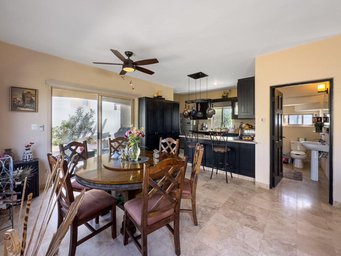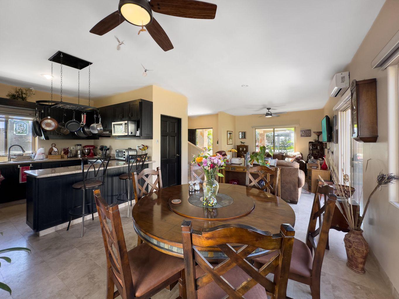 Casa Nano. A 3BD/2.5BA home set on one of the largest lots in the community, ideally located across from the clubhouse. Enjoy a private patio, spacious front and back yards, and room to add a pool or expand. The oversized rooftop terrace offers unobstructed panoramic ocean and sunset views that will never be blocked. Move in ready and fully furnished, perfect as a full time residence, vacation retreat, or investment. Ventanas offers low HOA fees, 24/7 security, pool, gym, playground, and clubhouse just minutes from downtown Cabo and the beach.