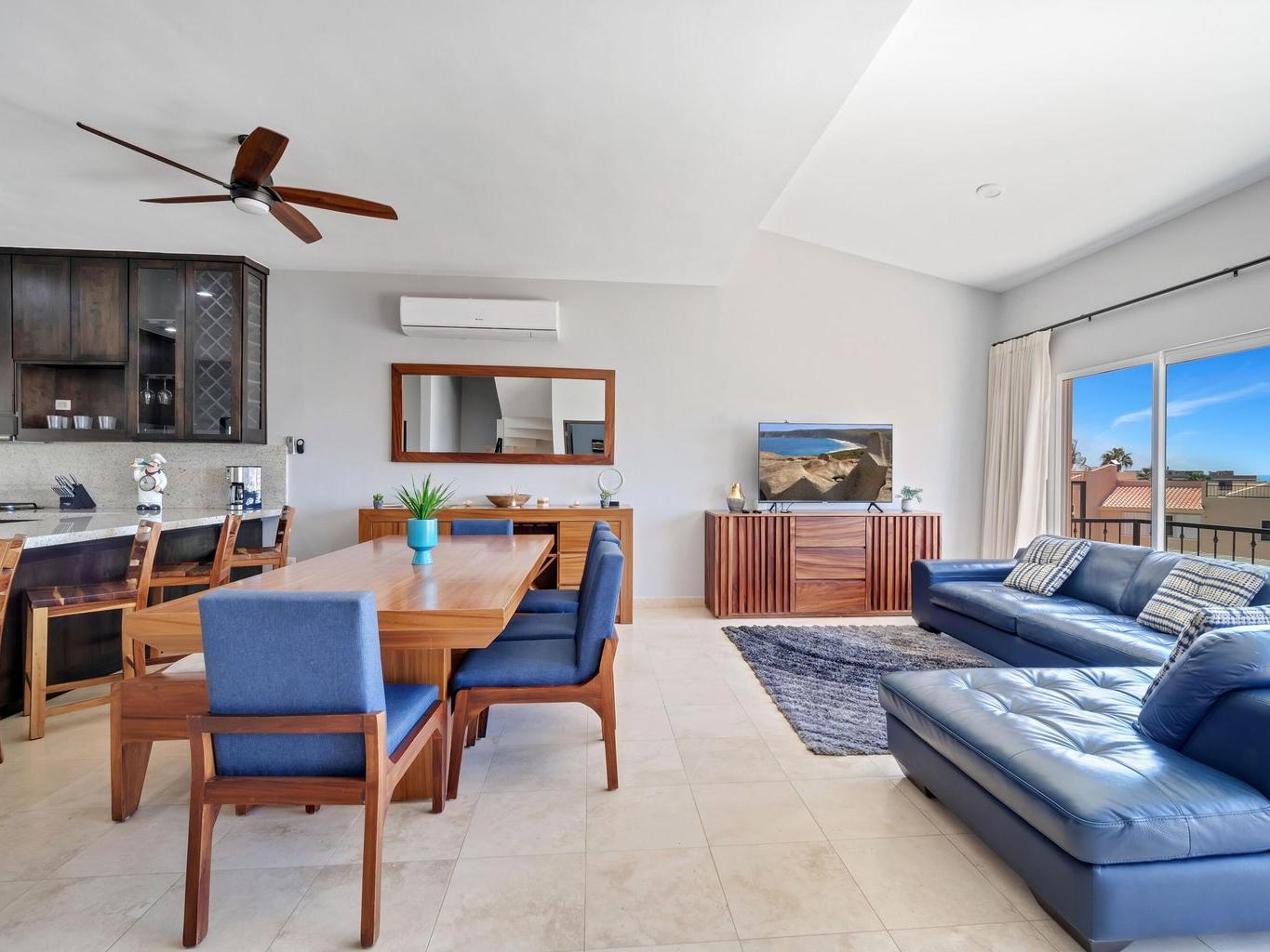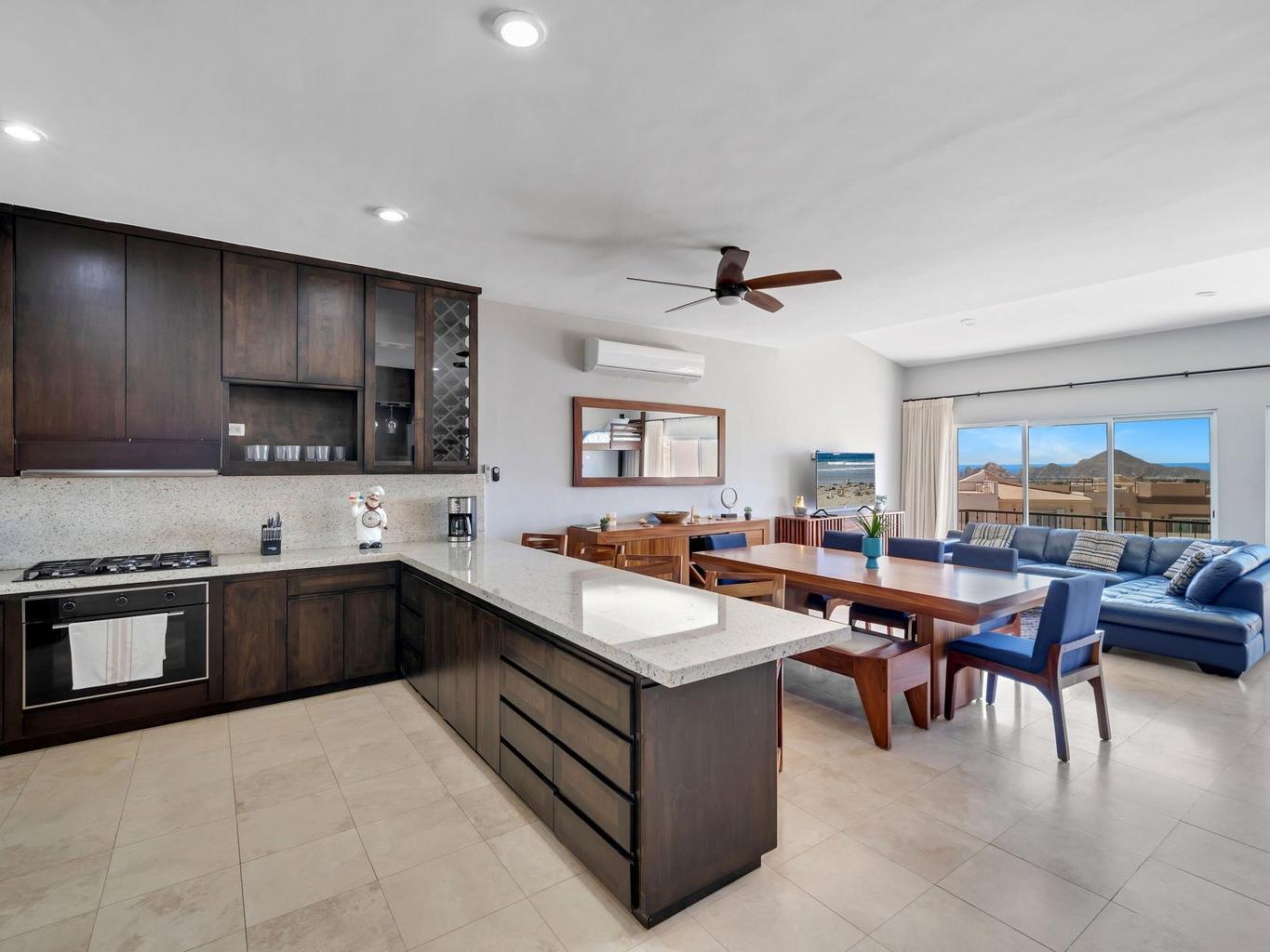Beautiful modern home in Villas del Tezal phase 2. Inside the home you will find a very large fully equipped Kitchen. The open floor plan leads to the living and dining room areas offering unobstructed lands end, ocean and city views. A large terrace is located off the back of the home on top of the covered parking, This large area is equipped with outdoor furniture, decor and BBQ. This area can be easily converted to a large 4th bedroom or master suite on the 2nd level. A half bath is also located on this floor. Heading up the stairs to the rooftop there is a large entertaining area with Jacuzzi and outdoor furniture to enjoy a panoramic view of all Cabo has to offer.