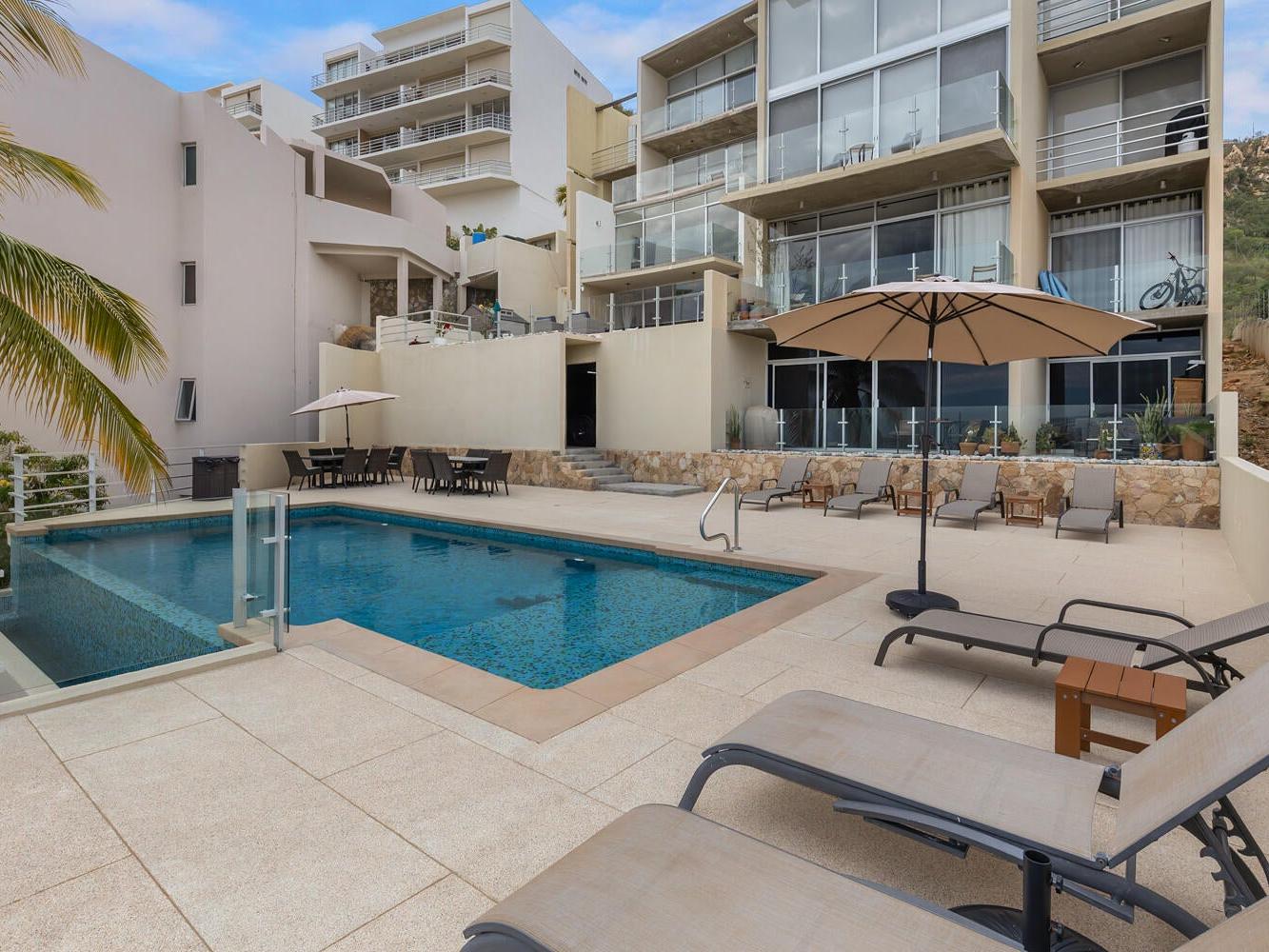 Residents of Blue Bay Plus enjoy a stunning ocean- and marina-view swimming pool, complete with lounge chairs—perfect for relaxing.