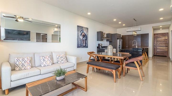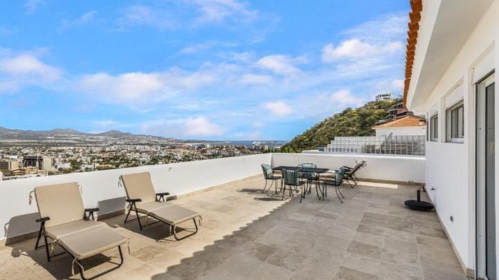 Located on Cabo's famous Medano Beach, this luxurious 3-bedroom condo offers a prime opportunity for those seeking a prestigious residence or a high-end investment. With panoramic views of the Sea of Cortez and Land's End from its private terraces, the condo perfectly blends modern design and traditional Mexican touches. The spacious living and dining areas, framed by floor-to-ceiling windows, feature rich wood finishes and tonal walls, creating a warm and inviting atmosphere. The kitchen is outfitted with top-of-the-line Viking appliances, perfect for culinary enthusiasts or hosting gatherings.