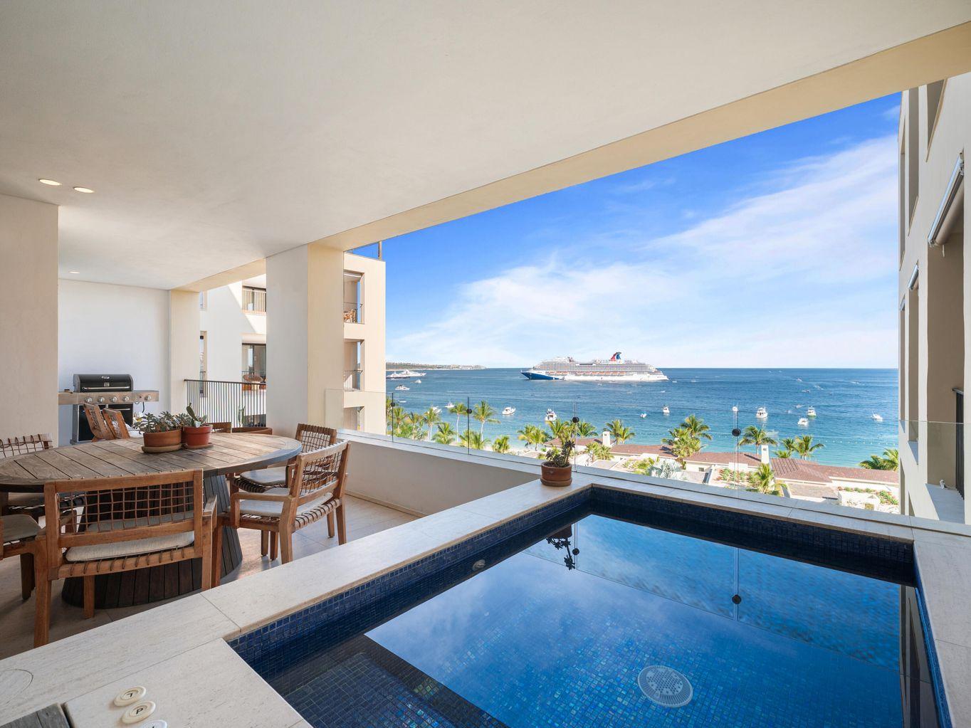 Residence 7-401 is a spacious 3-bedroom lock-off with a thoughtfully planned layout, located within the coveted 1 Homes Cabo, on the fourth floor of Building Seven, offering direct ocean views to Land's End and marina views from two expansive terraces, each with its own plunge pool.