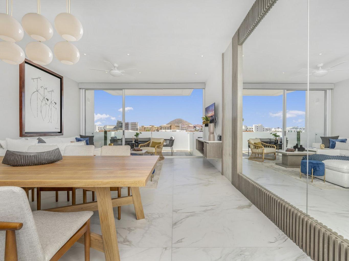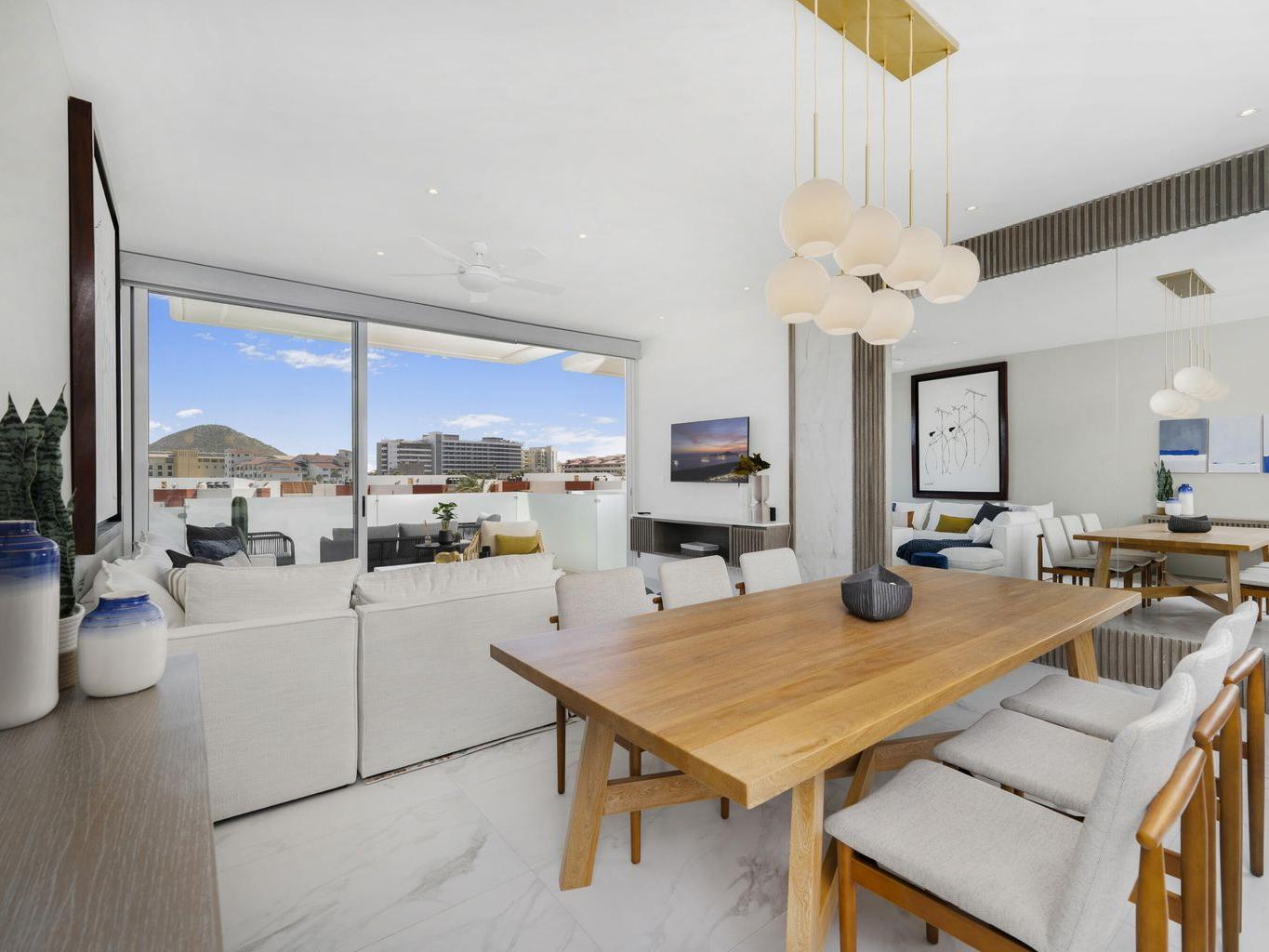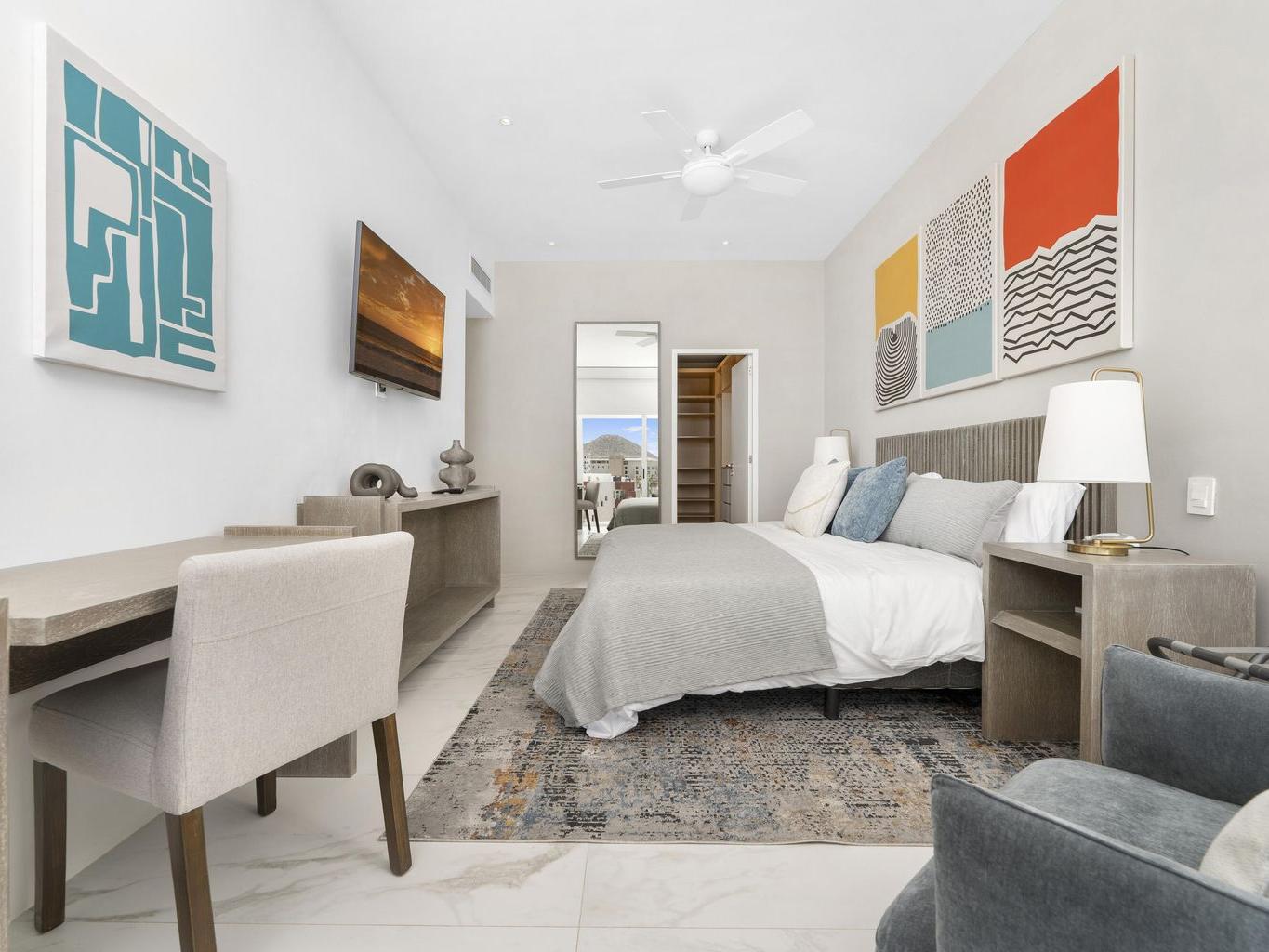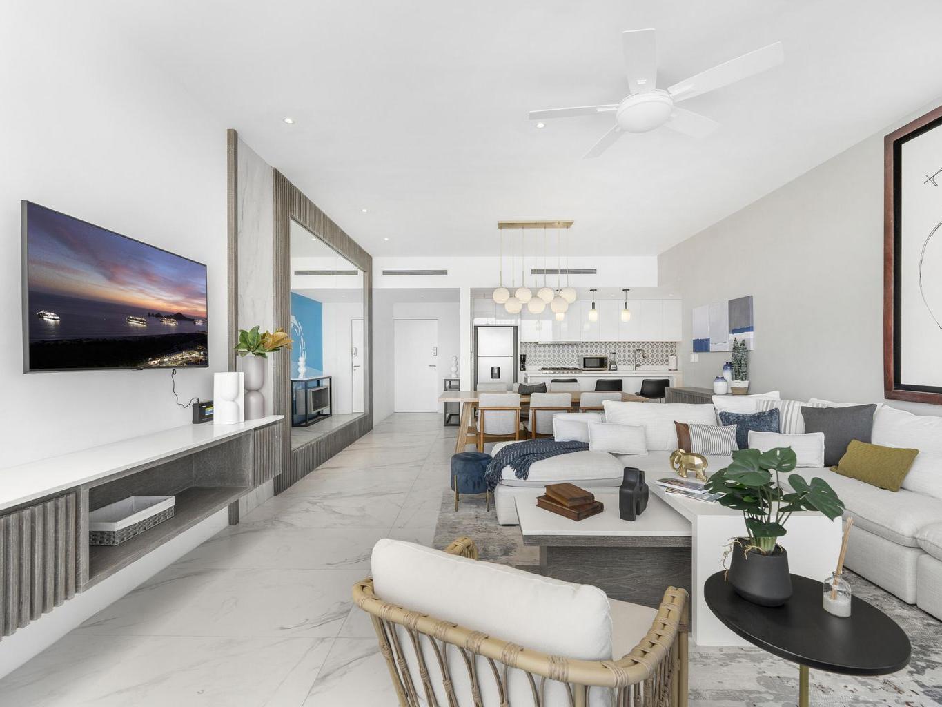 This contemporary condo in Marea, Cabo San Lucas, offers 1480 sq. ft. of sophisticated living space. The open-concept design seamlessly integrates the living, dining, and kitchen areas, adorned with sleek white cabinetry and modern appliances. Floor-to-ceiling windows flood the space with natural light and showcase stunning city views. The bedrooms feature plush furnishings and ample storage, while the bathrooms boast elegant fixtures and glass-enclosed showers. A private balcony provides an ideal outdoor relaxation spot. Additional amenities include a walk-in closet and stylish accent walls, creating a perfect blend of comfort and luxury in this coastal paradise.
