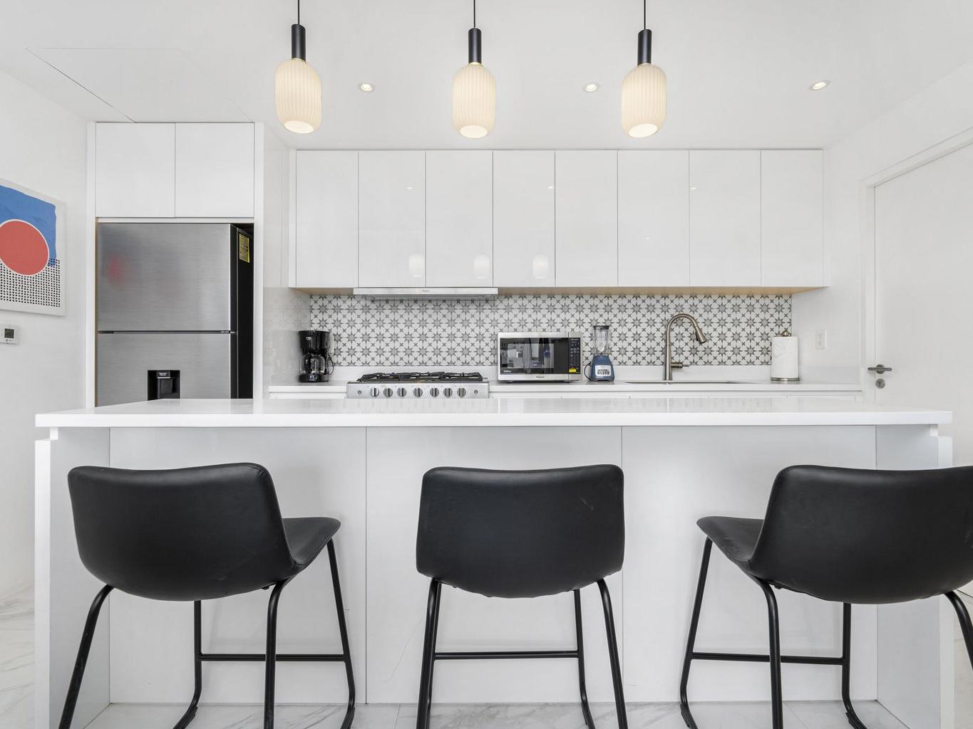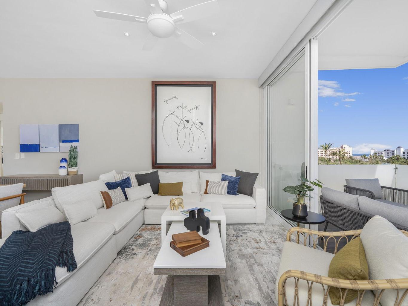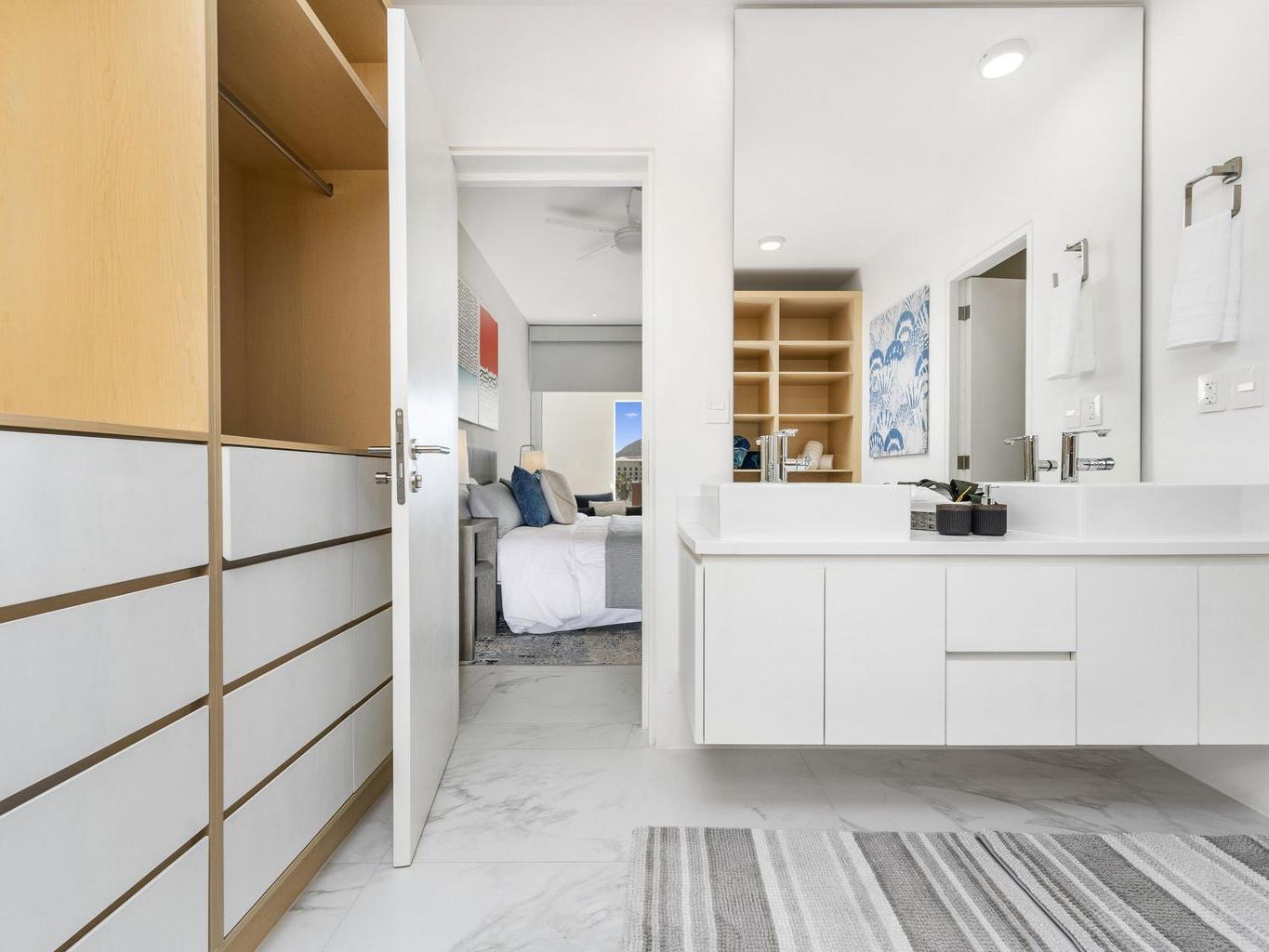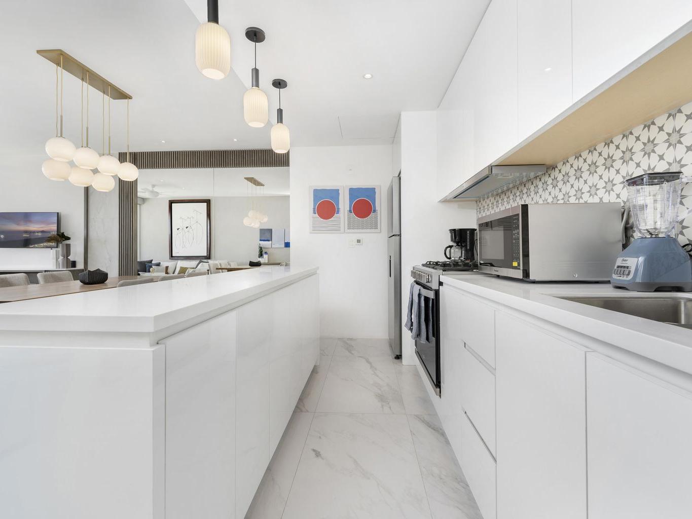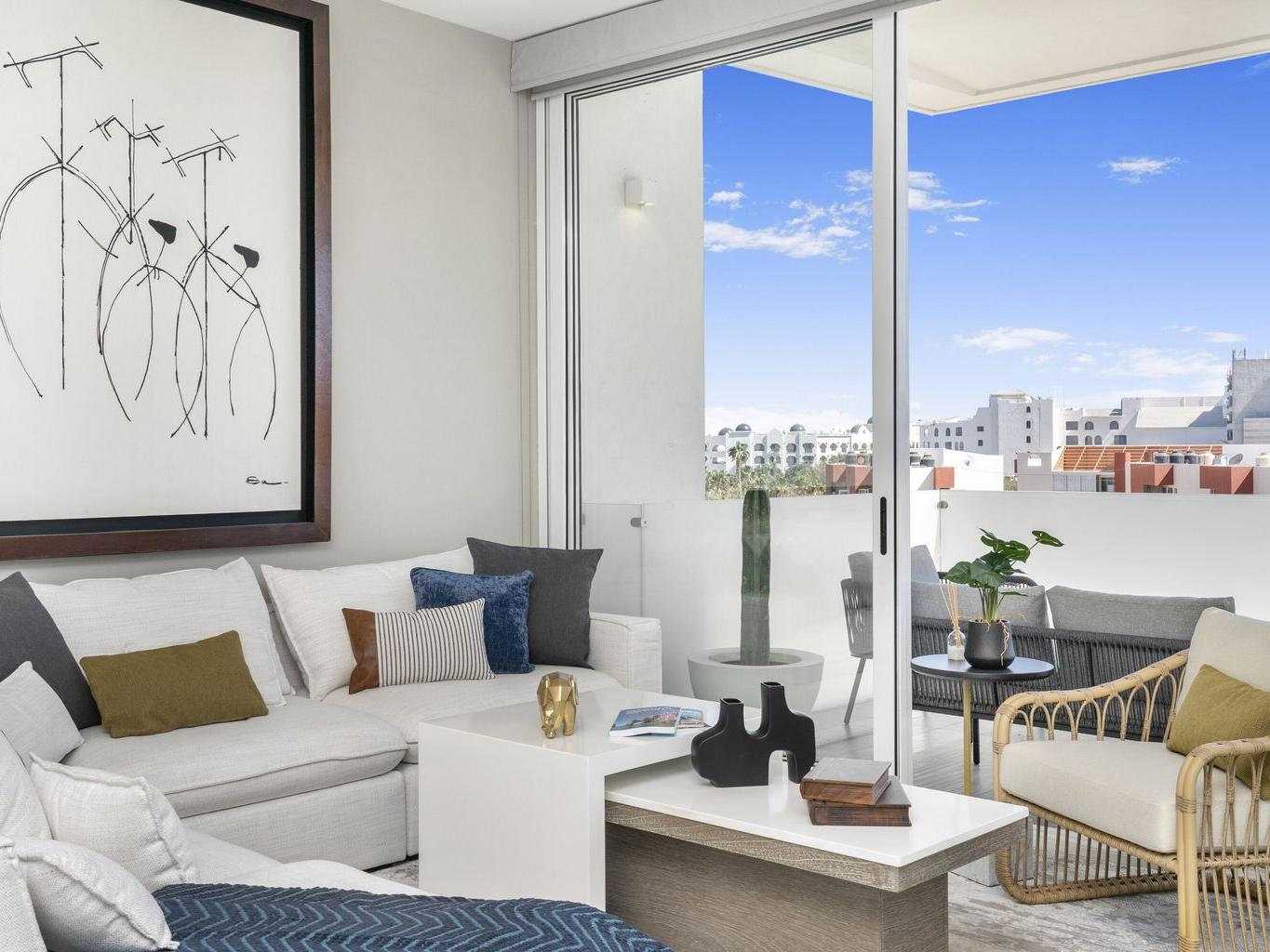 This contemporary condo in Marea, Cabo San Lucas, offers 1480 sq. ft. of sophisticated living space. The open-concept design seamlessly integrates the living, dining, and kitchen areas, adorned with sleek white cabinetry and modern appliances. Floor-to-ceiling windows flood the space with natural light and showcase stunning city views. The bedrooms feature plush furnishings and ample storage, while the bathrooms boast elegant fixtures and glass-enclosed showers. A private balcony provides an ideal outdoor relaxation spot. Additional amenities include a walk-in closet and stylish accent walls, creating a perfect blend of comfort and luxury in this coastal paradise.