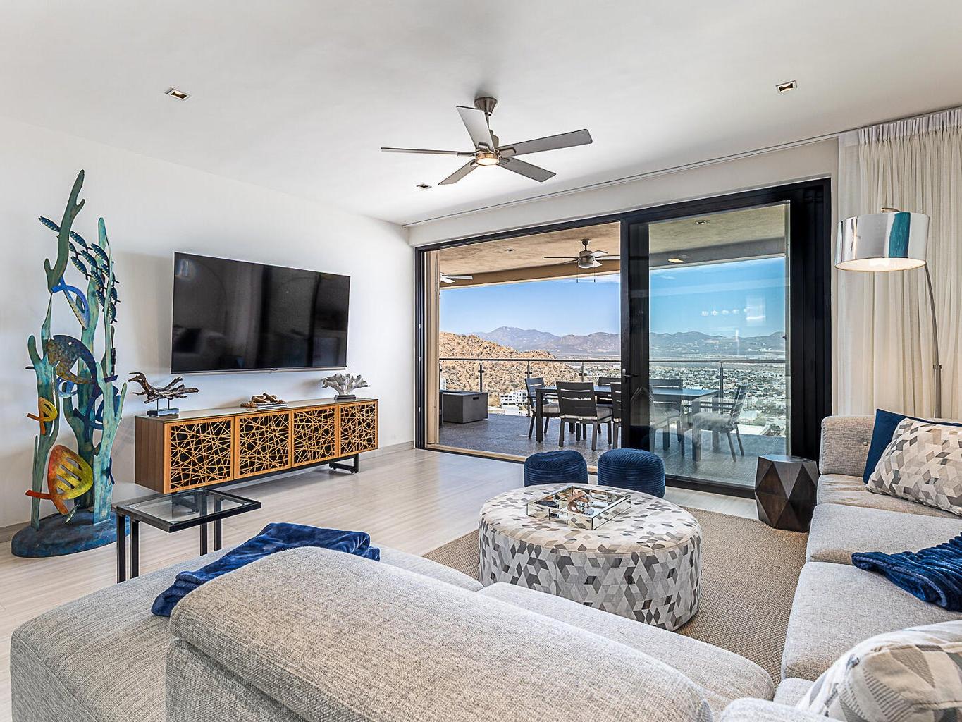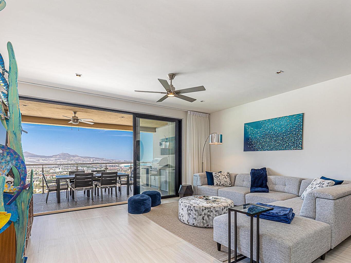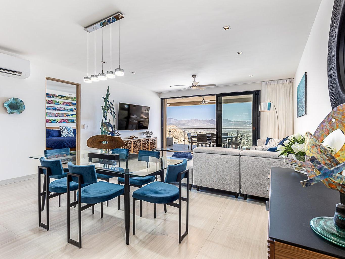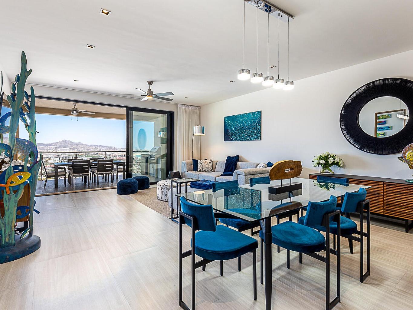 Located within the Monteluna residences in the Pedregal community of Cabo San Lucas, this newly completed seventh-floor condominium offers wide-ranging views of the city, marina, and bay from a private terrace designed for outdoor living. The floor plan includes three bedrooms and three and a half bathrooms across 2,000 sq ft of space. The residence is offered turnkey and includes notable upgrades such as high end furniture, double-pane hurricane-rated windows and doors, Hurricane Shutters, built-in outdoor BBQ, reverse osmosis water filtration, fiber optic connectivity, non-slip exterior flooring, ceiling fans, fire pit and two assigned covered parking spaces.