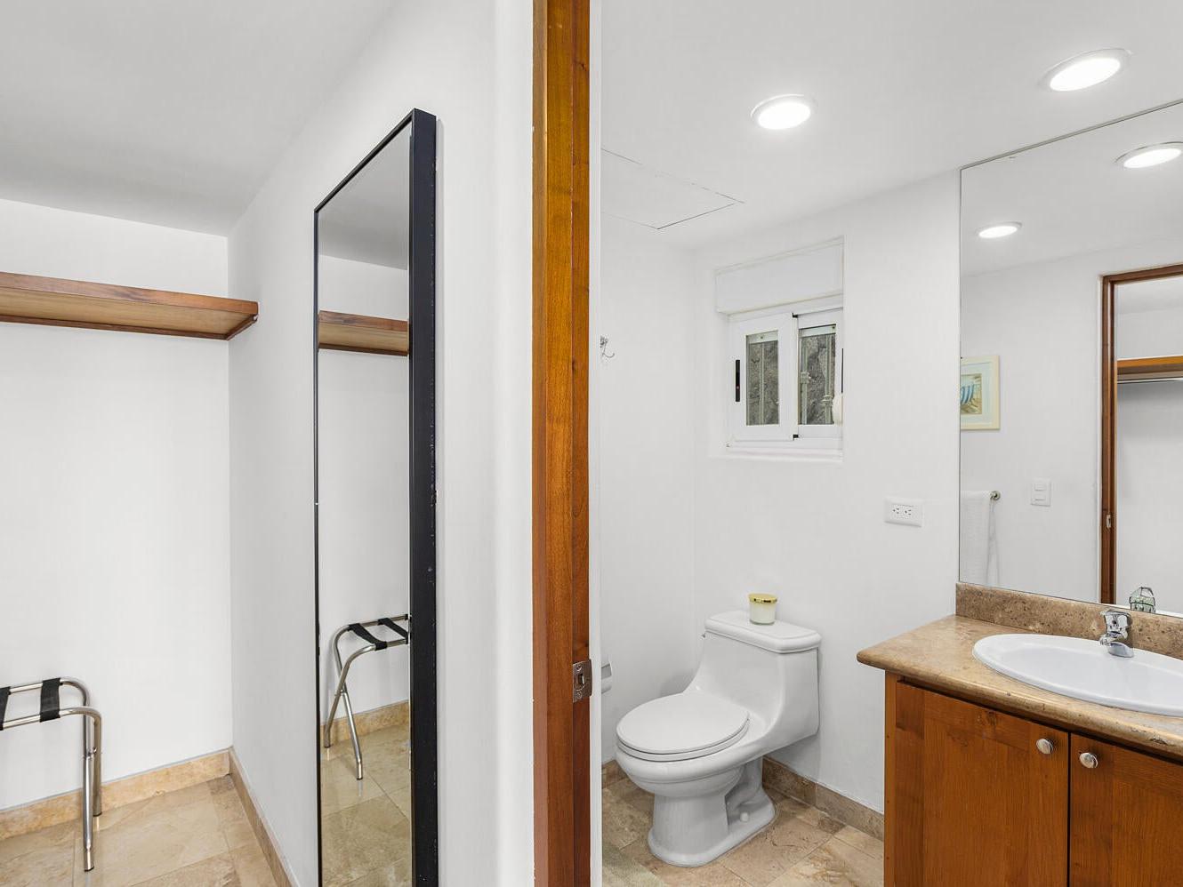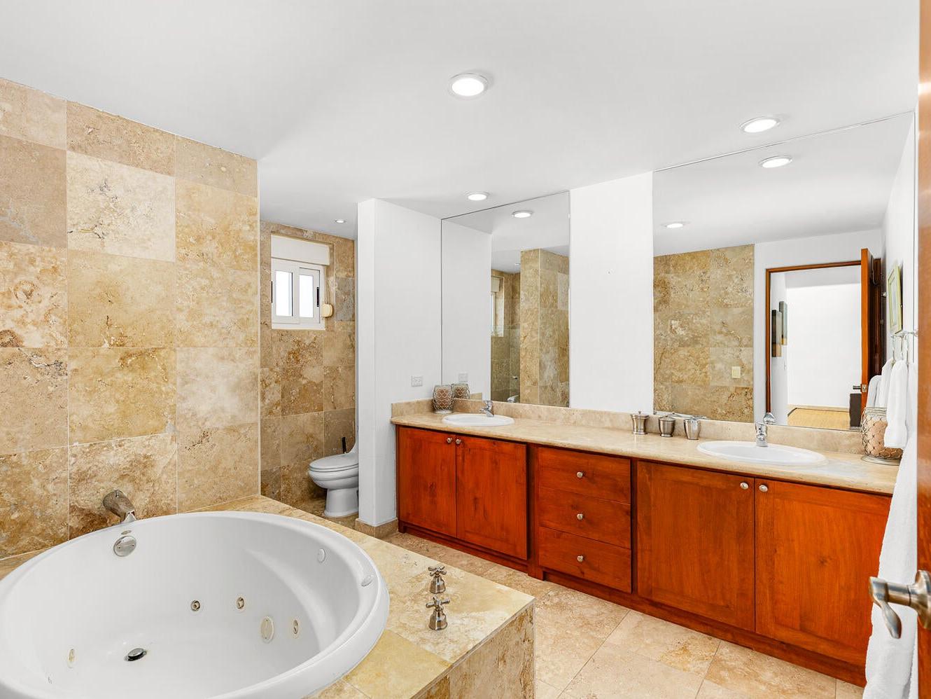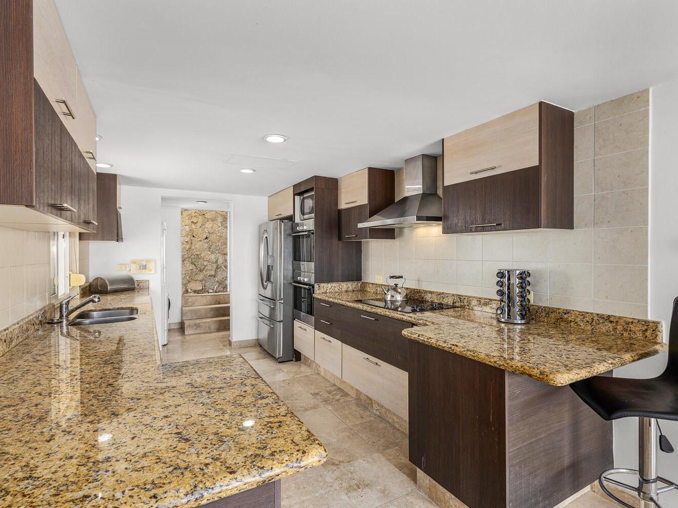 The residence features 3 bedrooms and 3 bathrooms, travertine marble floors, granite kitchen countertops, and two spacious terraces designed for indoor-outdoor living. The main level includes the kitchen, living area, and two guest bedrooms, while the upper level is dedicated to the primary suite with ensuite bathroom and private terrace, providing privacy for owners and guests alike.