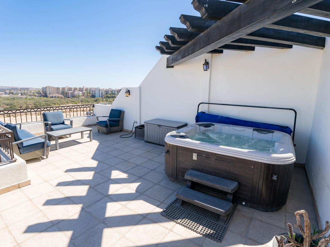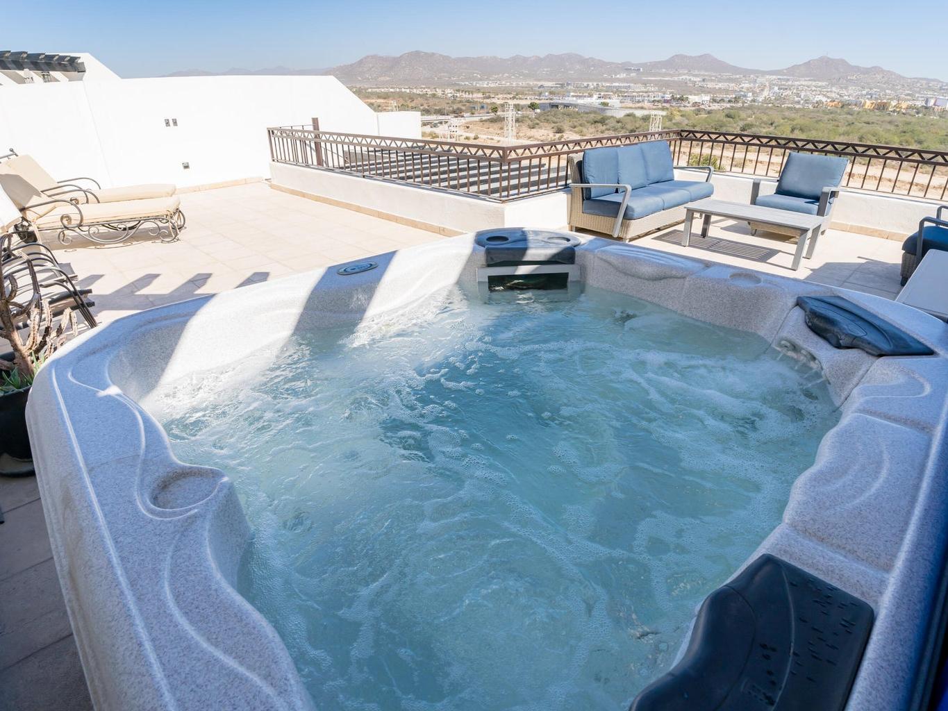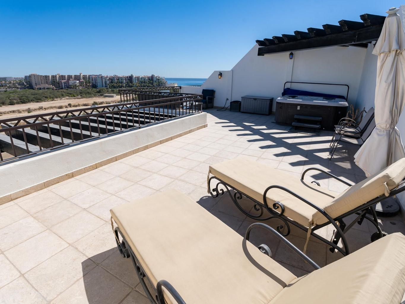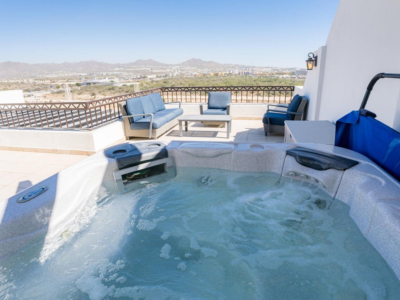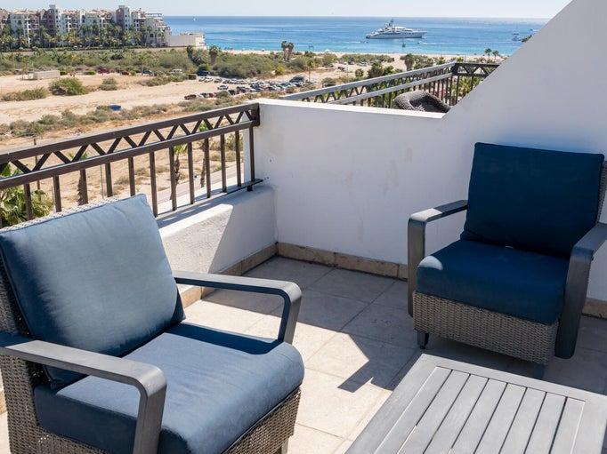 TURN KEY!! Luxury penthouse living in the heart of Cabo San Lucas. This fully furnished 2-bedroom, 2-bathroom residence features a private rooftop terrace complete with jacuzzi, lounge seating, and sitting area, offering panoramic views of iconic Medano Beach.