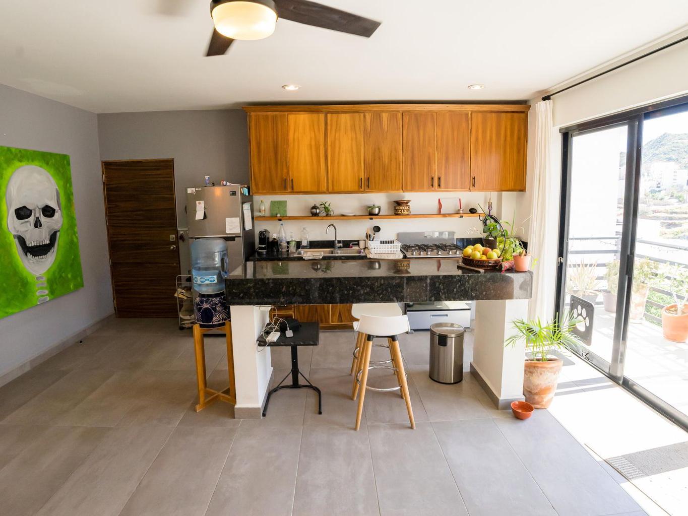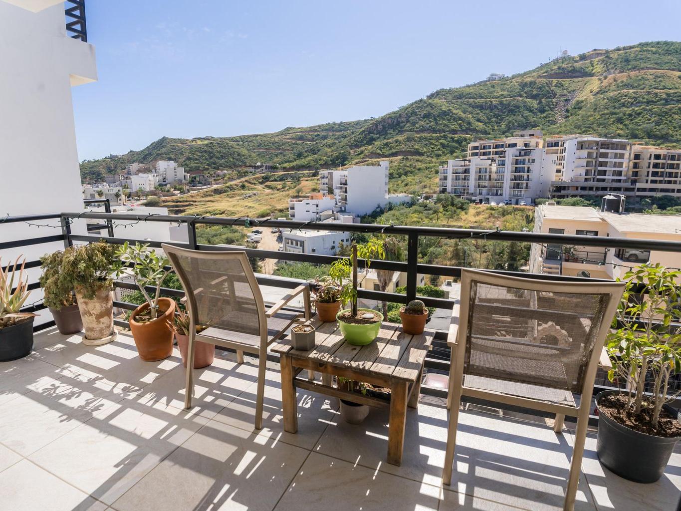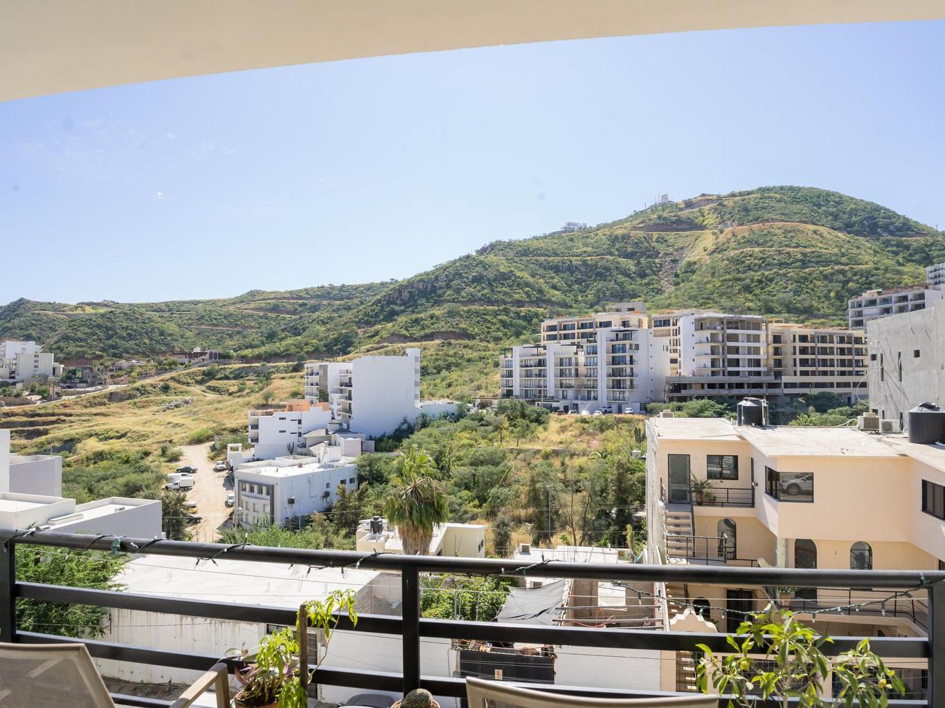 Spacious 1Br Turn Key Condo, just minutes walking to Downtown Cabo! Ready to move in, partly furnished with Sofa, Coffee Table, King Size bed, Side Tables. Top floor with beautiful Mountain views, an oversized Bedroom, and giant walk in closet! Just minutes walking to 100s of Bars & Restaurants. To Rent or Retire in there is no more competitive unit in the neighborhood!