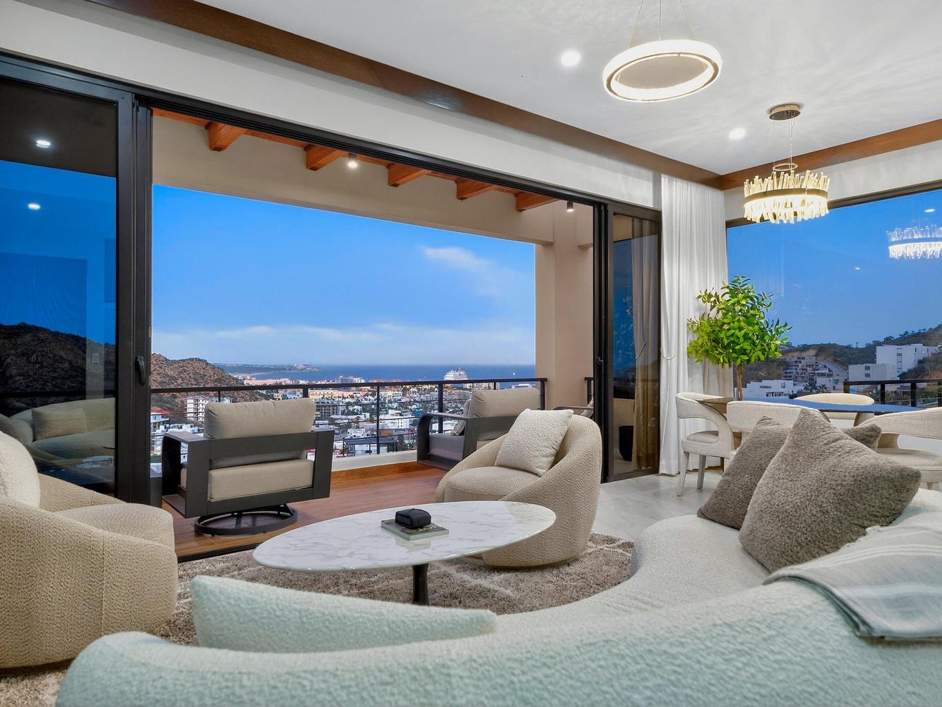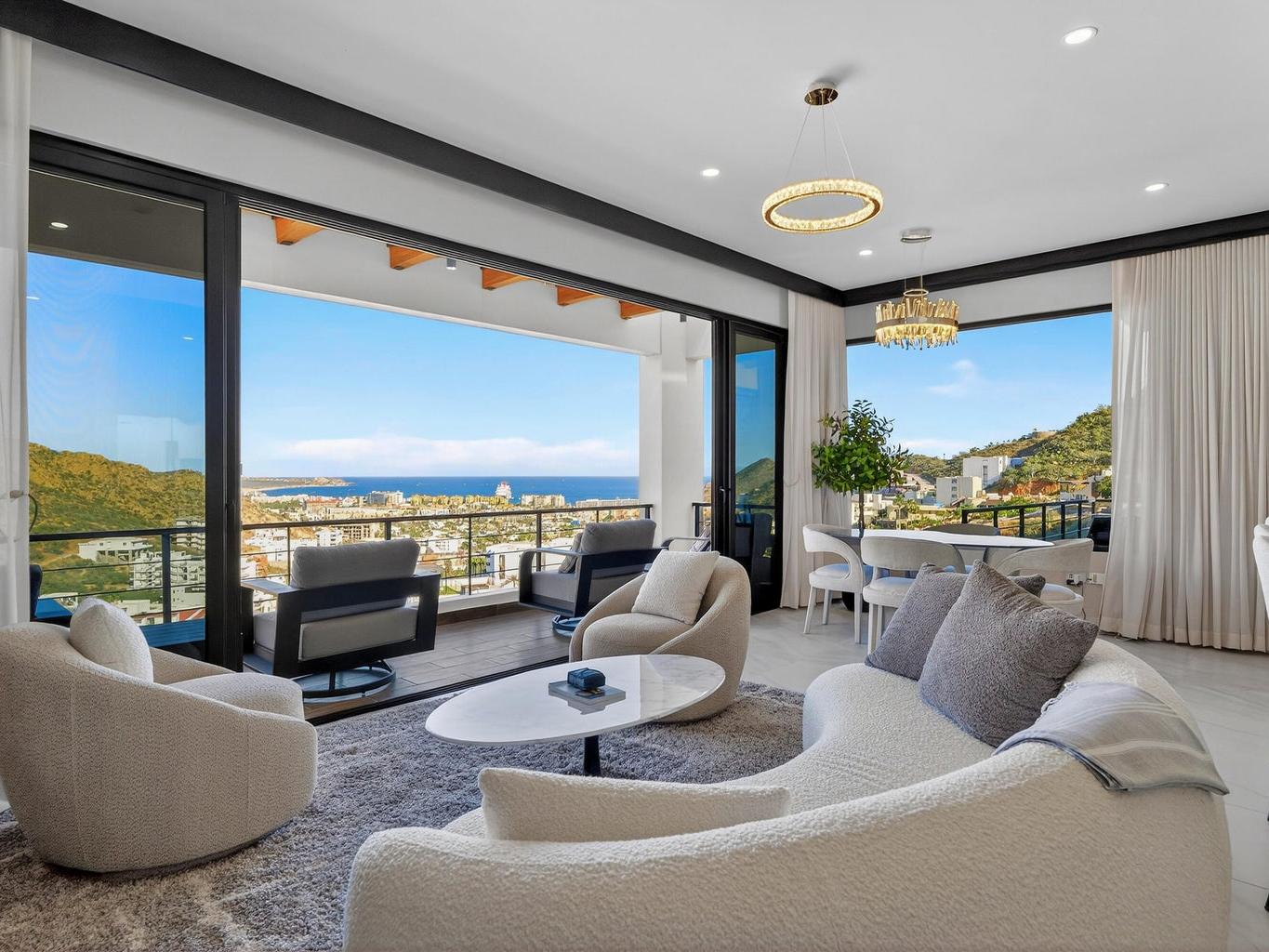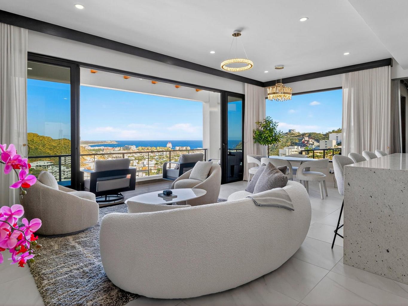Exceptional corner penthouse in Vista Mare offering protected, unobstructable ''forever views'' over Medano Bay, the marina, cruise ships, city lights, and surrounding mountains. Located in the highly desirable Sunset Corridor just outside Pedregal, this residence combines panoramic views with rare walkability -- approximately 10 minutes to downtown Cabo and the marina with no major highways to cross.