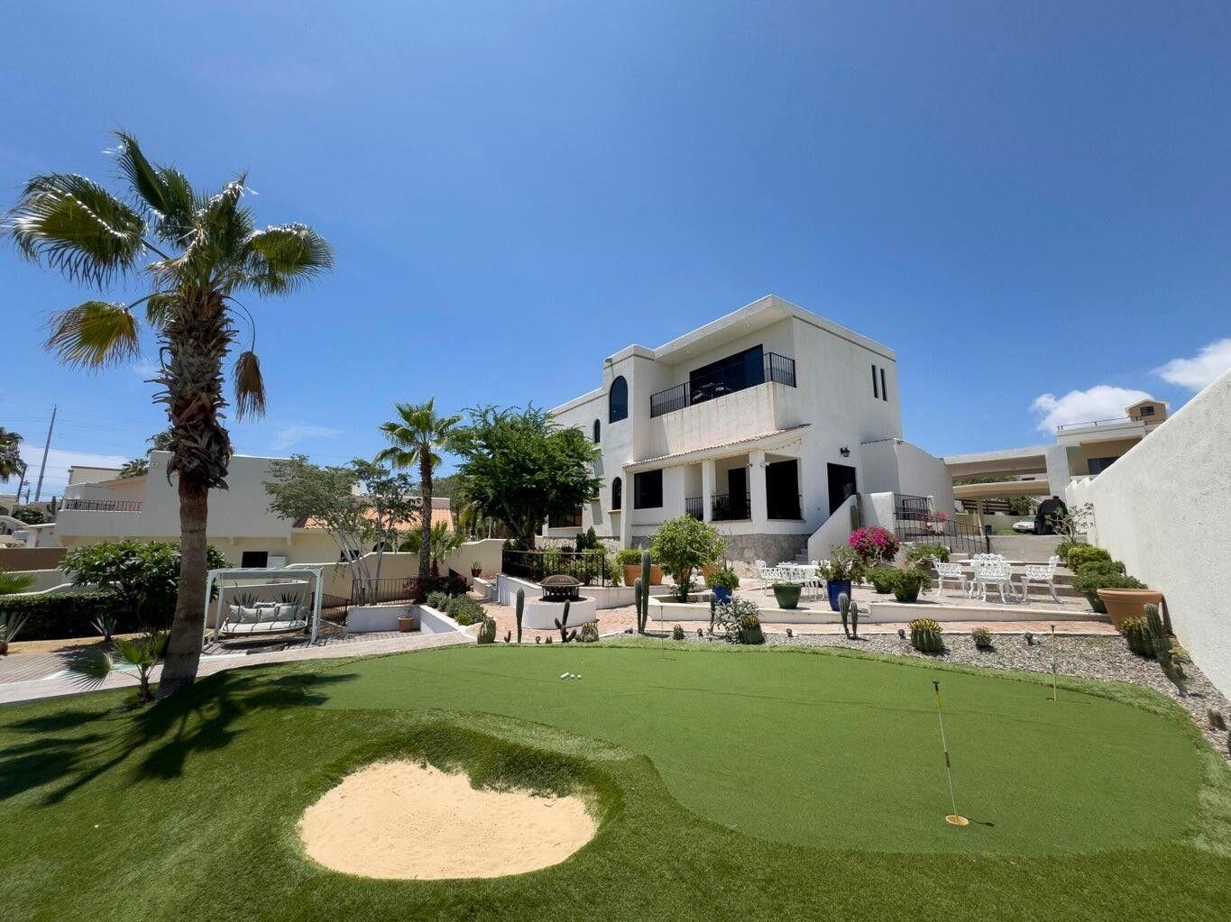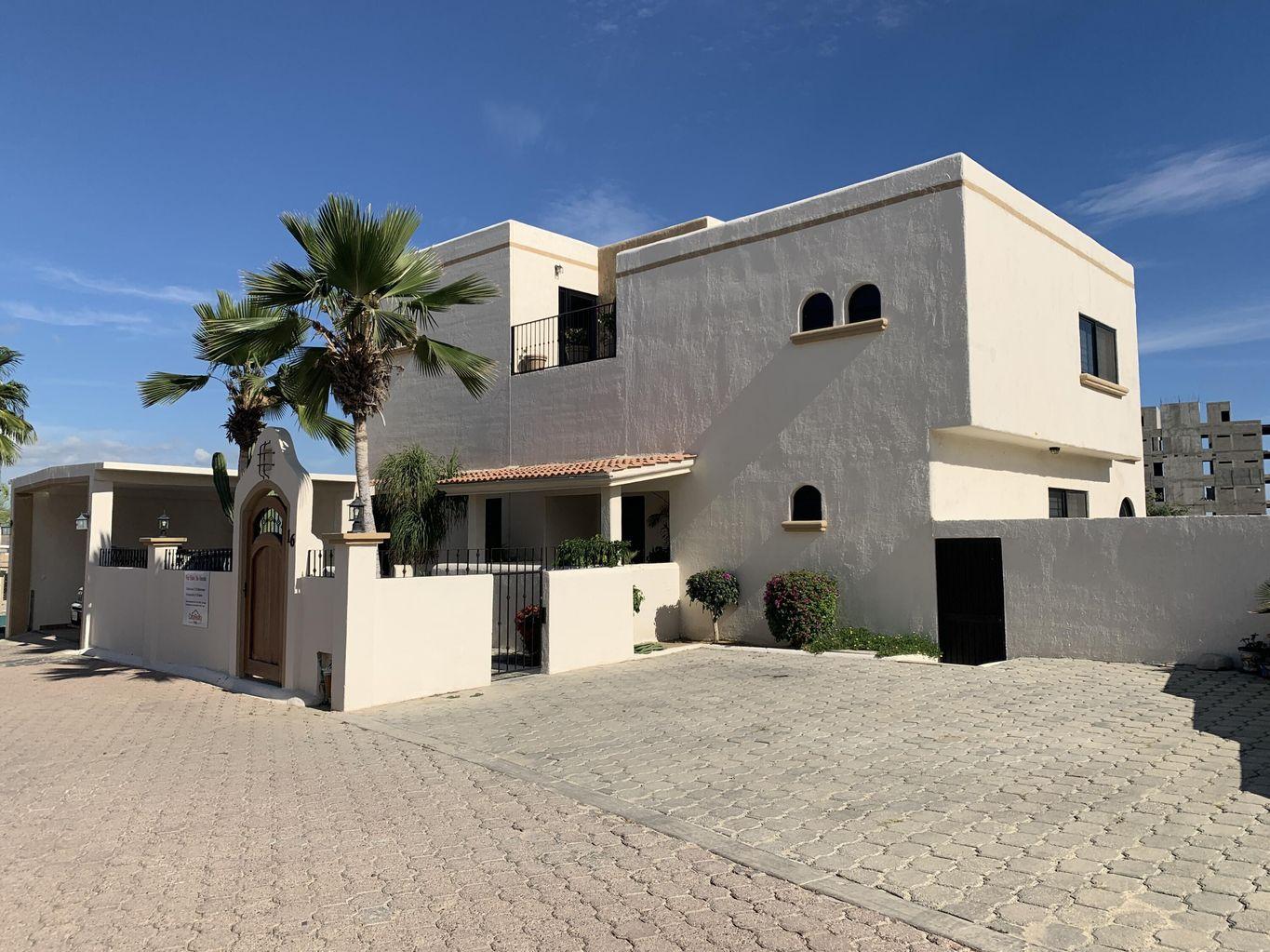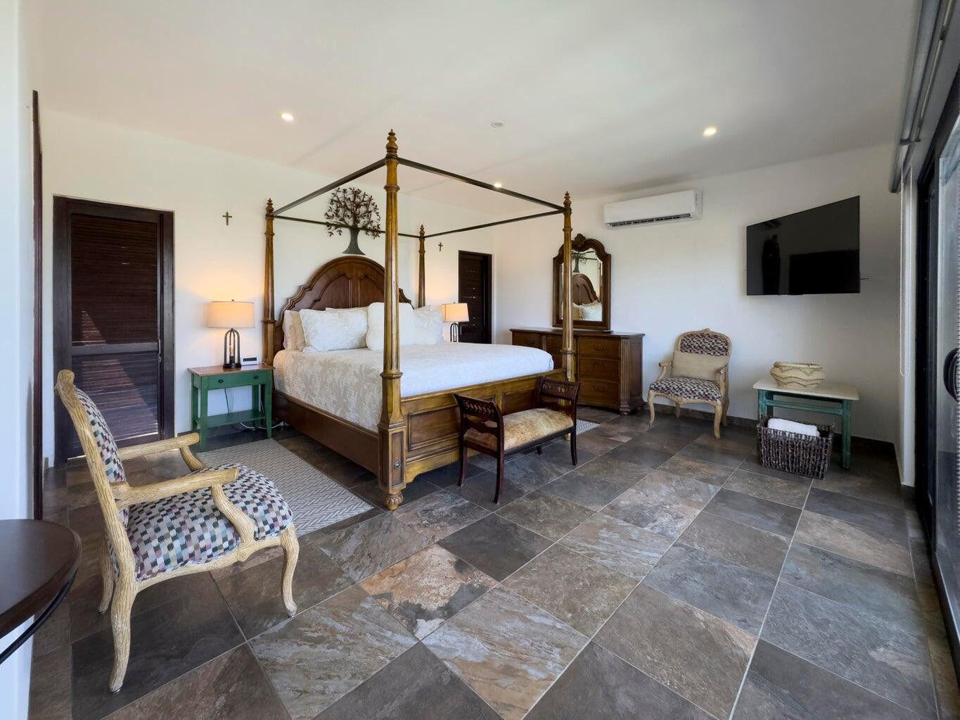 The master bedroom provides a serene escape with panoramic views across the rugged desert landscape, revealing a stunning backdrop of the blue water ocean.