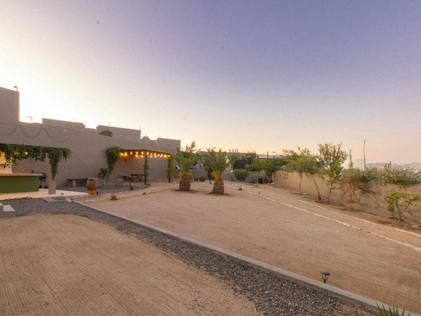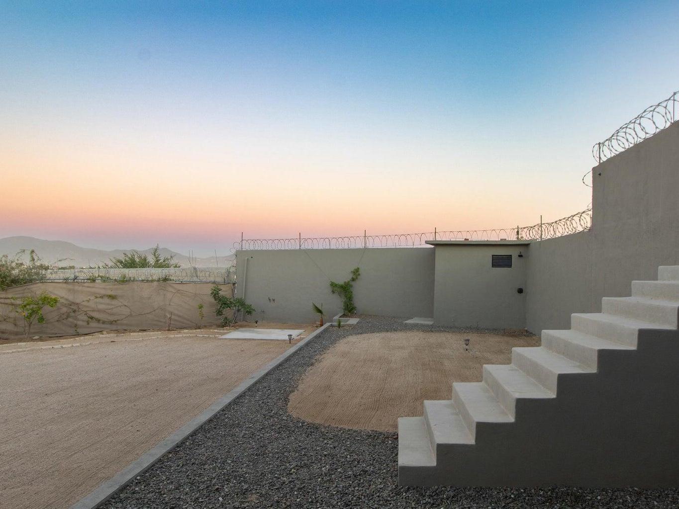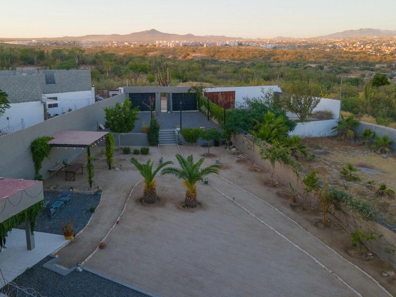 This fully gated property offers privacy and security, featuring a complete kitchen, bathroom, and pergola, making it ideal for comfortable living while you build a house. It includes a garage, efficient irrigation system, and a variety of fruit trees. A 25,000-liter water cistern ensures reliable water storage. Conveniently located just minutes from shopping and dining plazas, with quick access to the highway to La Paz and San José, this lot combines tranquility, practicality, and excellent potential for residential or commercial development.