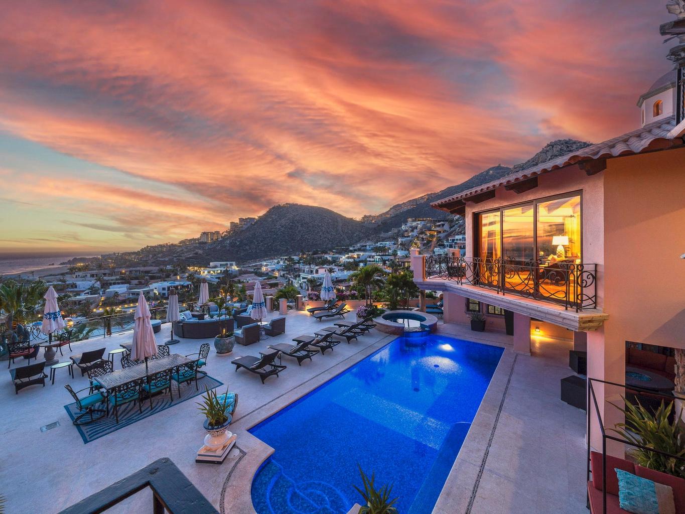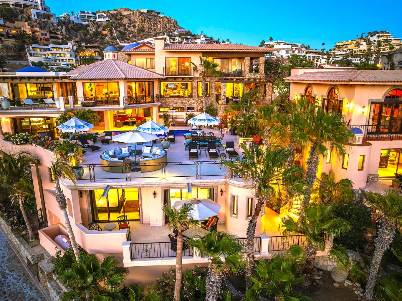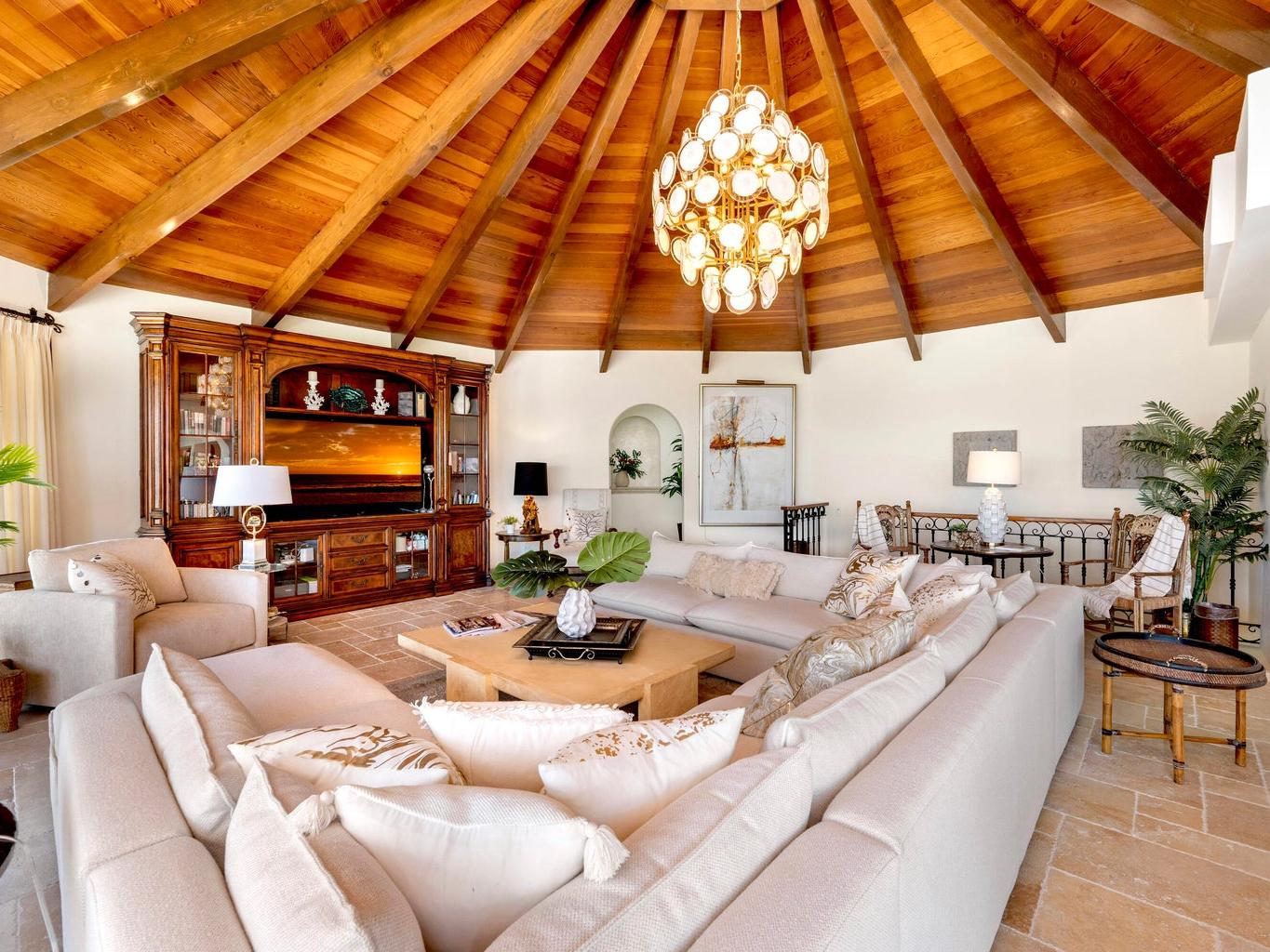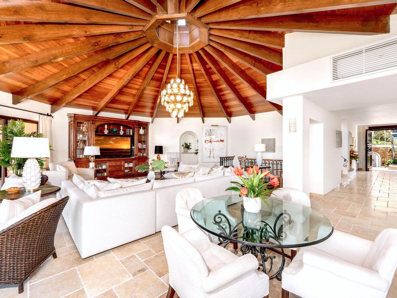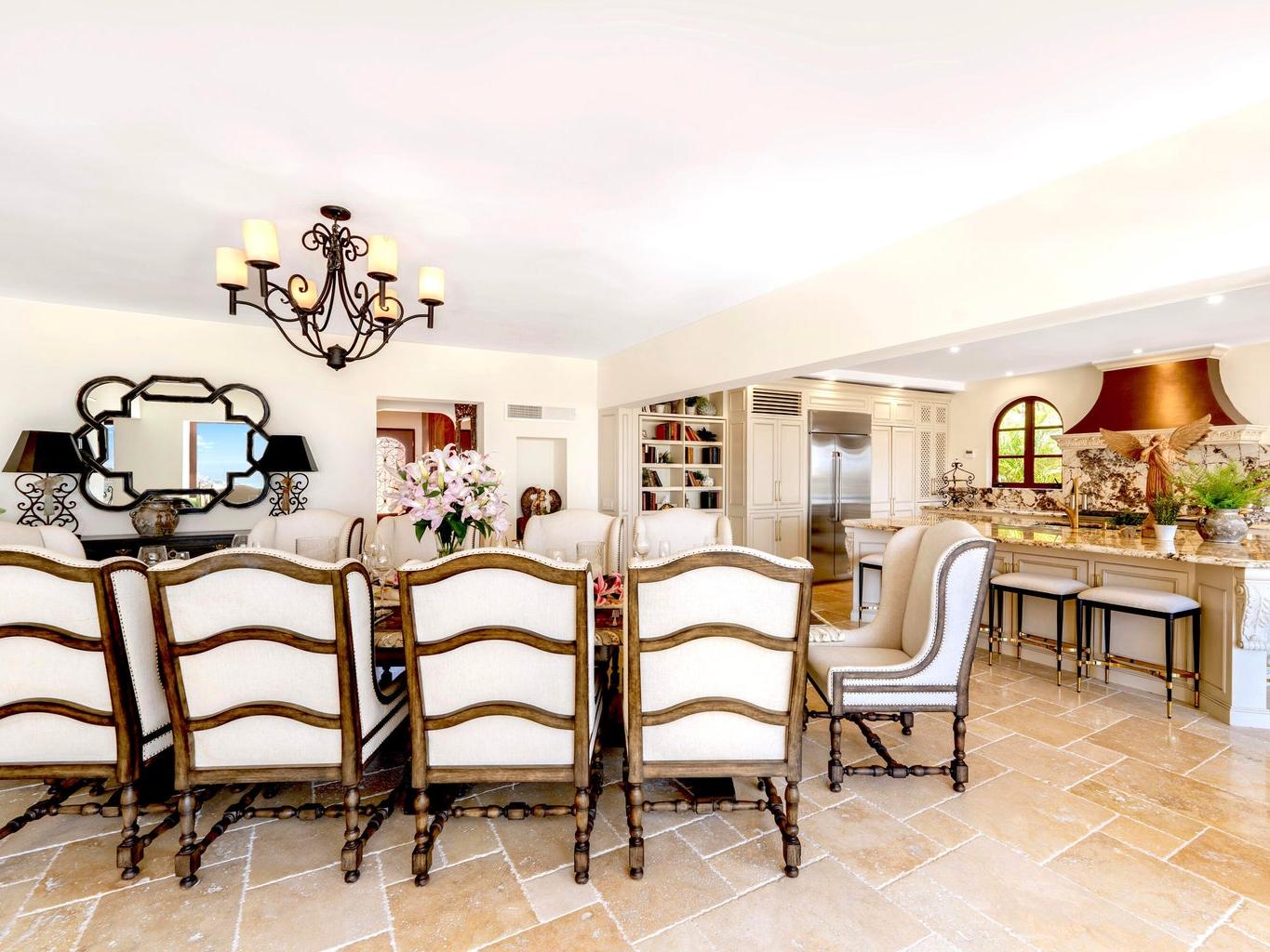 Experience the epitome of luxury living with this unique, extraordinary nine-bedroom home with 11 full size bathrooms boasting the soothing sounds of the ocean and breathtaking sunset views. Indulge in culinary delights with multiple chef's kitchens and elegant fine dining terraces. Relax in the two pools and jacuzzi or unwind in the serene massage room. Host in style in the spacious entertainment room complete with a bar. Admire the meticulous craftsmanship of the wooden ceiling in the main living room, offering captivating ocean vistas. Additional amenities include a wine cellar, three fountains, an outdoor grill and lush garden surroundings. Excellent INVESTMENT property for corporate retreats and weddings.