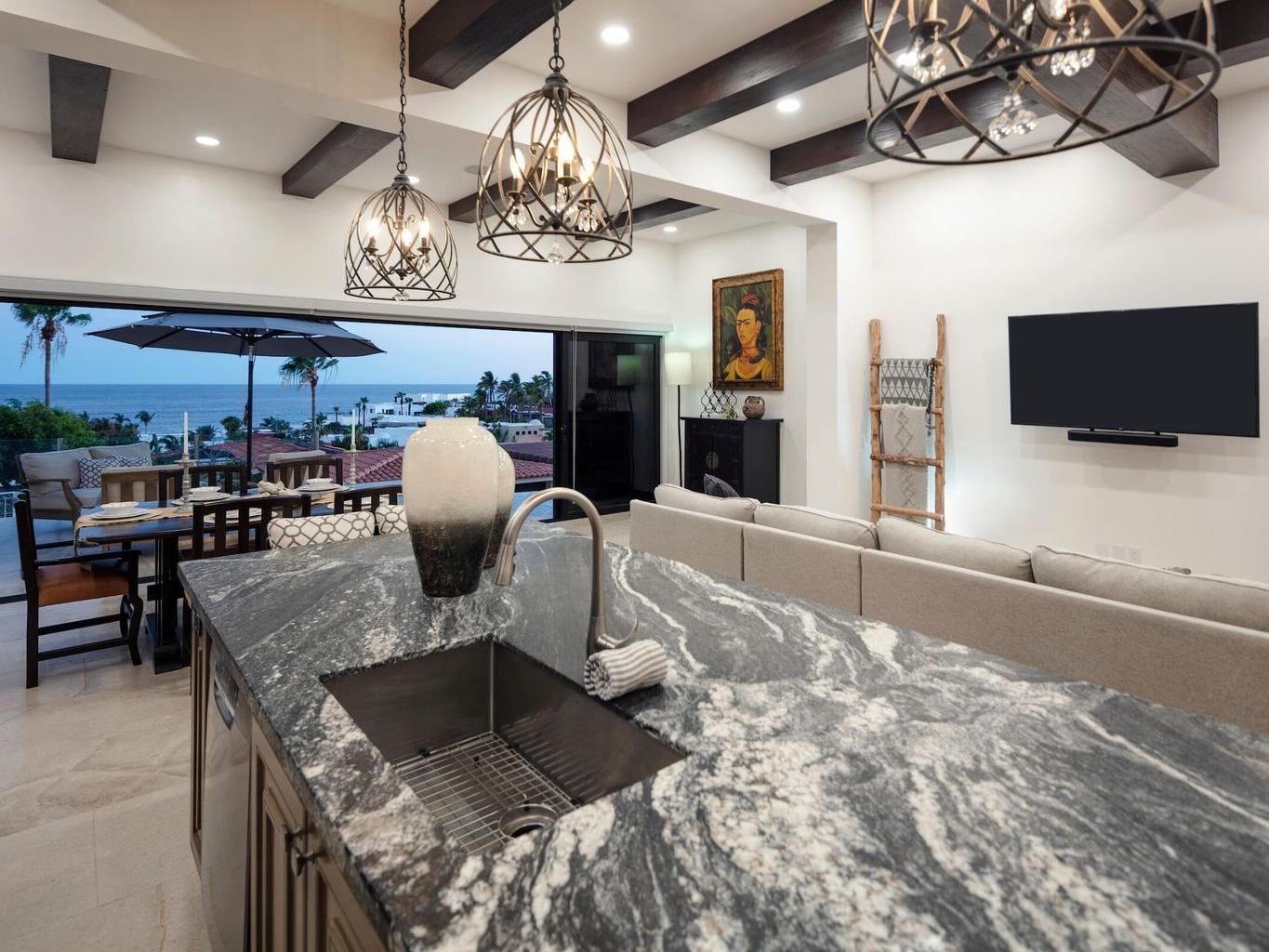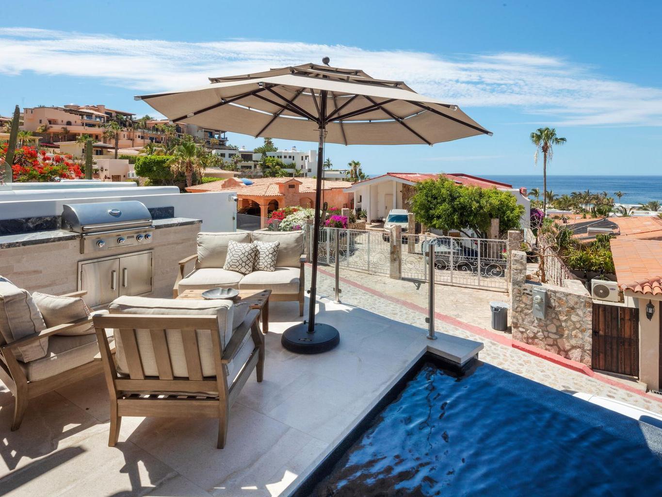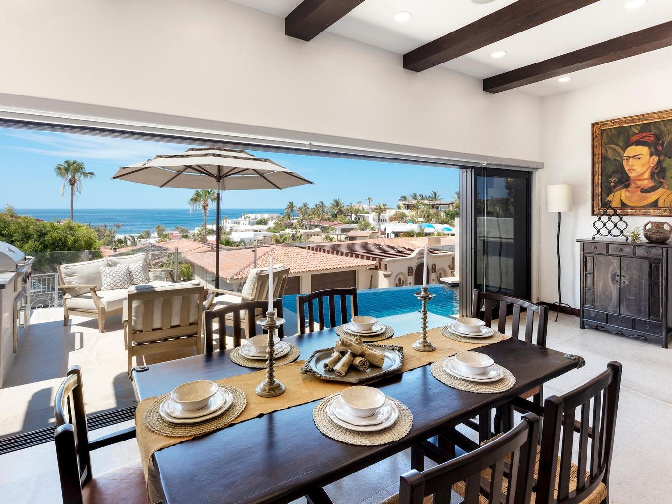 You are fortunate to have come across this exclusive Pedregal pacific side listing. This tremendous, 6-bedroom, 2021 reconstructed home is something to behold. Checking every box, Casa Tesoro provides: newly landscaped cactus garden with private pool and hot tub in rear of property, ocean view infinity plunge pool, 5 full ensuite bedrooms and fully appointed private access casita, state of the art Viking/Sub Zero and Bosch appliances, custom designed cabinets and leathered granite countertops, attached garage plus additional outside private parking, gated/guarded close-knit community, two minute walking distance to the private Pedregal beach, walking distance to pickle ball/basketball court, bocce ball court and gazebo, and A BREATHTAKING 180 DEGREE OCEAN VIEW!! Check-check-check!