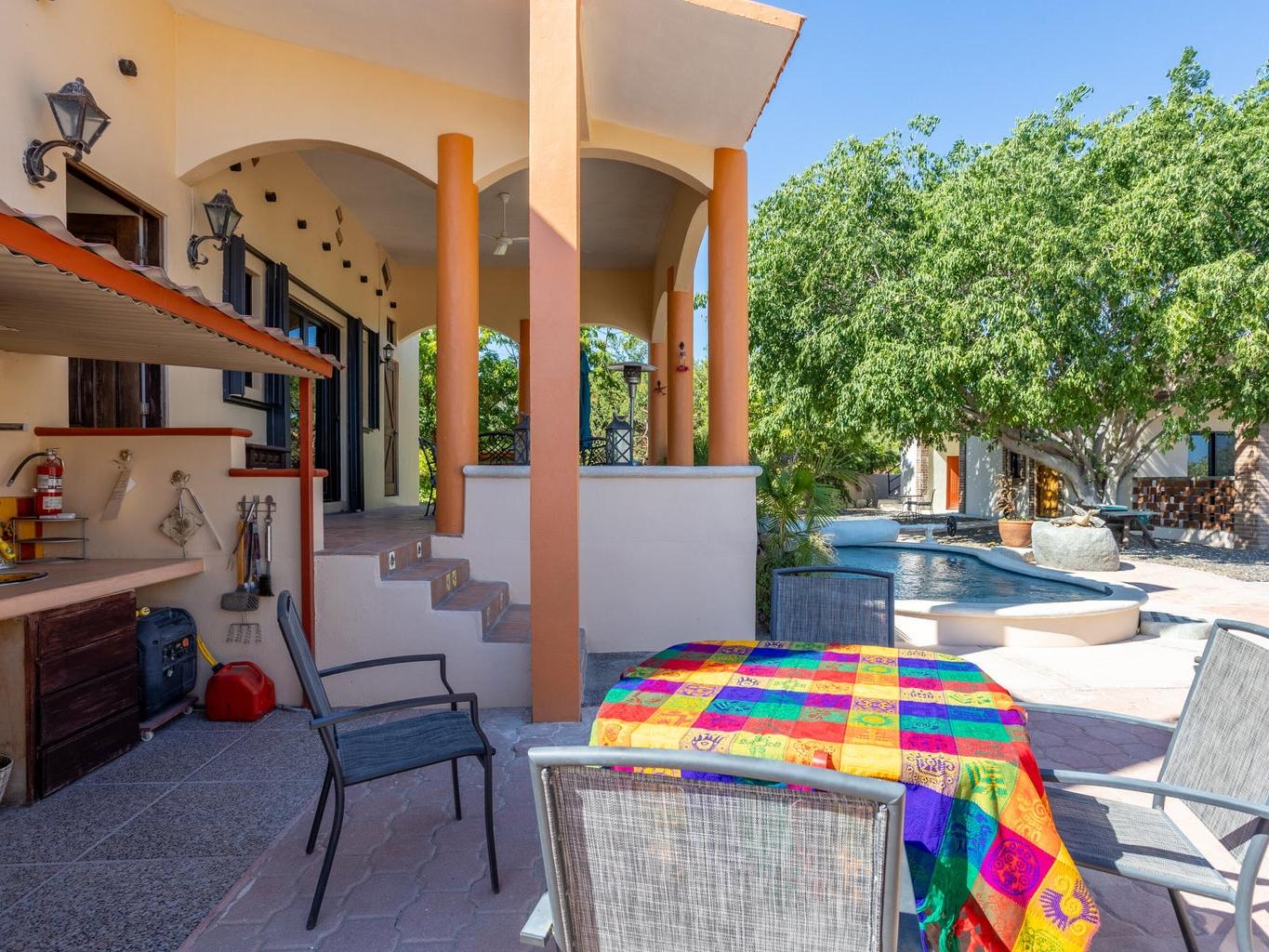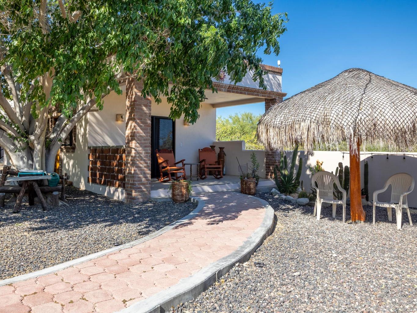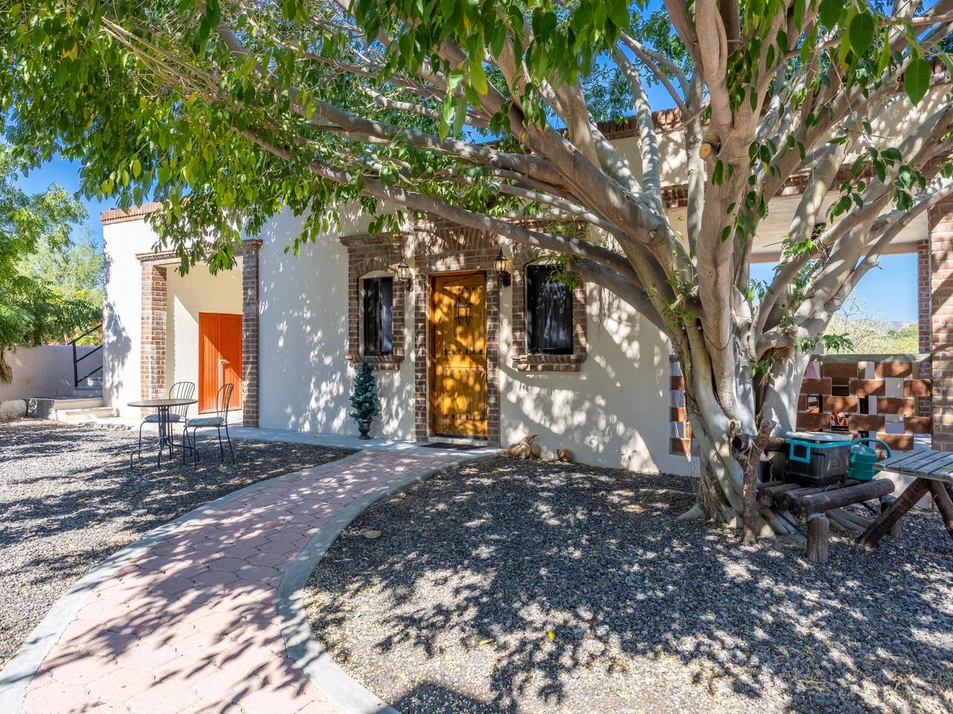 Casa Fenix is a thoughtfully designed property just a mile from downtown Los Barriles, offering privacy, comfort, and convenience. The main home features one spacious bedroom and an additional flex space with a full bathroom that can serve as a guest room or office. The open-concept living area and kitchen are filled with natural light, featuring custom wood cabinetry, a breakfast bar, and stainless-steel appliances.
