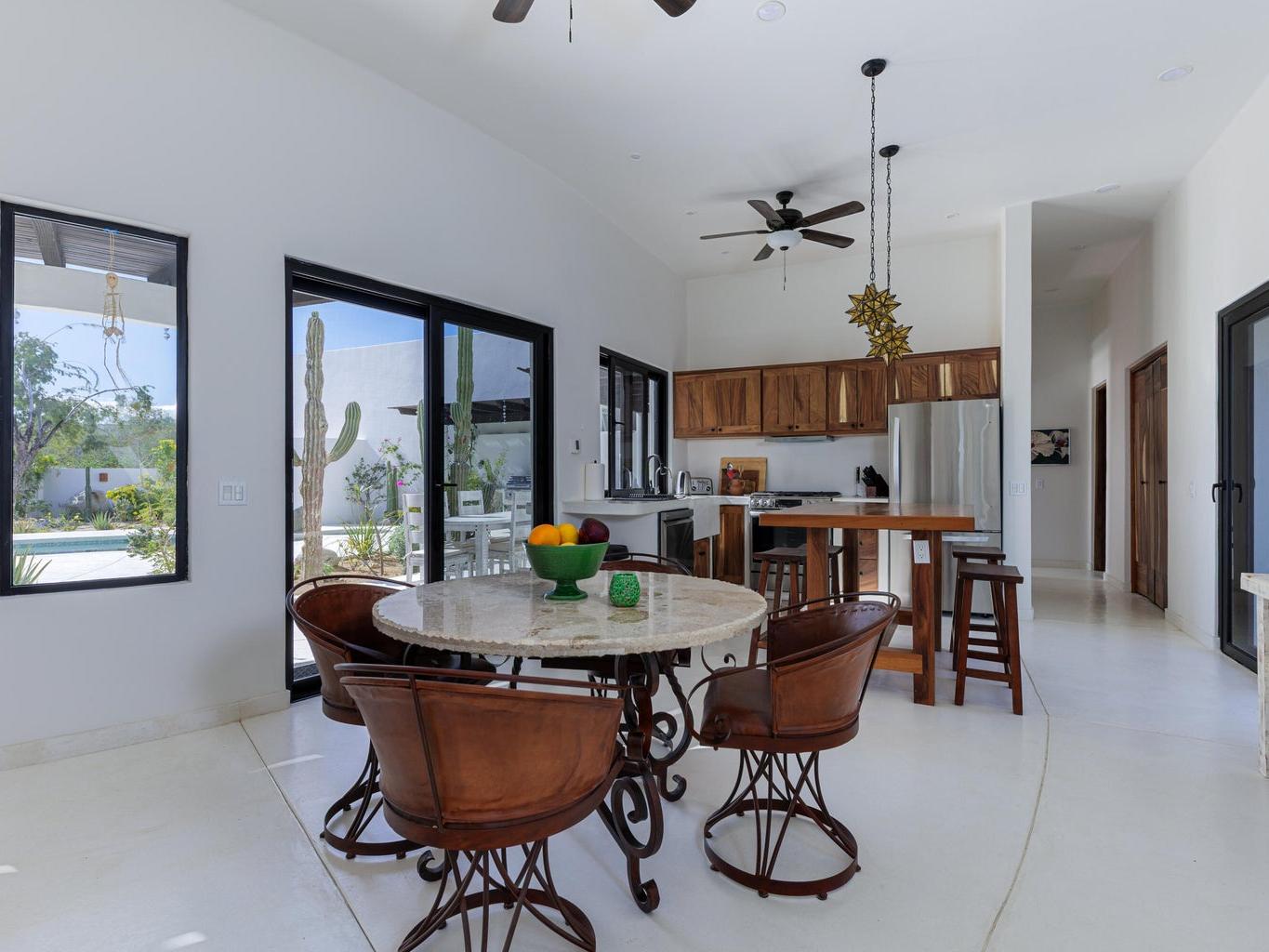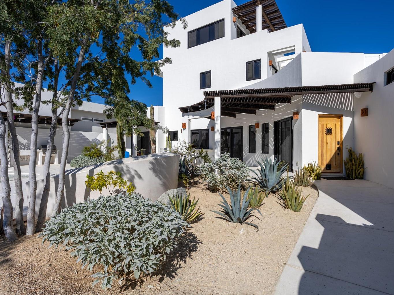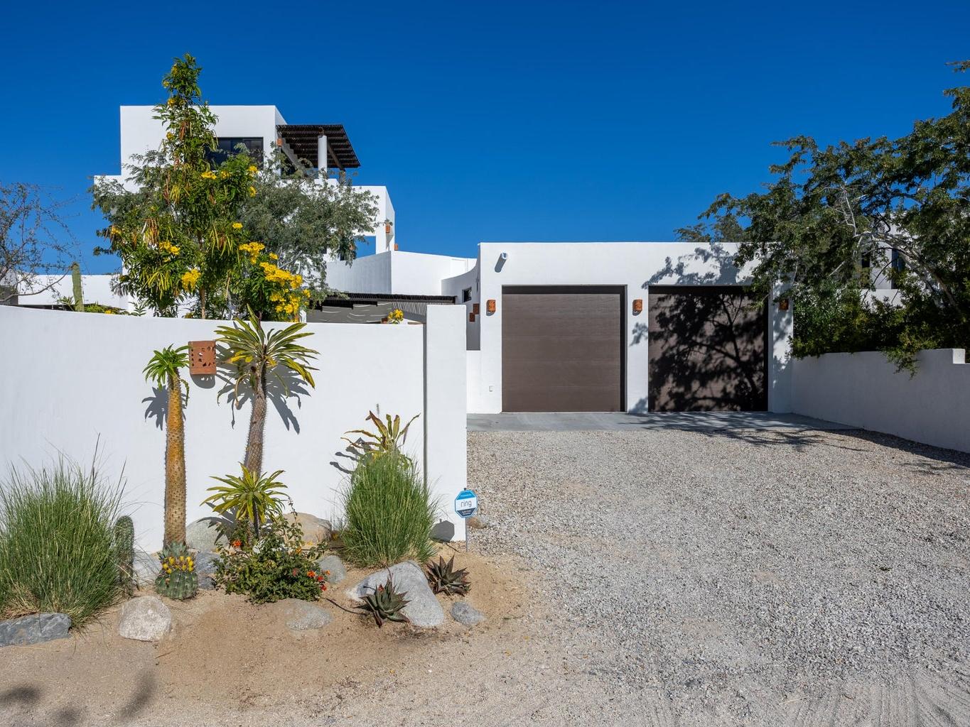 Modern newer build 3 bedroom, 2 bath home with a bonus room and a 2 car garage just minutes north of downtown Los Barriles. Located on a quiet cul de sac with a gated entry. This home has many new upgrades including a huge 3rd story bonus room with incredible views of the ocean to the east and mountain views to the west. Perfect for an art studio, office or gym/yoga room. Just outside the bonus room, is a covered deck to enjoy the spectacular views of the Sea of Cortez. Beautiful upper kitchen parota custom cabinets, Solar with battery backup. Full house water filtration system that includes a reverse osmosis remineralization system under the kitchen sink for drinking water. Oversized 2 car garage to store your vehicles and everything you need for your active Baja lifestyle. Meticulously