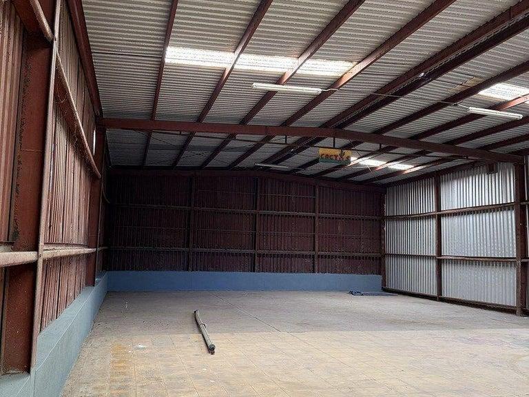 Warehouse for sale with two-story office space, metal structure, 2,500-liter cistern, bathroom, and metal gate. Located on a paved street with easy access. Dimensions: 4.684 m high, 10.578 m wide, and 18.86 m deep.