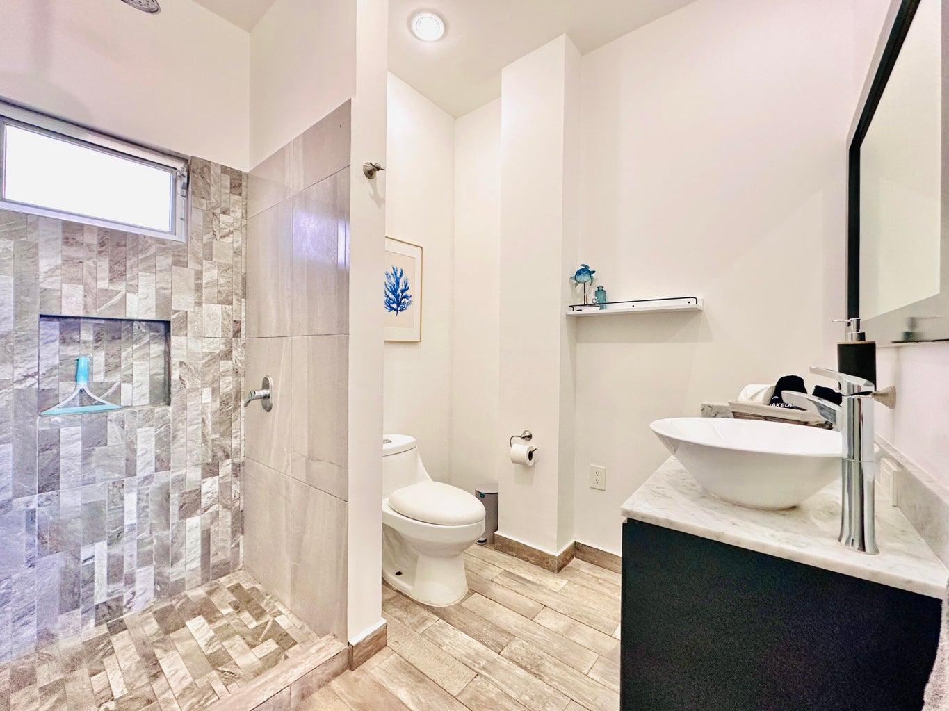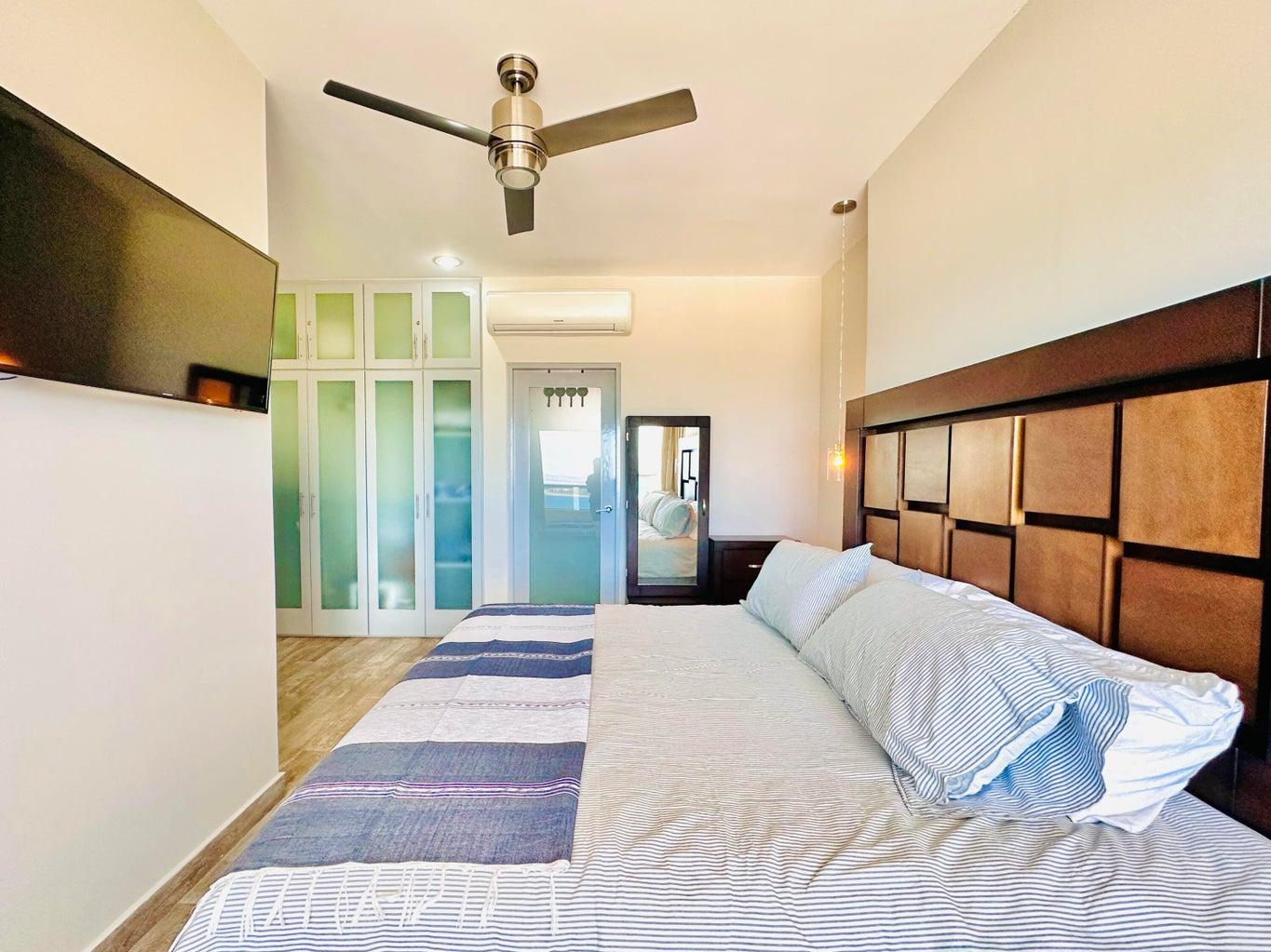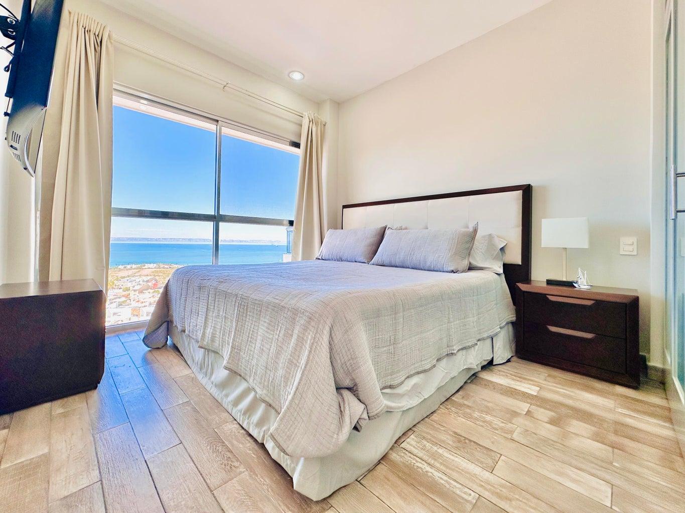 The spacious primary suite features a private balcony overlooking the Sea of Cortez. The second and third bedrooms each offer their own en-suite bathrooms and ocean views, providing privacy and comfort for family and guests.