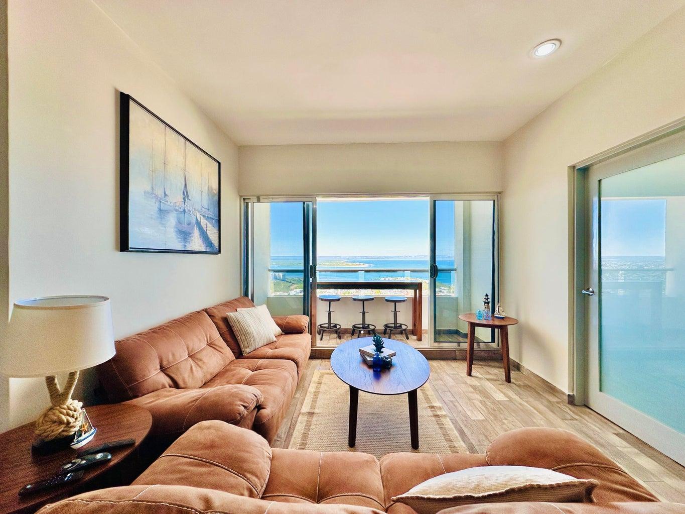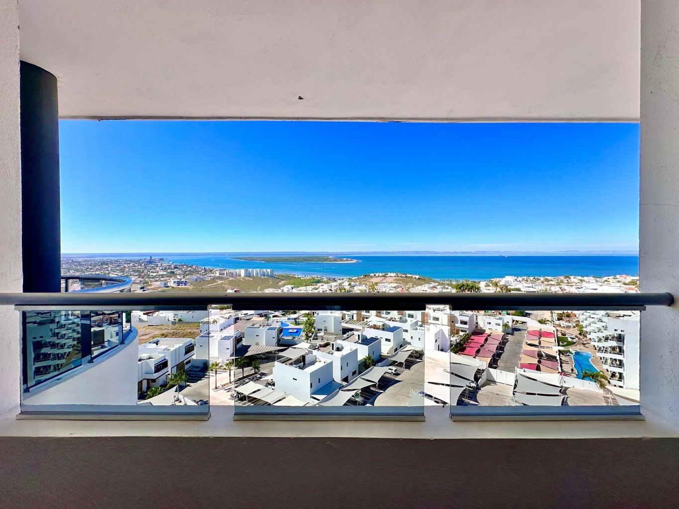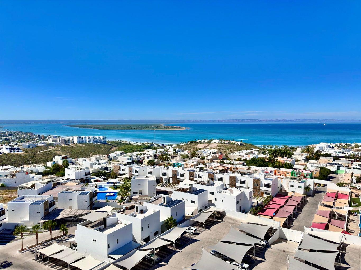 The open-concept living area flows seamlessly onto a private terrace/balcony, creating an ideal indoor-outdoor space to enjoy La Paz's iconic sunsets.