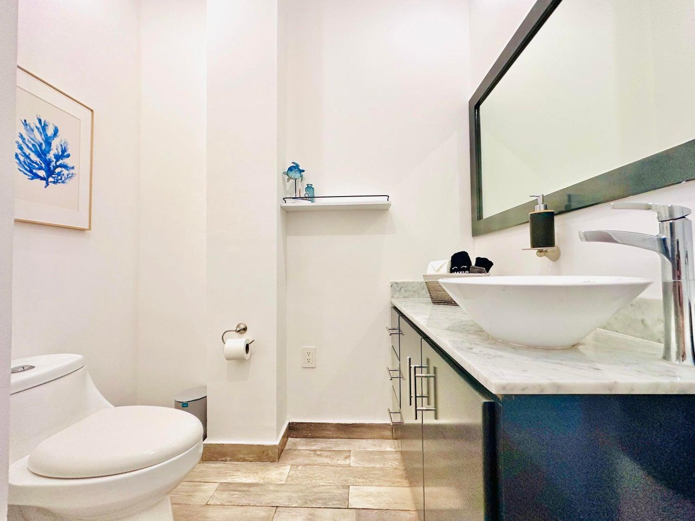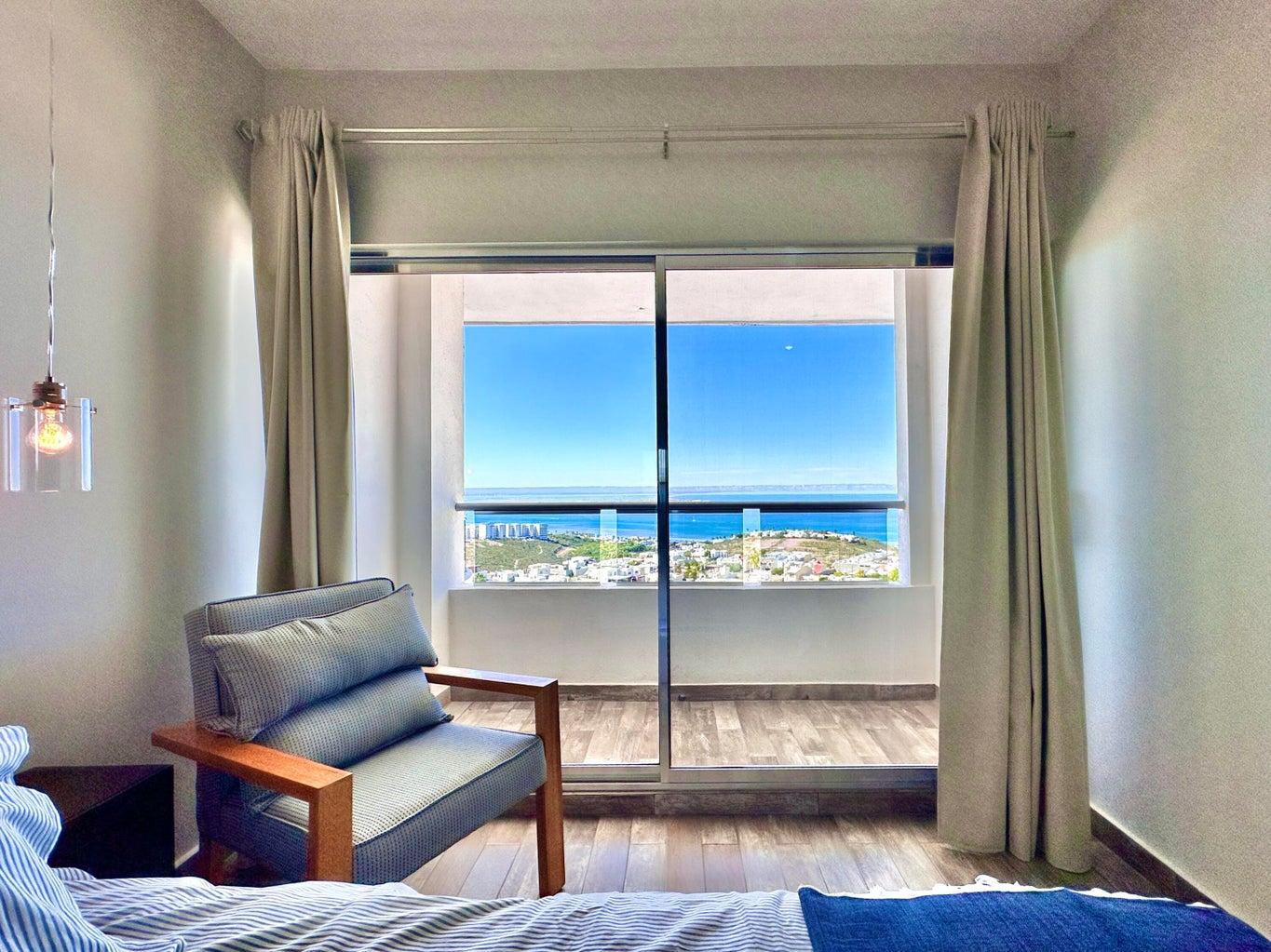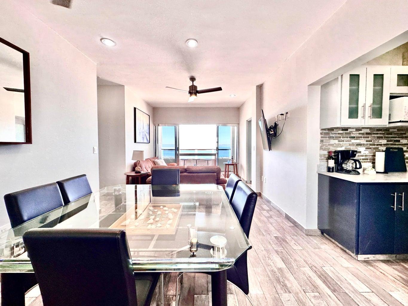 The open-concept living area flows seamlessly onto a private terrace/balcony, creating an ideal indoor-outdoor space to enjoy La Paz's iconic sunsets.