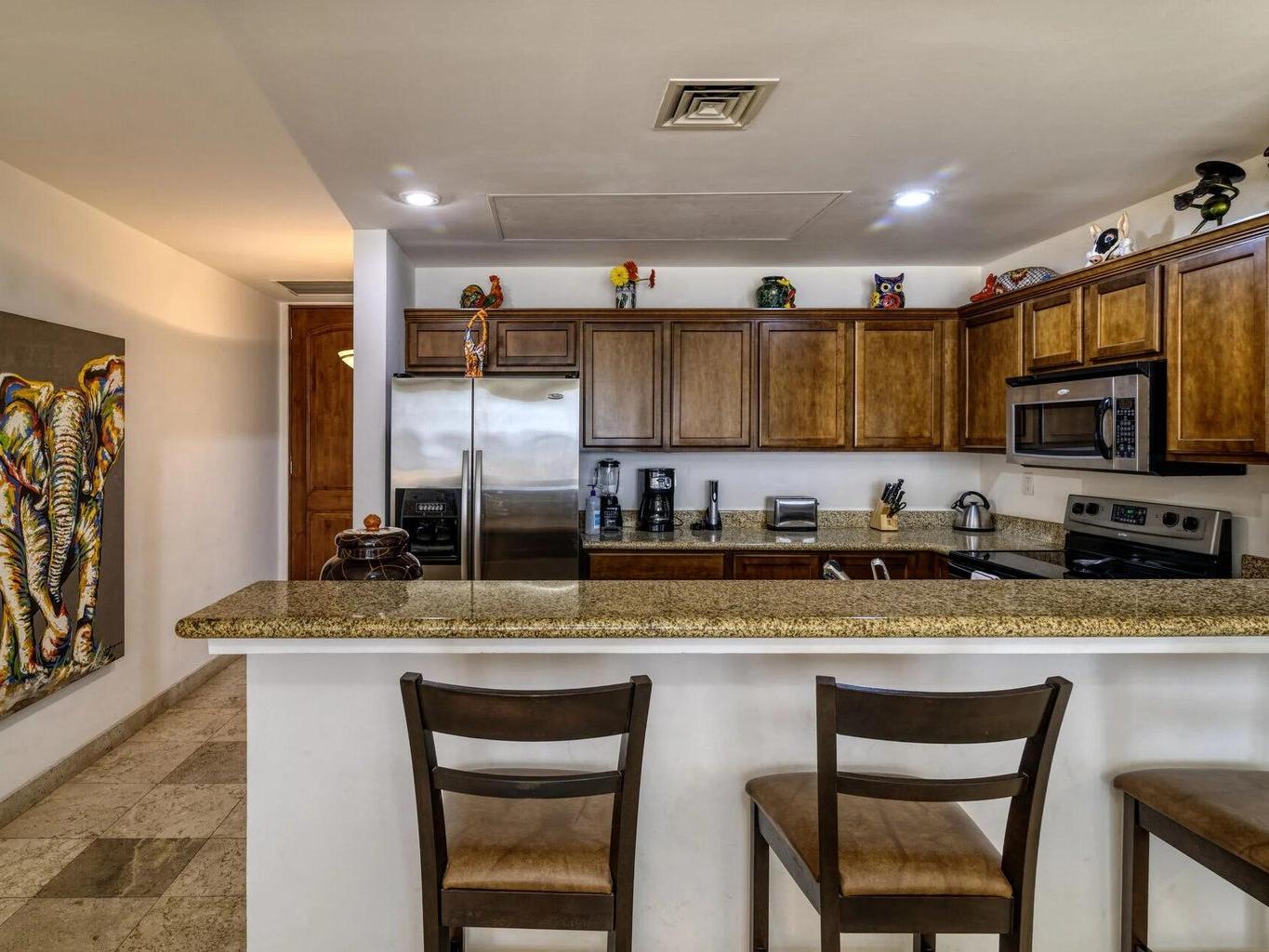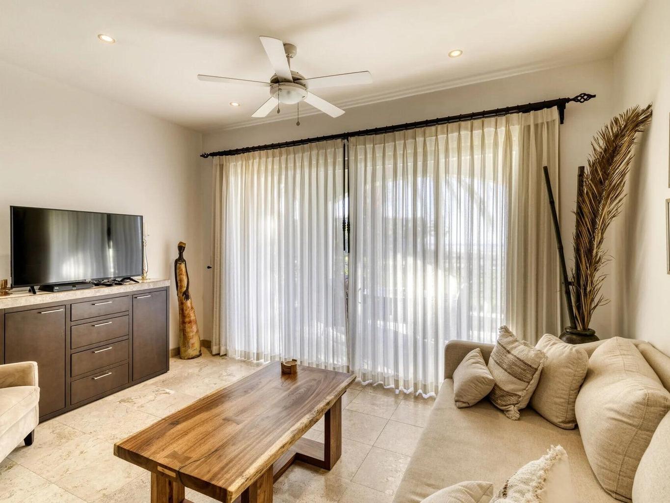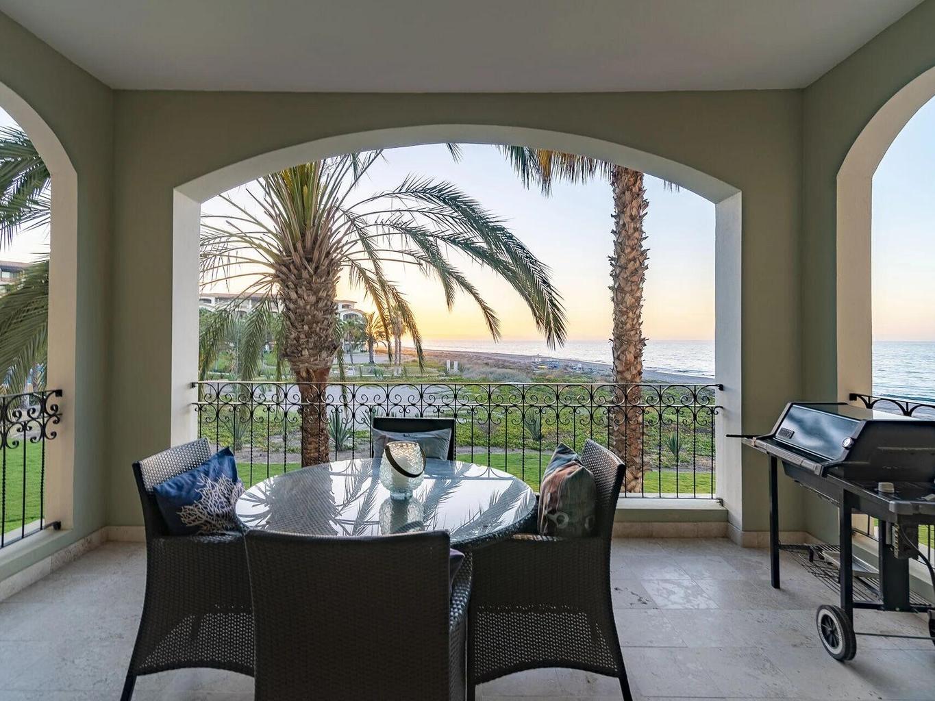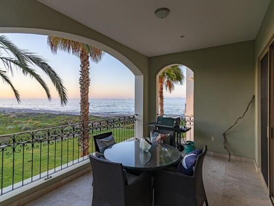Second-story beach front condominium at Paraiso del Mar community, featuring ocean, palm, and sunset views. Open-concept layout with polished stone floors and wood accents throughout. Kitchen offers marble countertops, oak cabinetry, breakfast bar, and high-end appliances. Dining and living areas flow seamlessly to an expansive deck.
