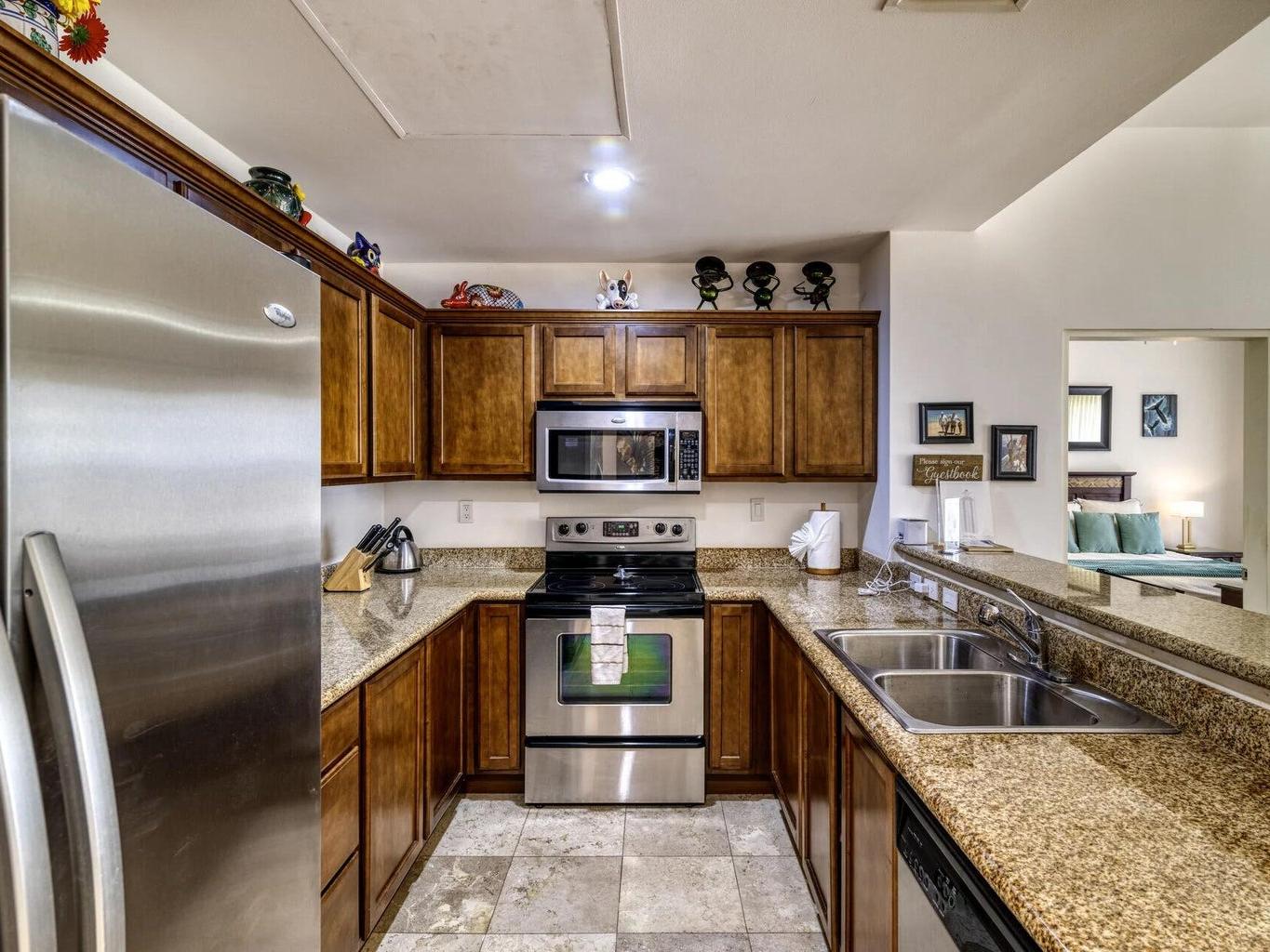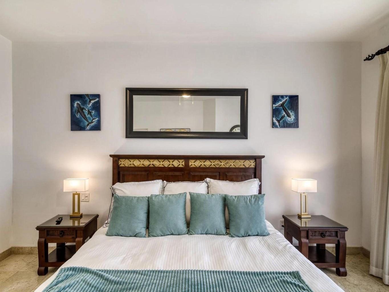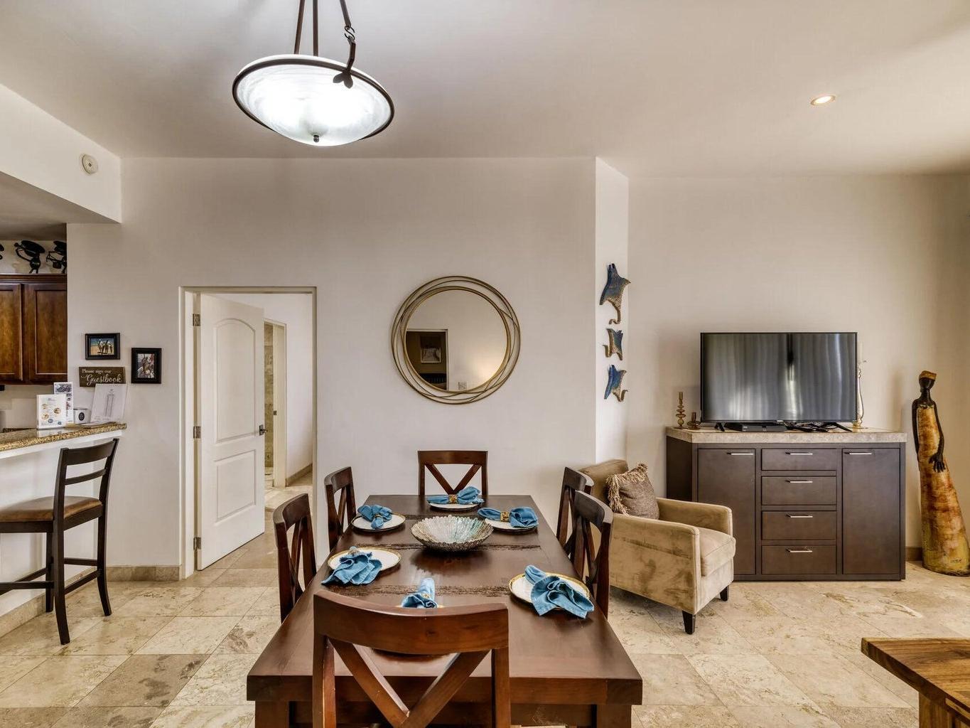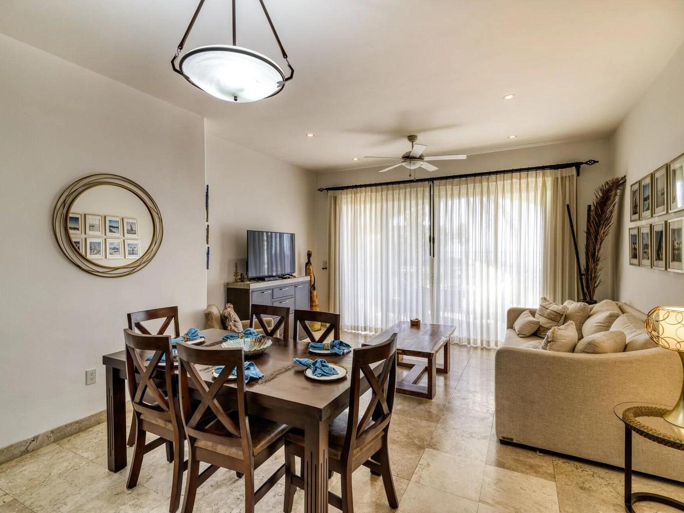 Second-story beach front condominium at Paraiso del Mar community, featuring ocean, palm, and sunset views. Open-concept layout with polished stone floors and wood accents throughout. Kitchen offers marble countertops, oak cabinetry, breakfast bar, and high-end appliances. Dining and living areas flow seamlessly to an expansive deck.