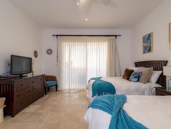 Primary suite includes king bed, workspace, entertainment center, and en-suite bath with double marble vanity, glass-enclosed shower, and soaking tub. Guest bedroom offers two queen beds and private bath. Guest bathroom located off main corridor.
