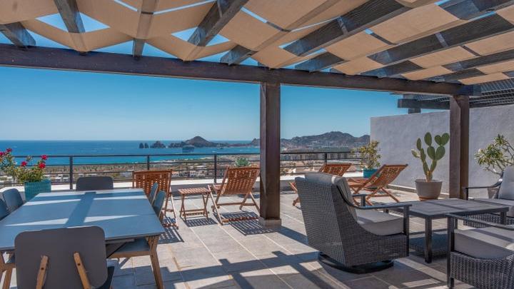 The open-concept kitchen, dining, and living areas are ideal for entertaining, seamlessly connecting indoor and outdoor spaces around the pool, BBQ area, and rooftop terrace. The ocean-view primary suite includes a walk-in closet and ensuite bath with dual sinks and a soaking tub overlooking the Sea of Cortez.