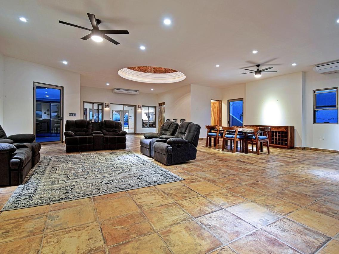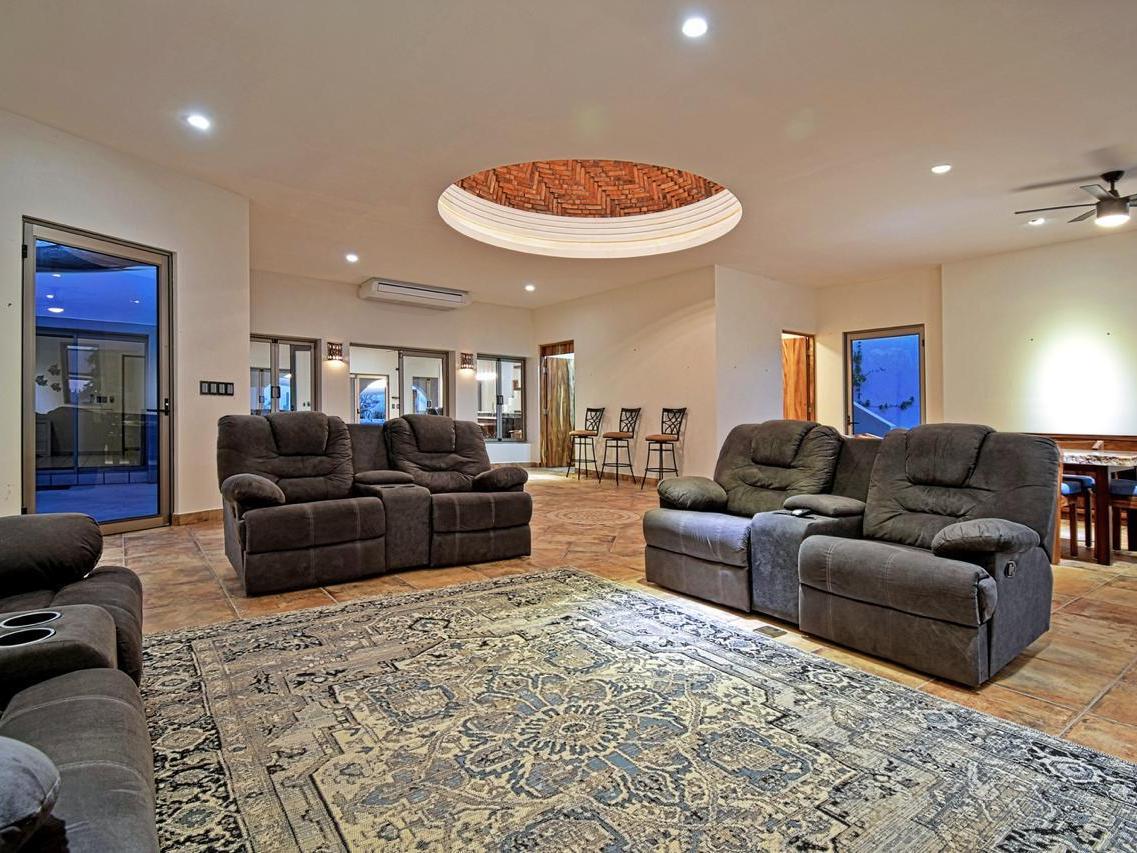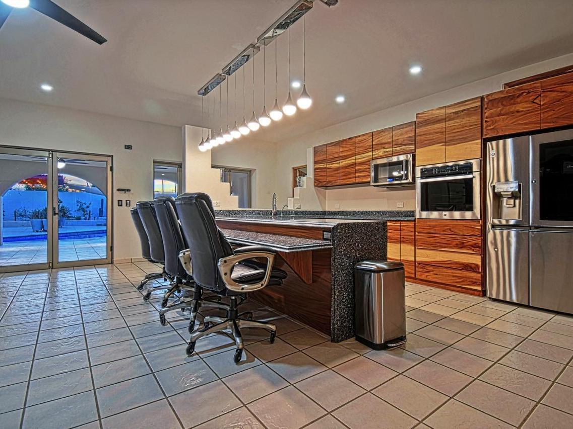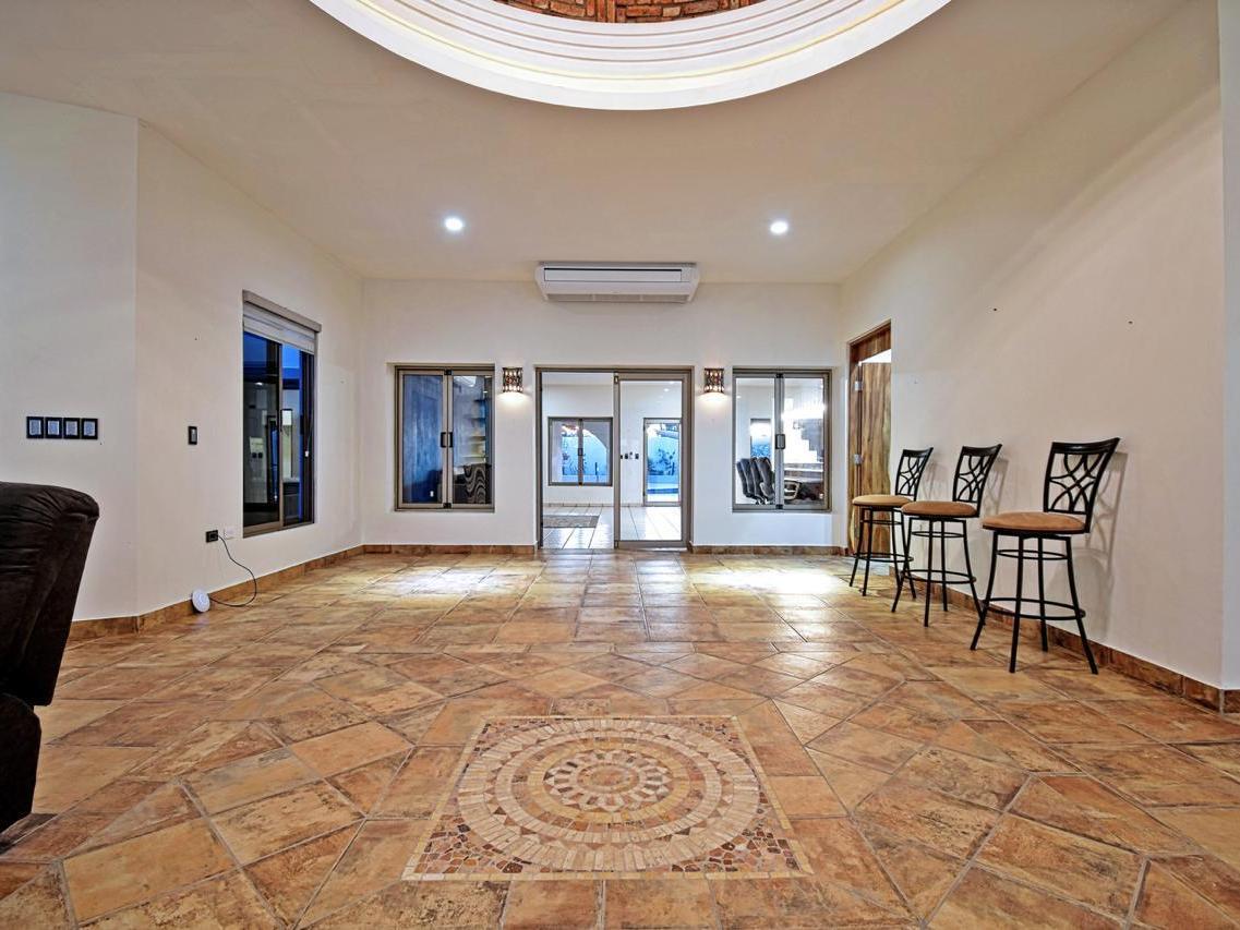 Includes a very large garage with high ceilings suitable for a boat or motorhome, 3 pergolas one in the front and two in the back. Rooftop terrace with palapa and Talavera-tiled cupola.