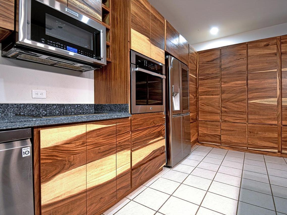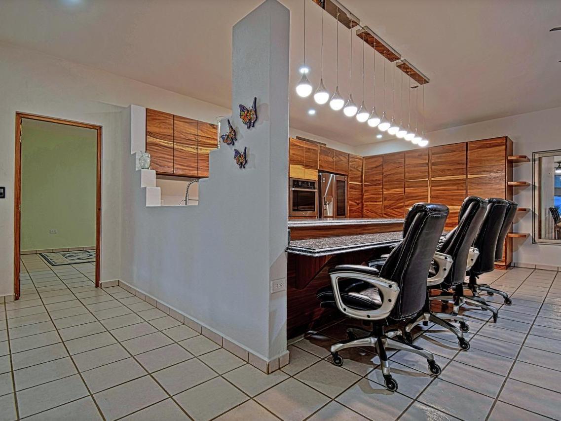 The home offers a large pool with courtyard, half bath for pool area, and a fully remodeled kitchen with Parota wood cabinets, granite countertops, and modern appliances. Open living and dining areas feature a handcrafted brick cupola and large windows with ocean views.